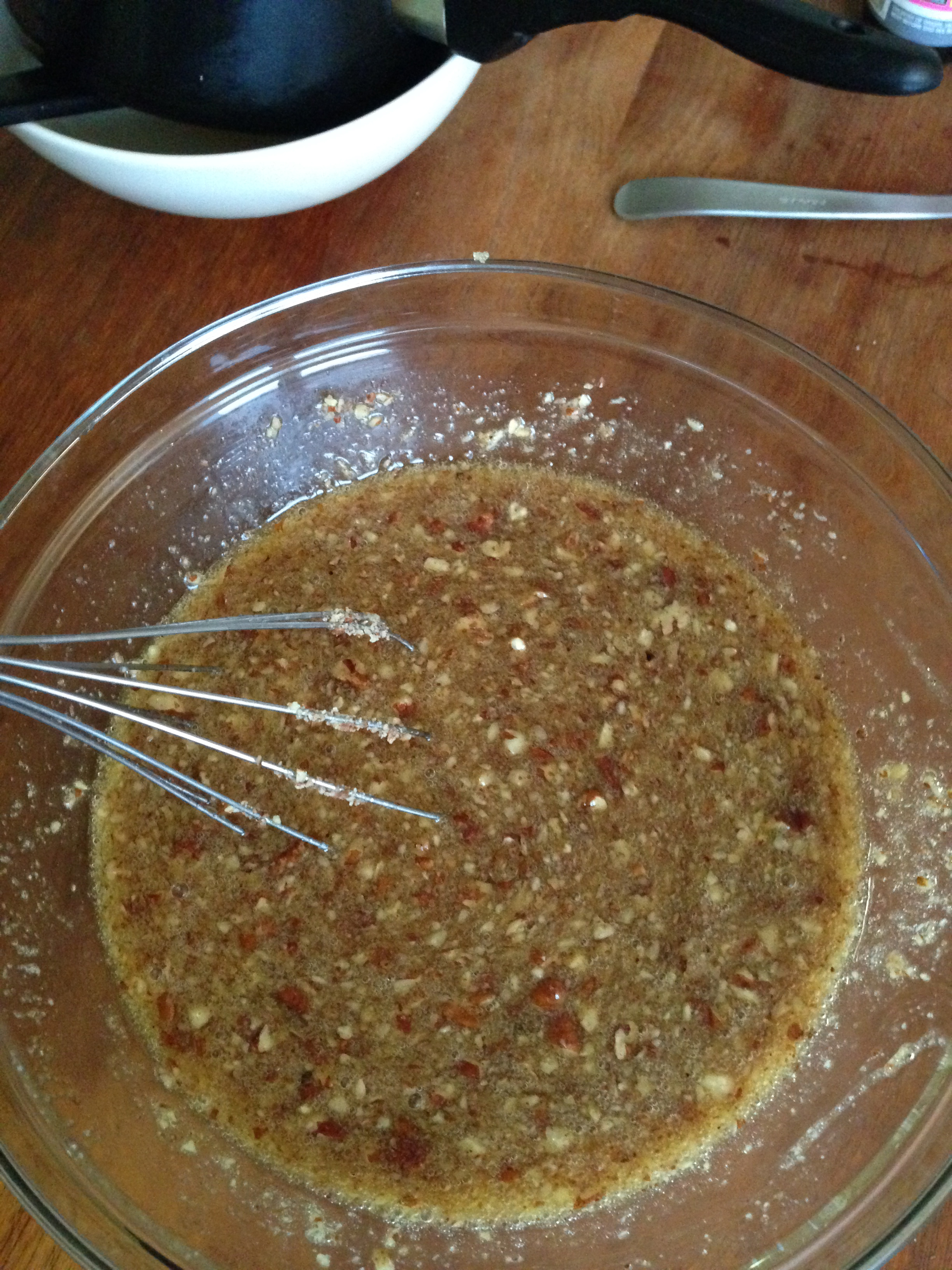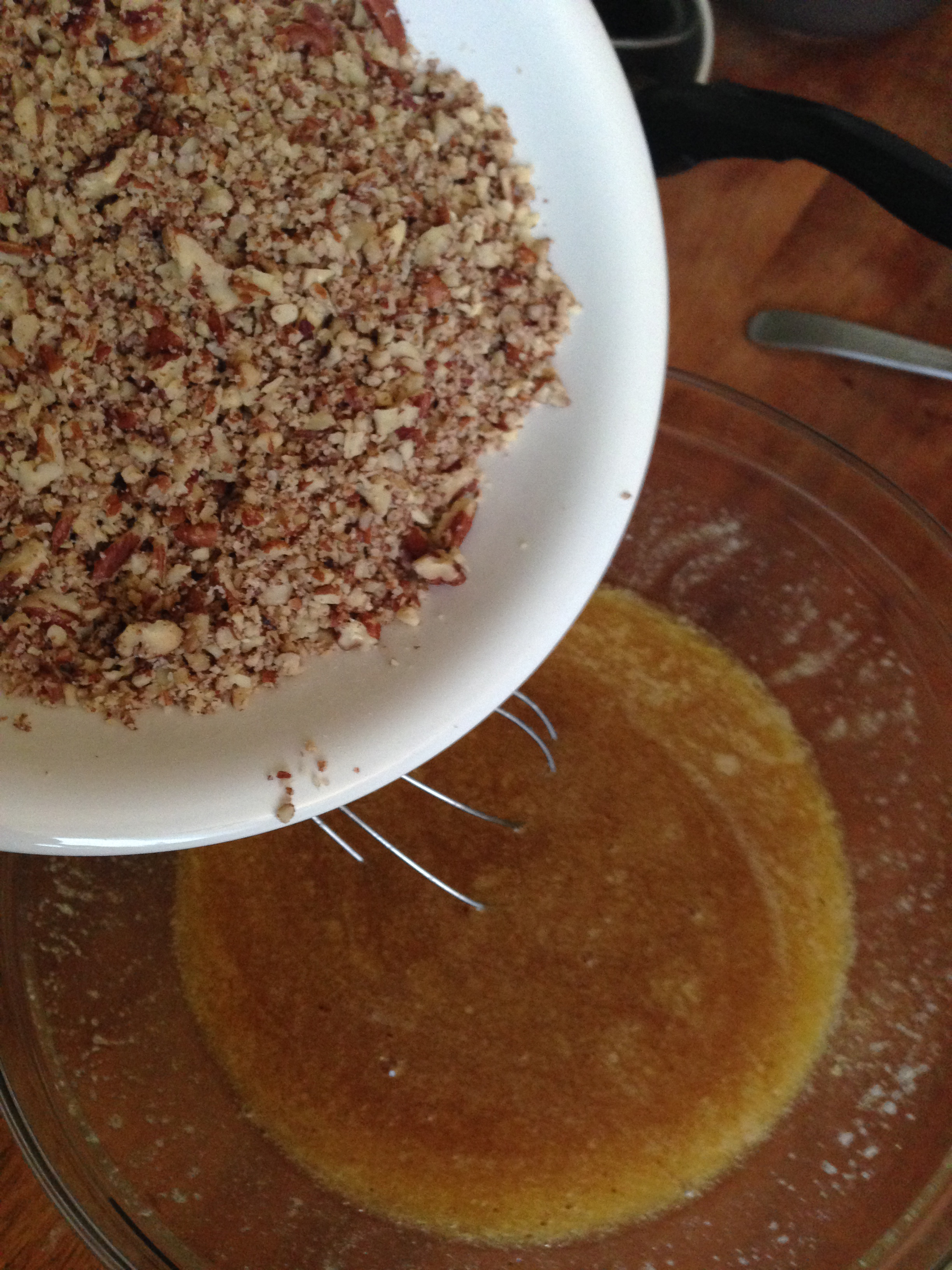 6. Add crushed pecans. Whisk or stir it a little and then pour the mixture onto the crust.