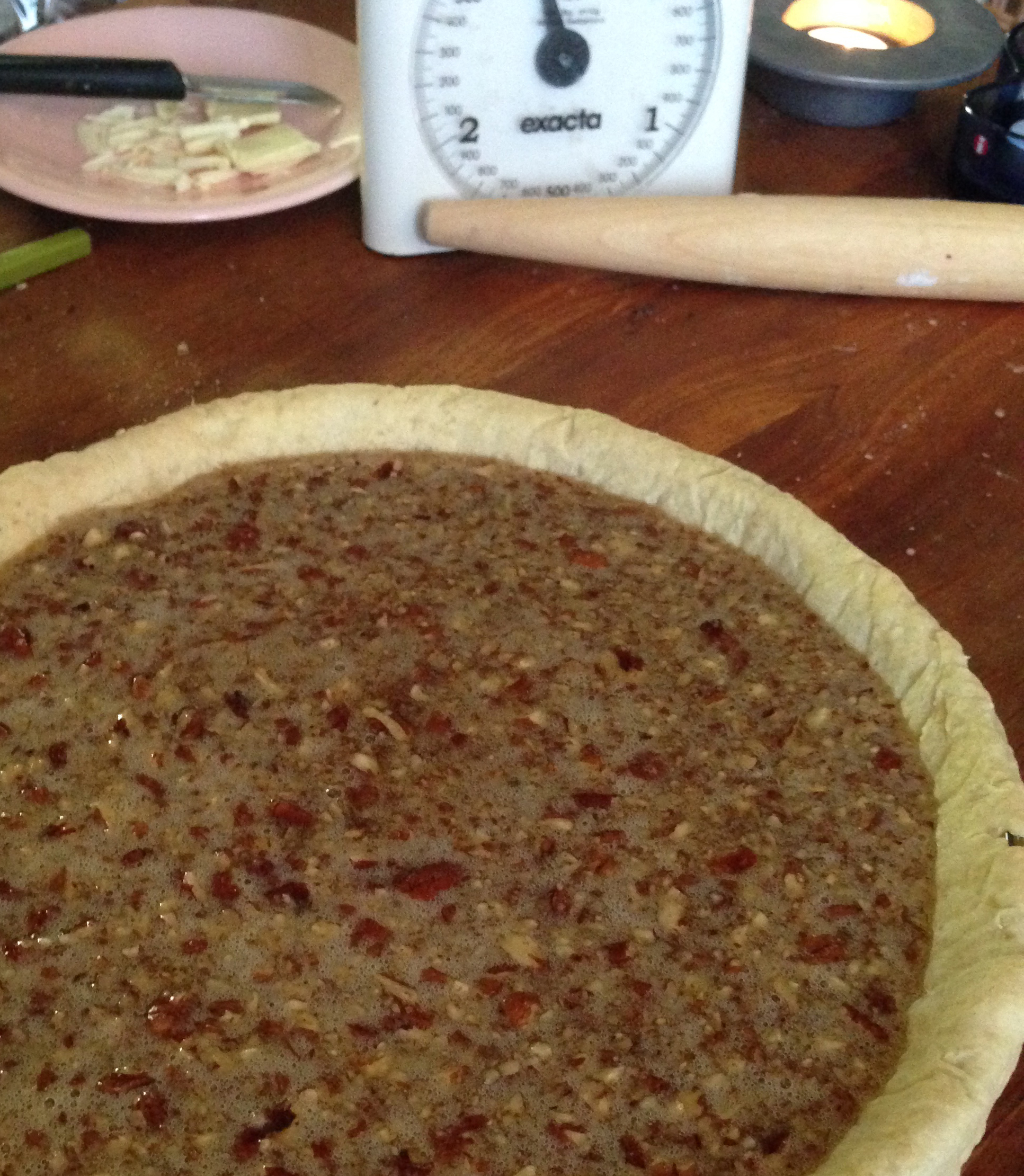 This pie has quite a good amount of sugar, syrup and butter, but it is not too sweet or too heavy. I was invited to a co-baking/dinner that day when I baked this, and my Finnish, Portuguese and Uruguayan friends loved it. I left the remaining there of course, and my Portuguese friend Hugo called me a few days later to tell how much they enjoyed the rest of the pie the next day.