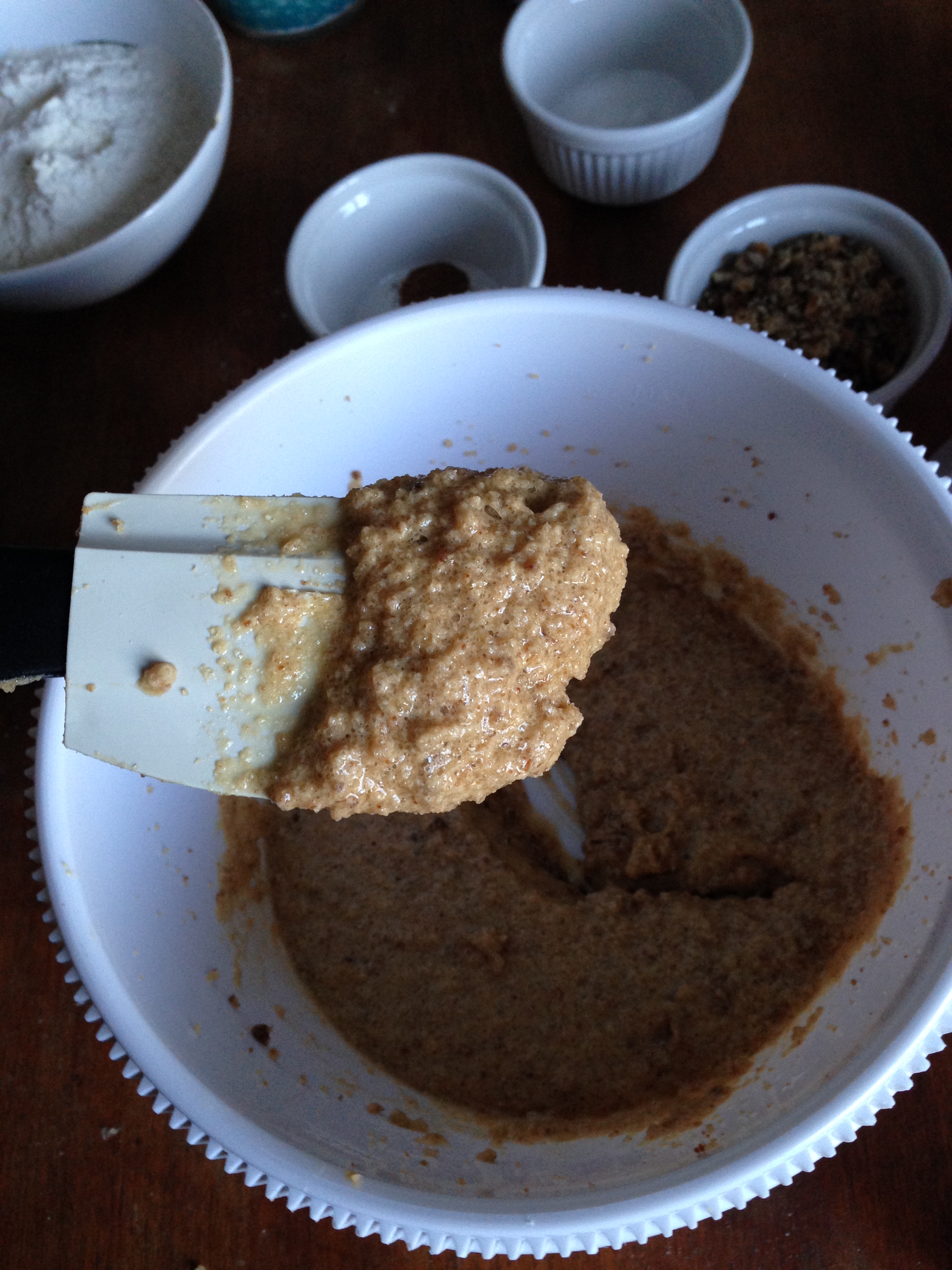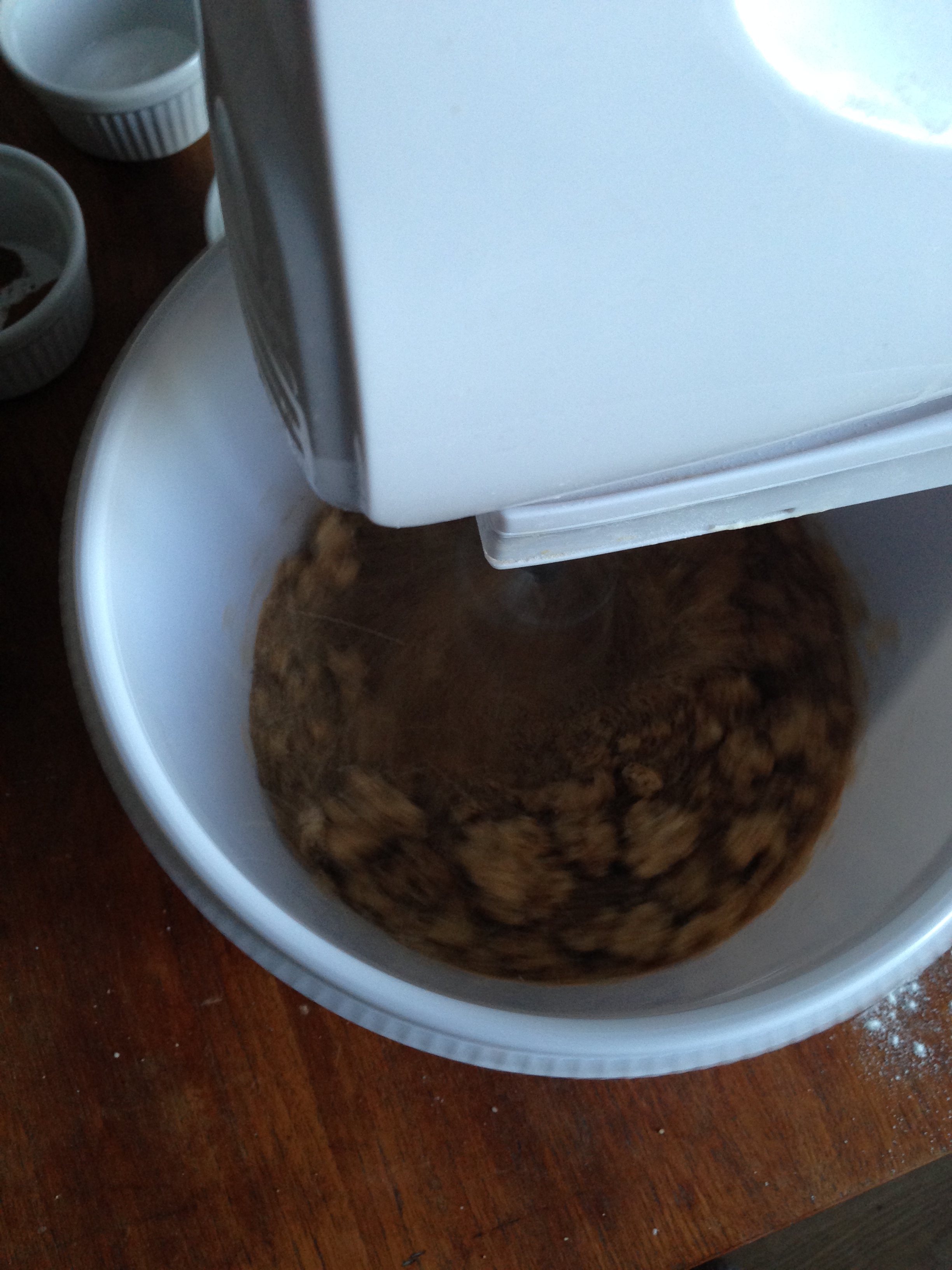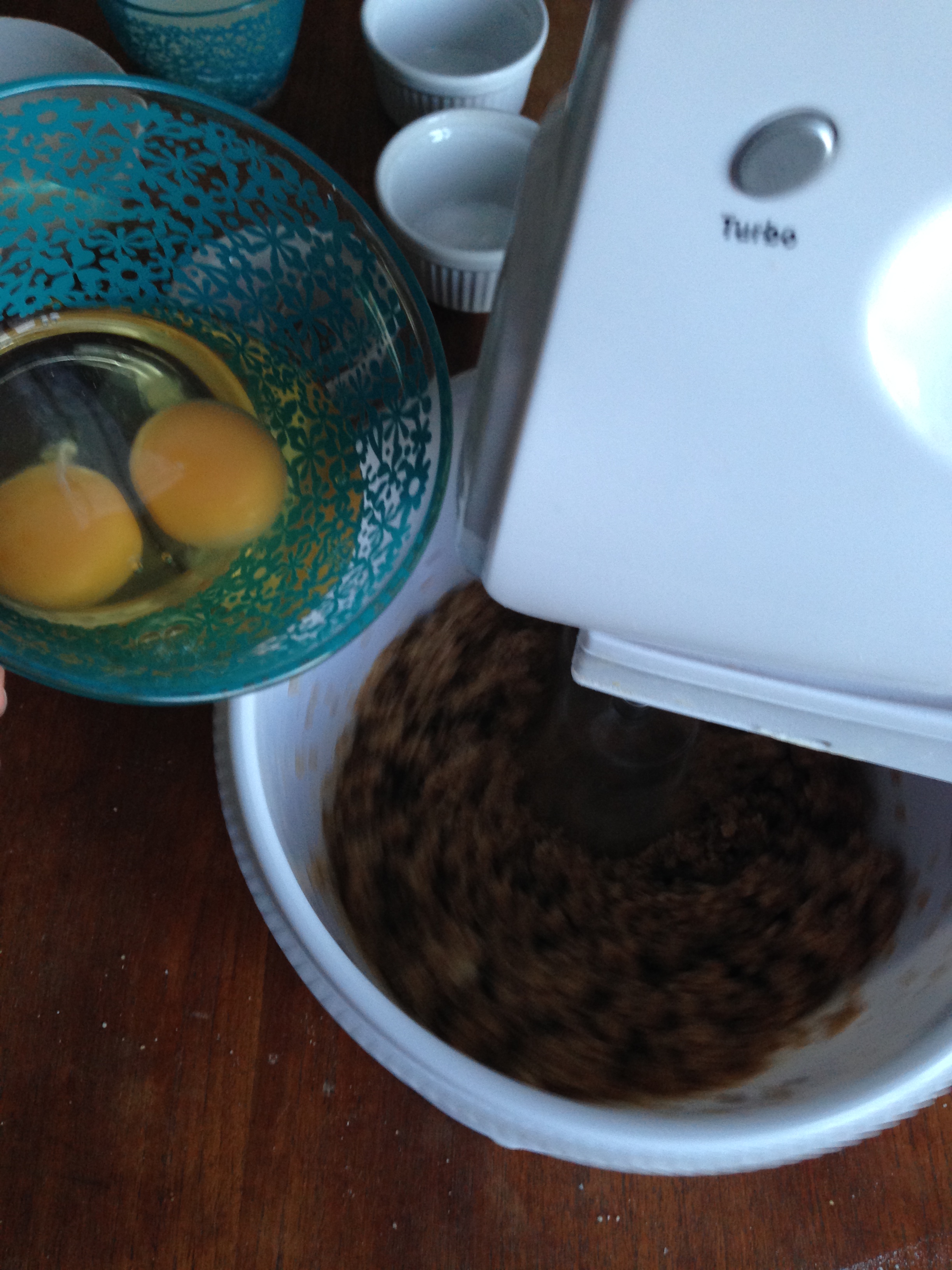 3. Add eggs to the mixture and continue beating until the eggs are fully incorporated. You will have a bit muddy mixture as seen in the picture below.