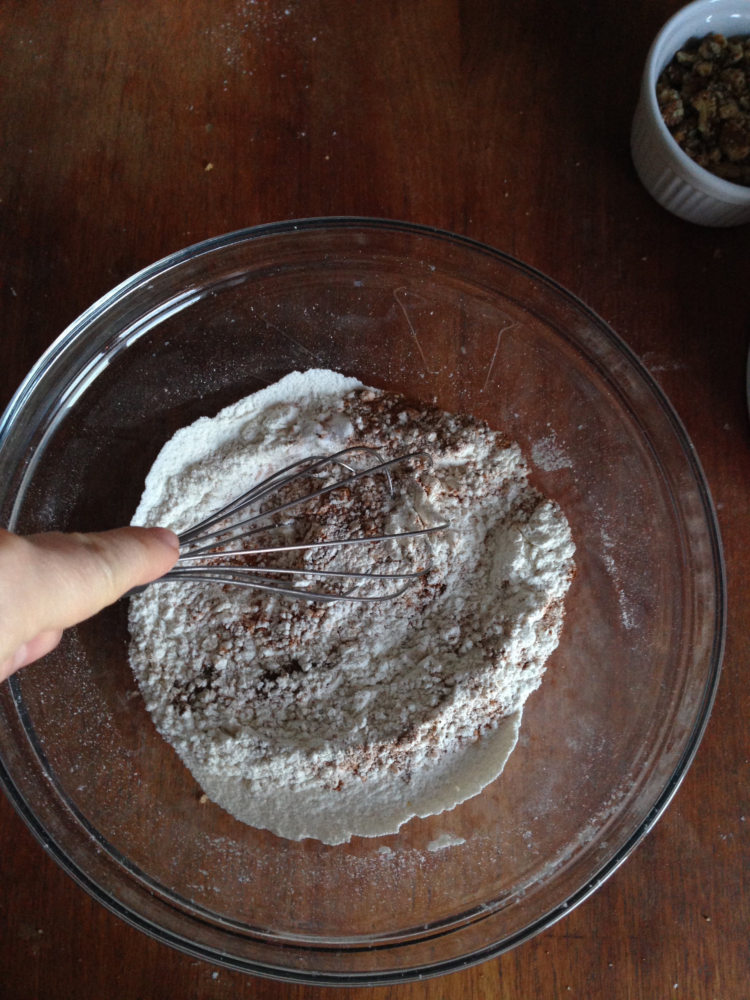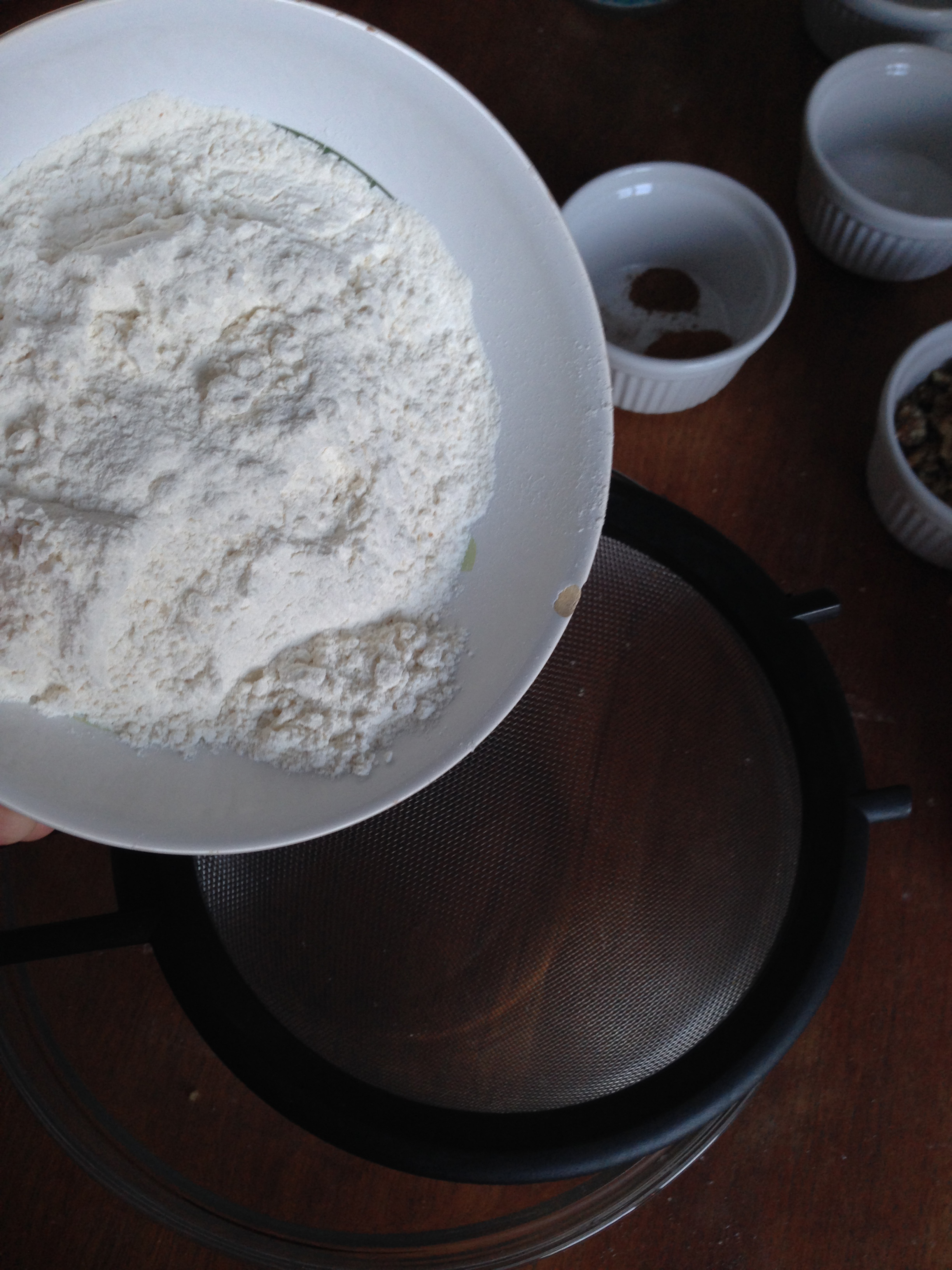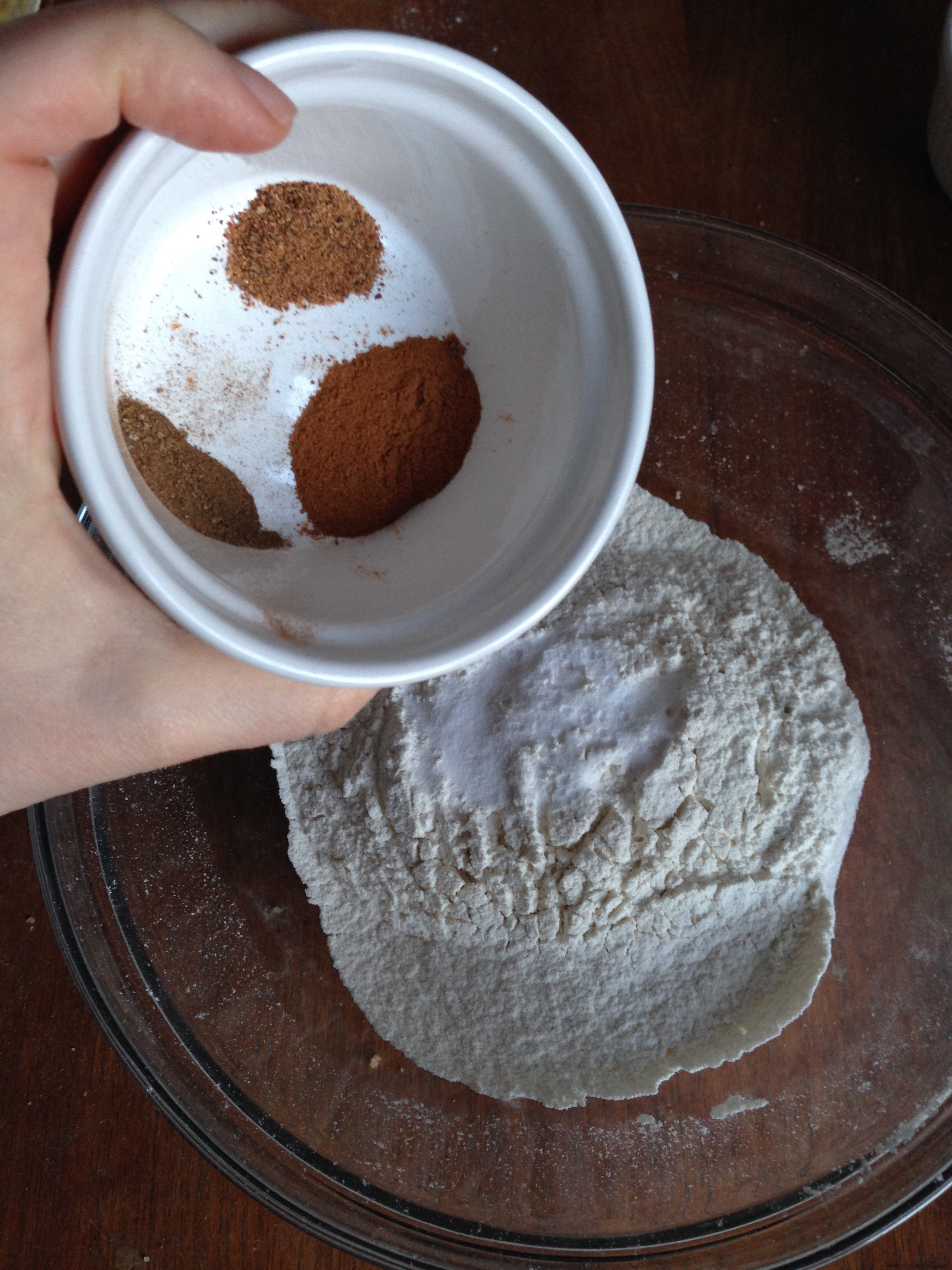 5. In another medium size bowl, sift flour. Add baking soda, salt and spices (cinnamon, nutmeg and allspice). Whisk these dry ingredients for half a minute.