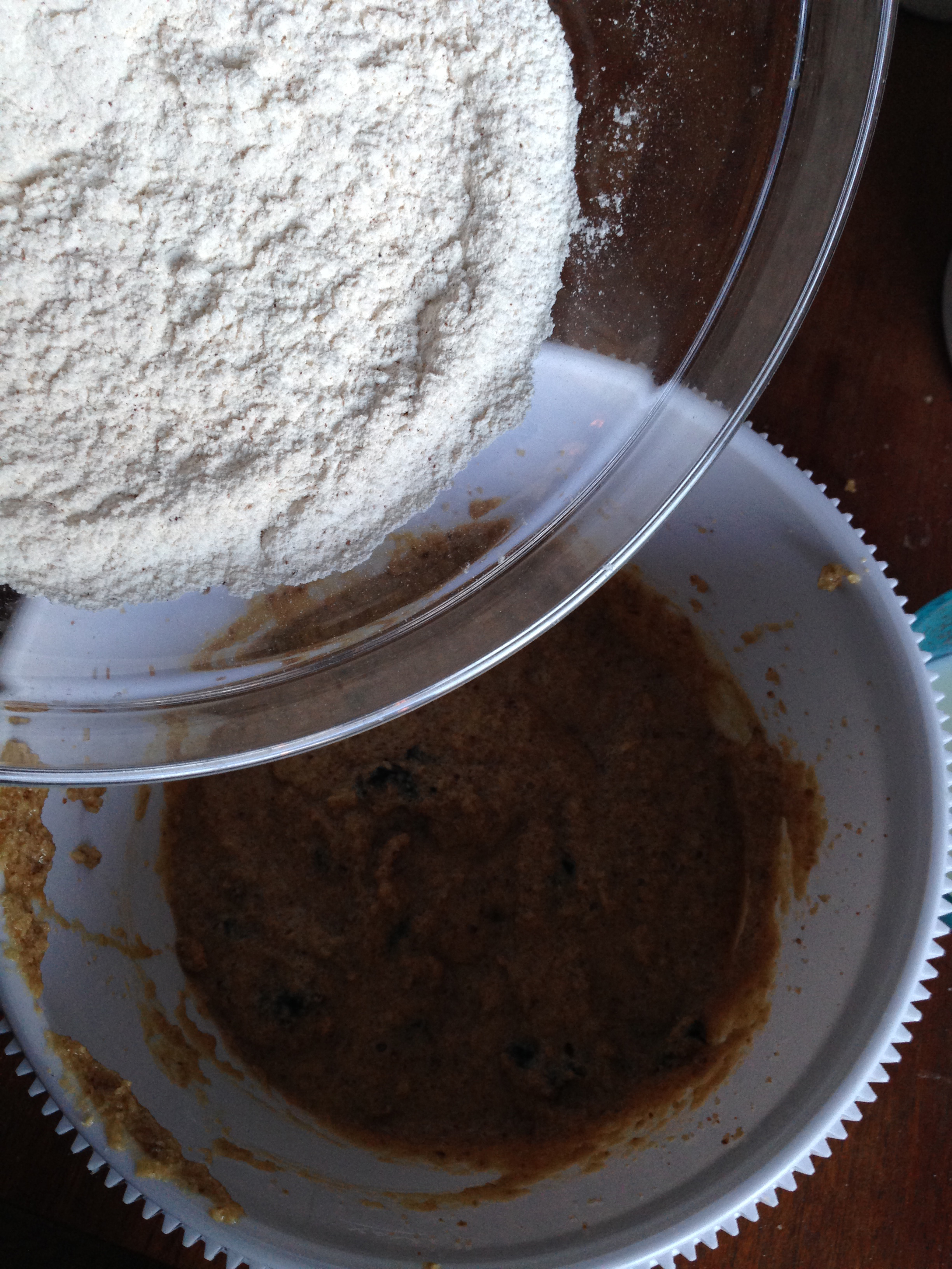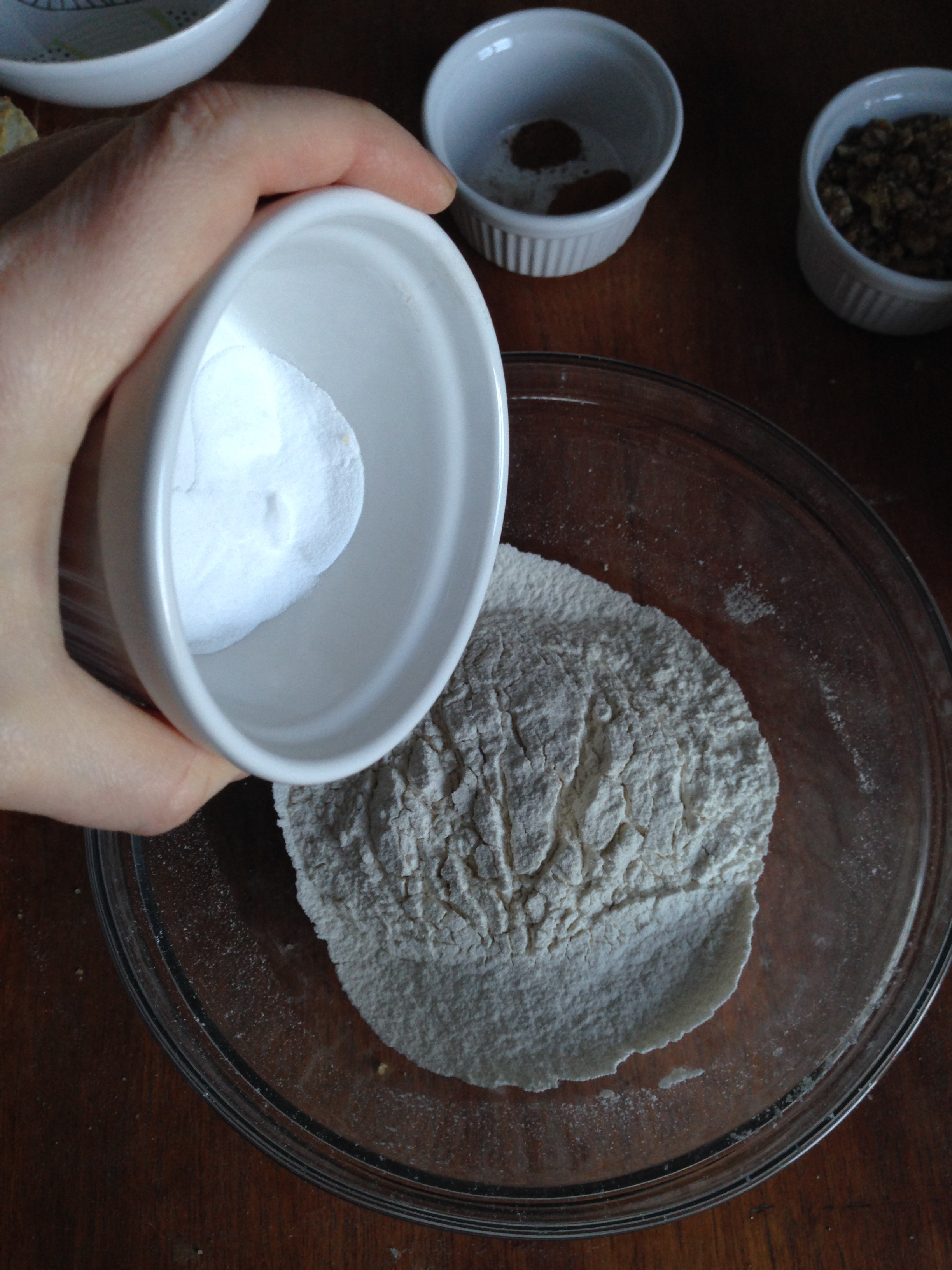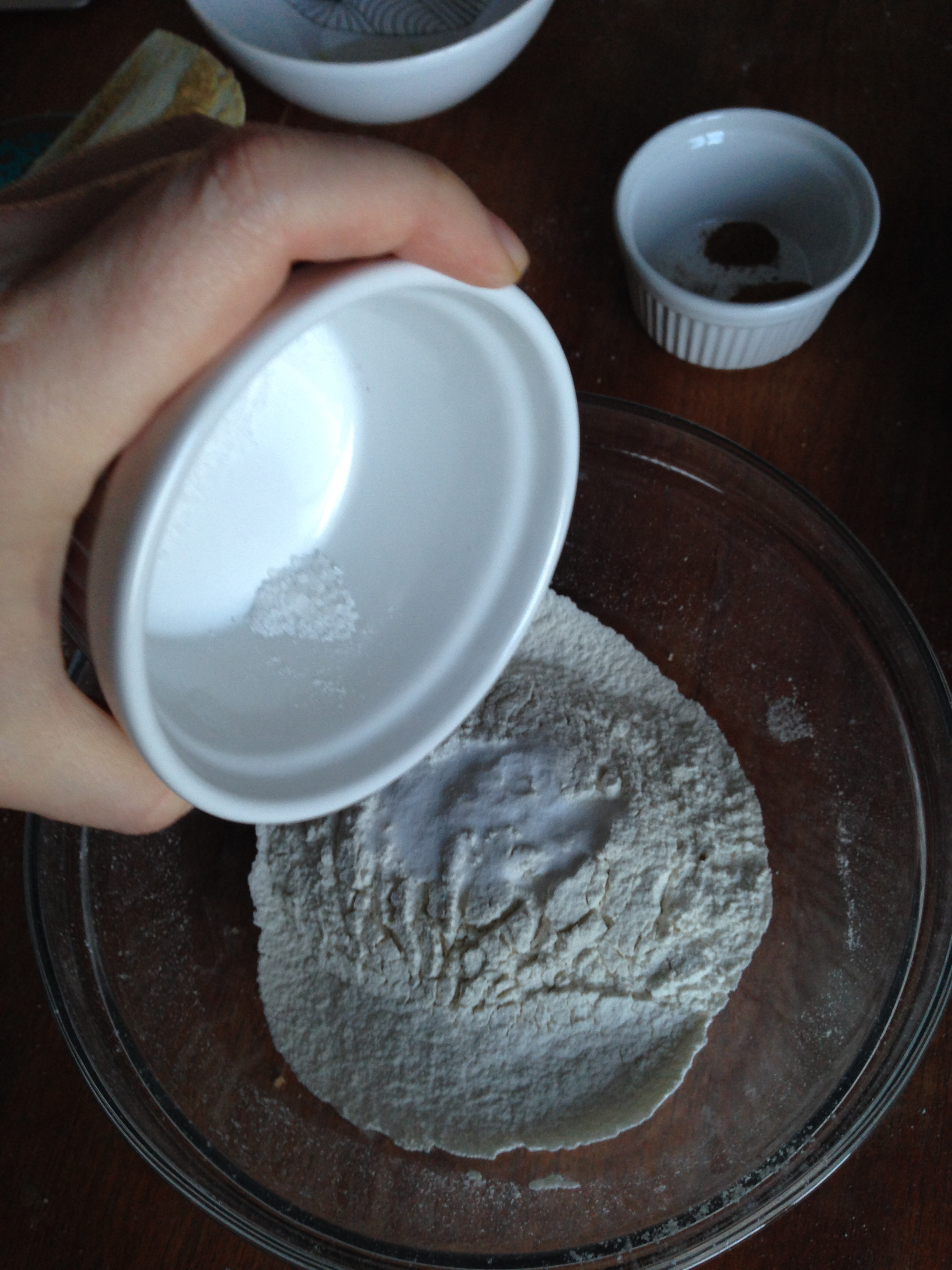 5. In another medium size bowl, sift flour. Add baking soda, salt and spices (cinnamon, nutmeg and allspice). Whisk these dry ingredients for half a minute.