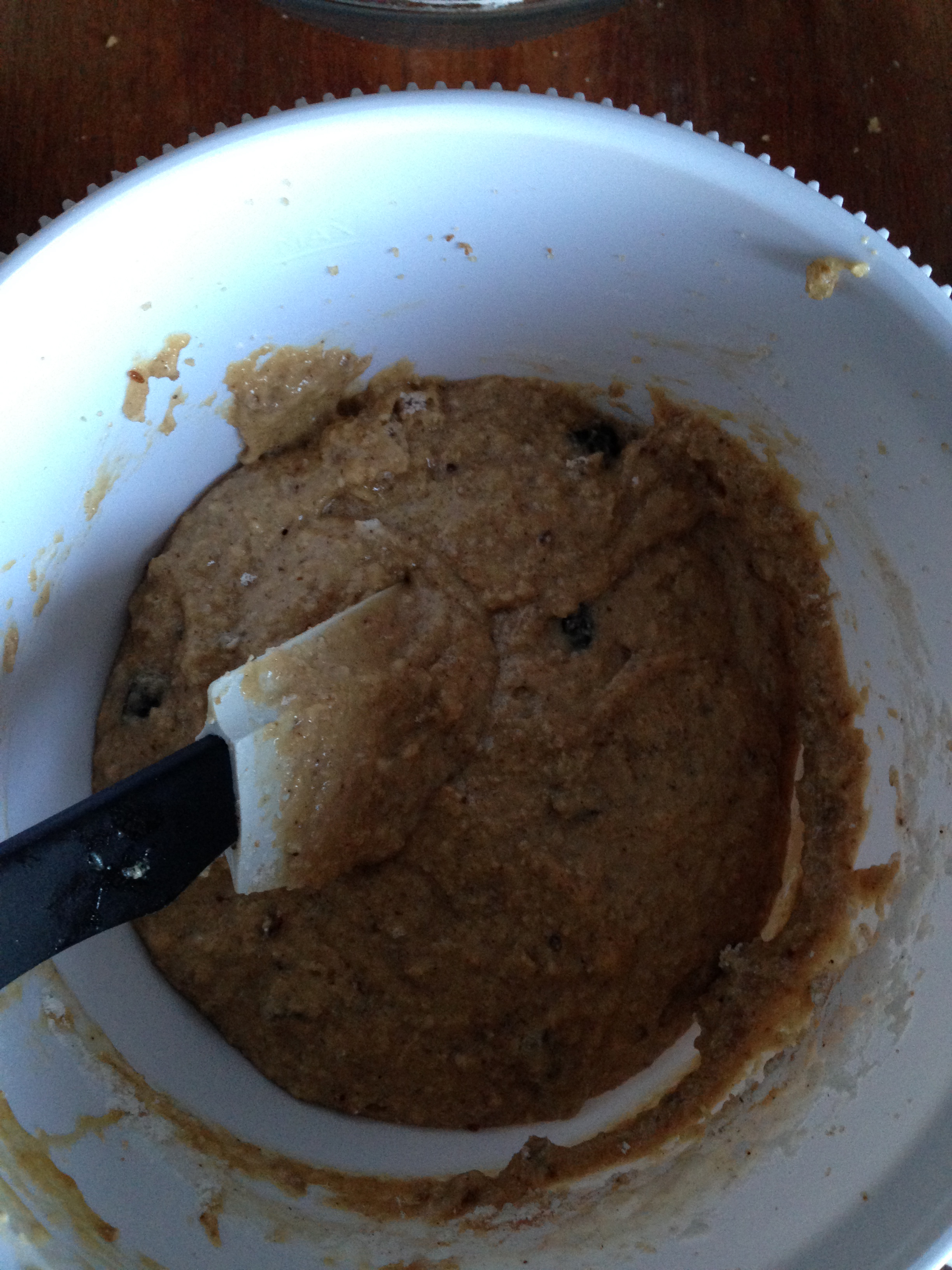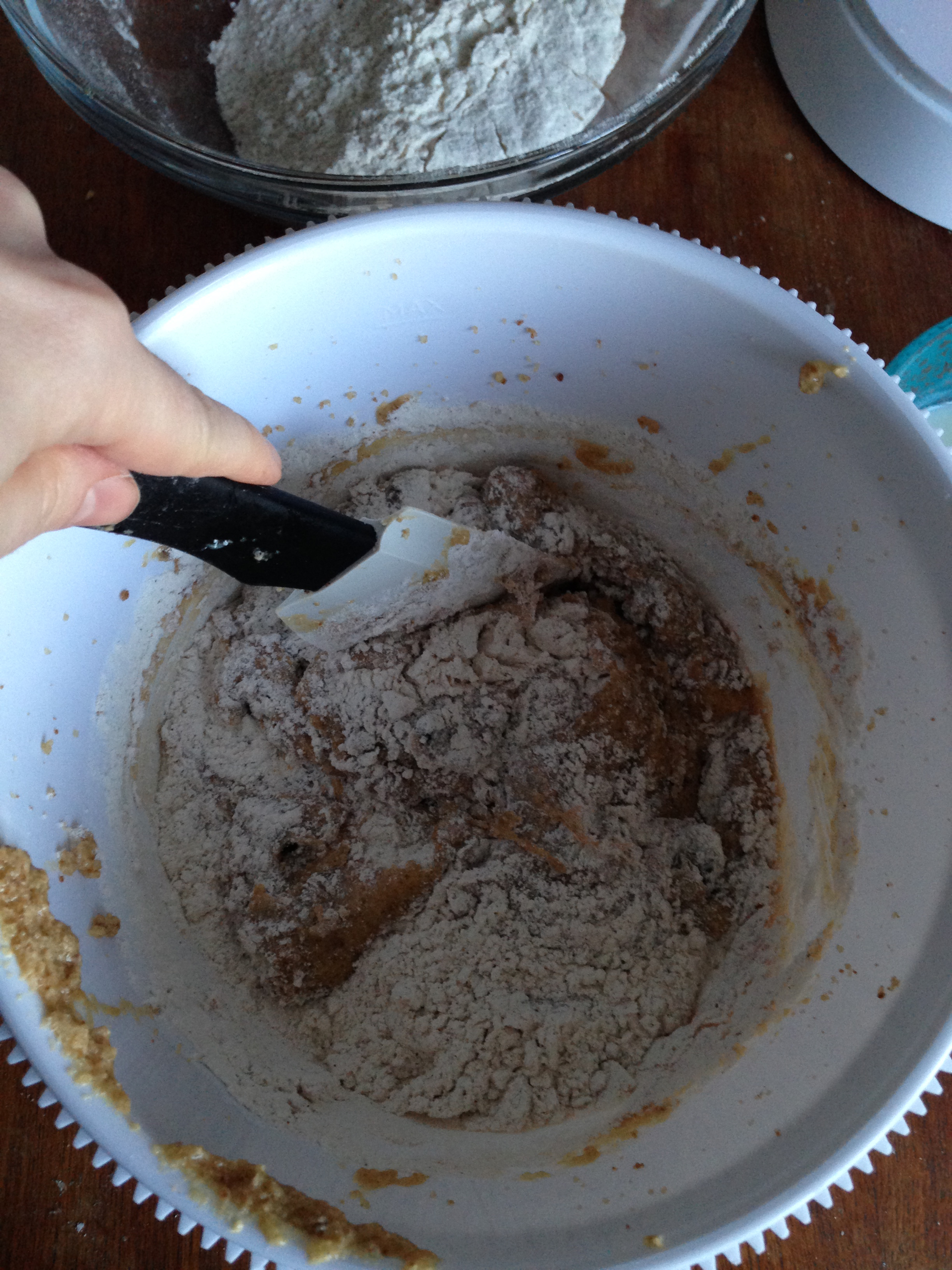 6. Add dry ingredients mixture to the wet mixture. Fold in just until all the dry ingredients are covered with wet mixture.