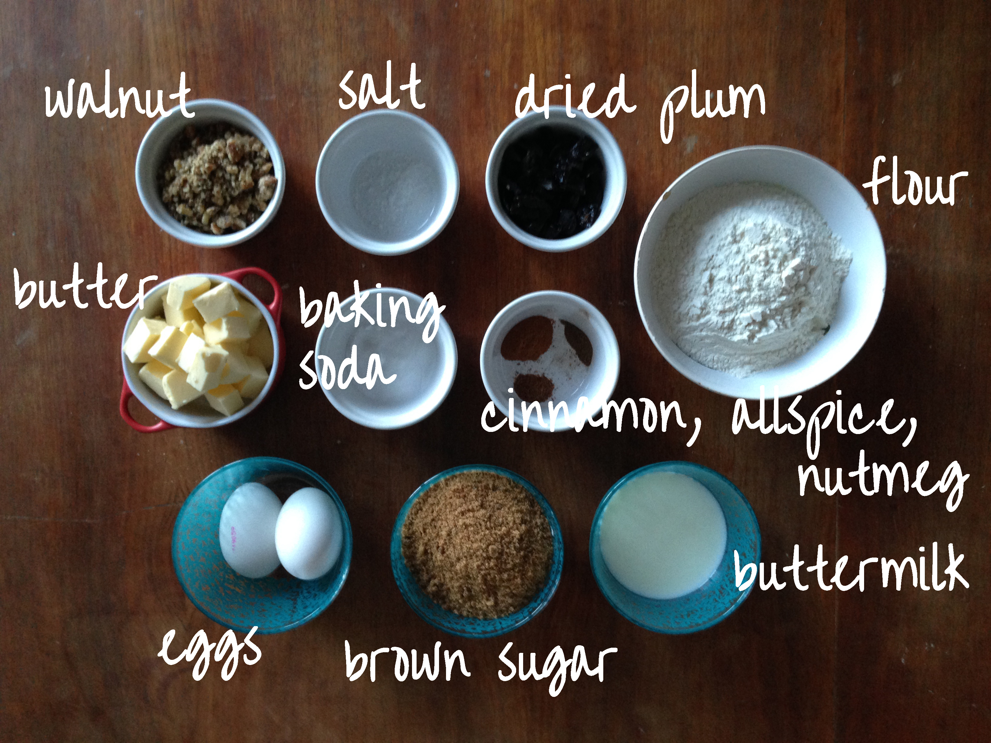 I had some dried plums left from the last time I baked savoury cake with dried plums, pistachios and goat cheese (Recipe here: https://mydearkitcheninhelsinki.wordpress.com/2013/09/22/a-savoury-cake-with-dried-plum-pistachio-and-goat-cheese-rachel-khoo-recipe/). I also had quite a good amount of walnut and just enough buttermilk, so I could totally see a cake coming out of those..
