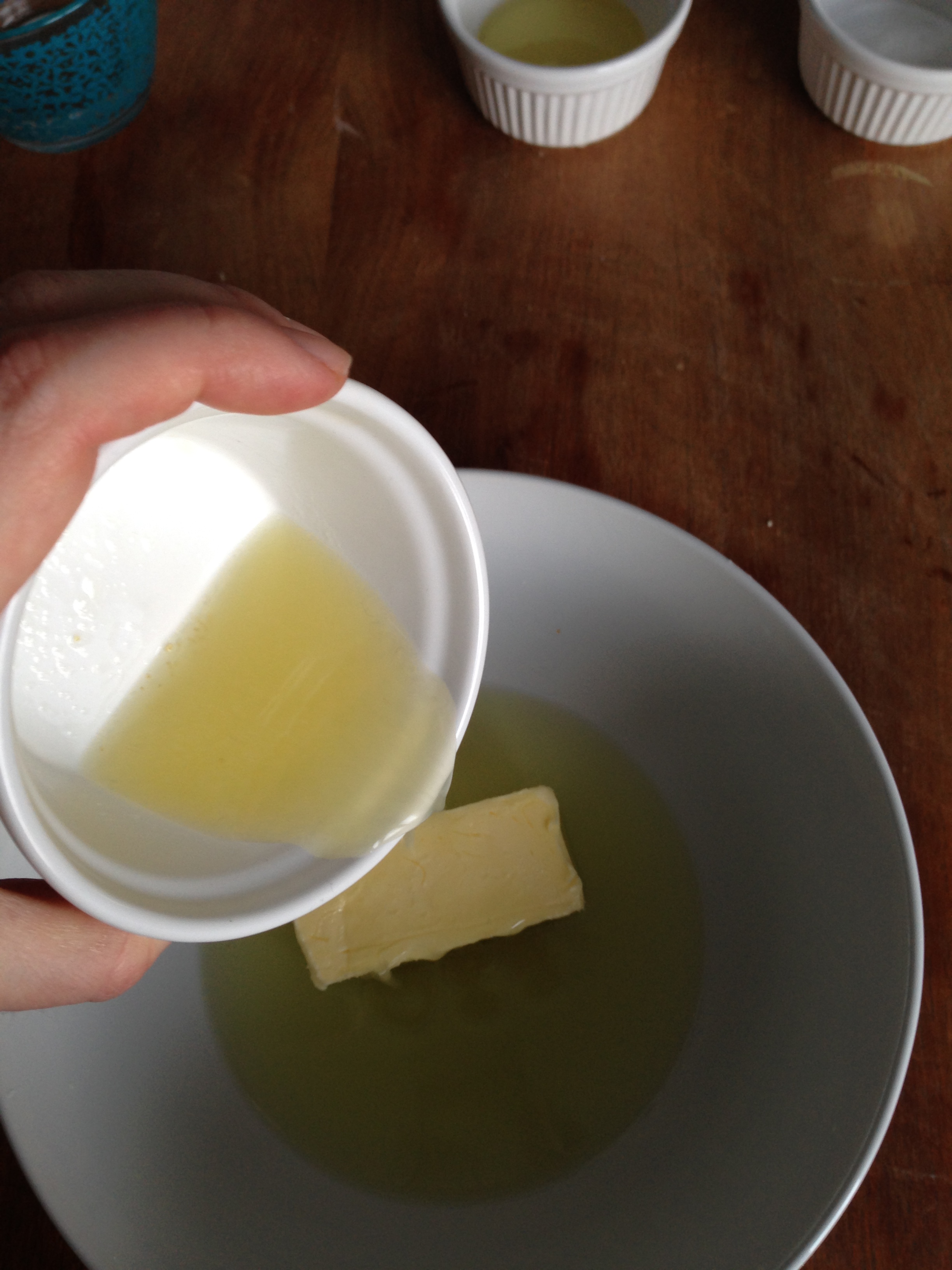 1. In a medium bowl, put oil, butter, lemon juice, water and egg white. Blend them together using your hand, or a hand whisk, or a fork….