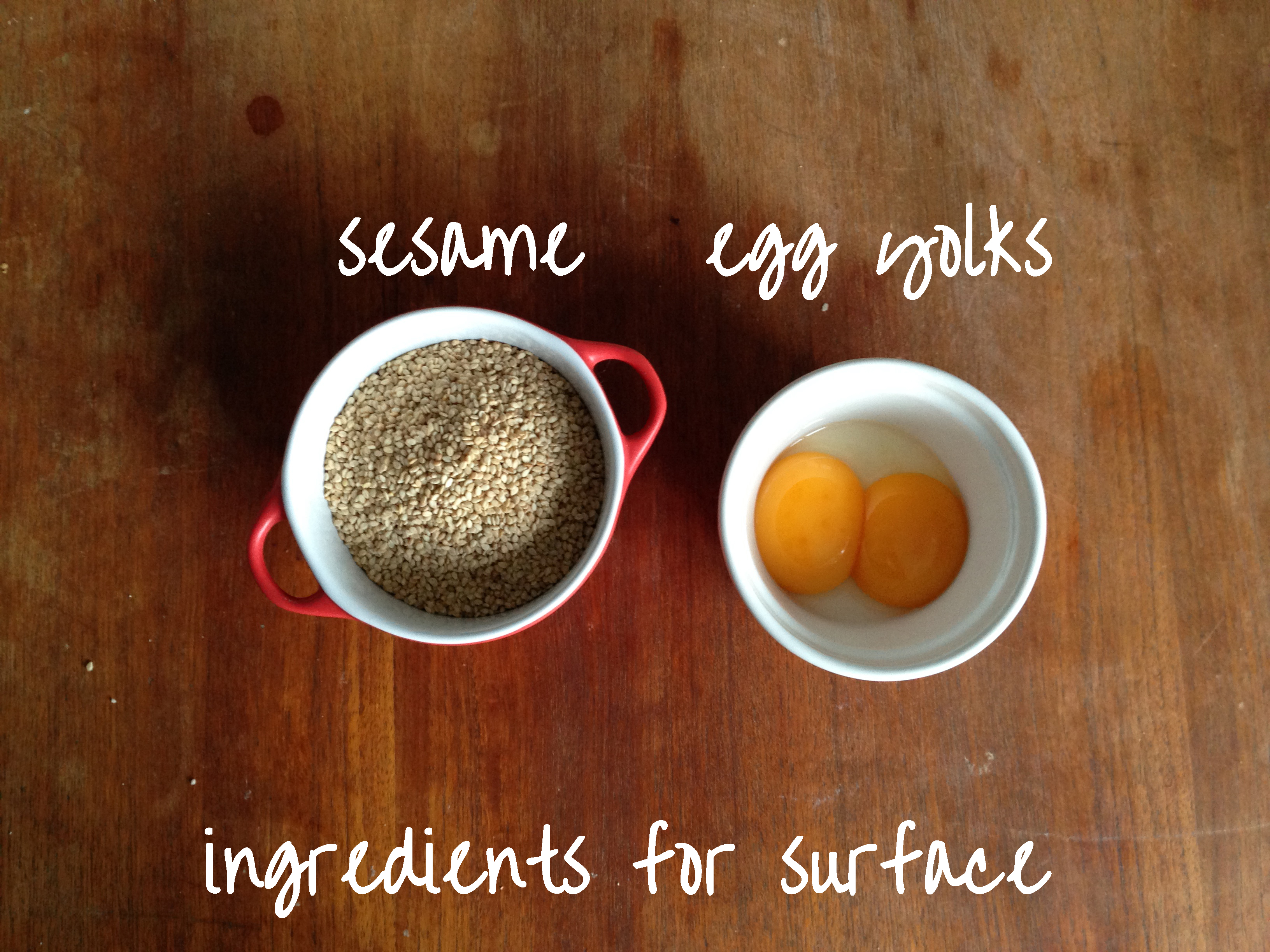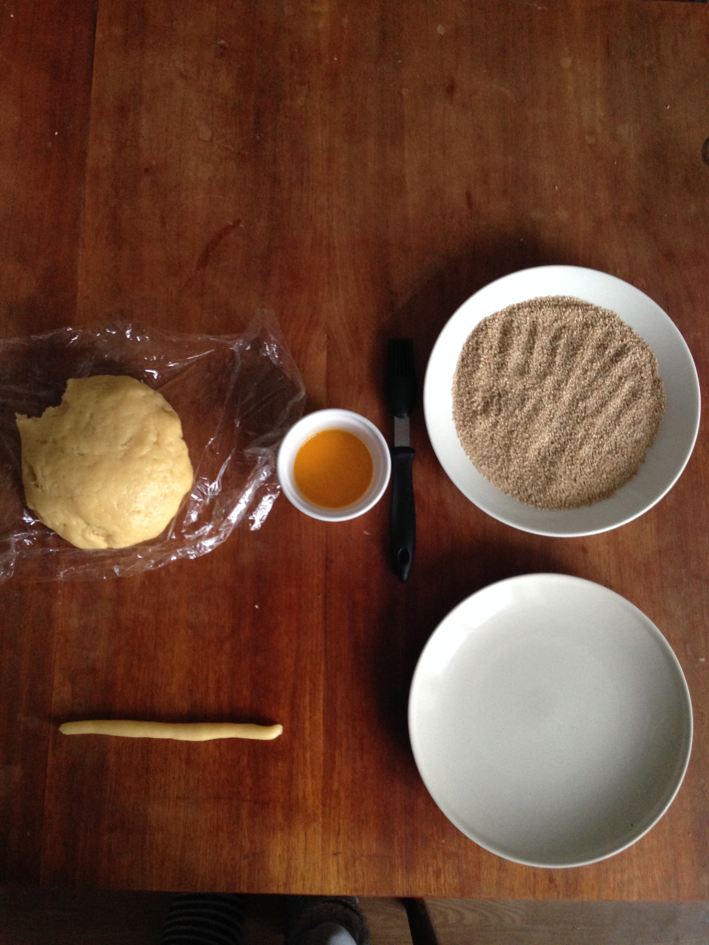 5. Now prepare an assembly line that consists of the dough, a surface to roll the dough, egg yolk and a brush, a shallow plate to brush the egg yolks on the rolled dough and sesame seeds in another shallow plate.
