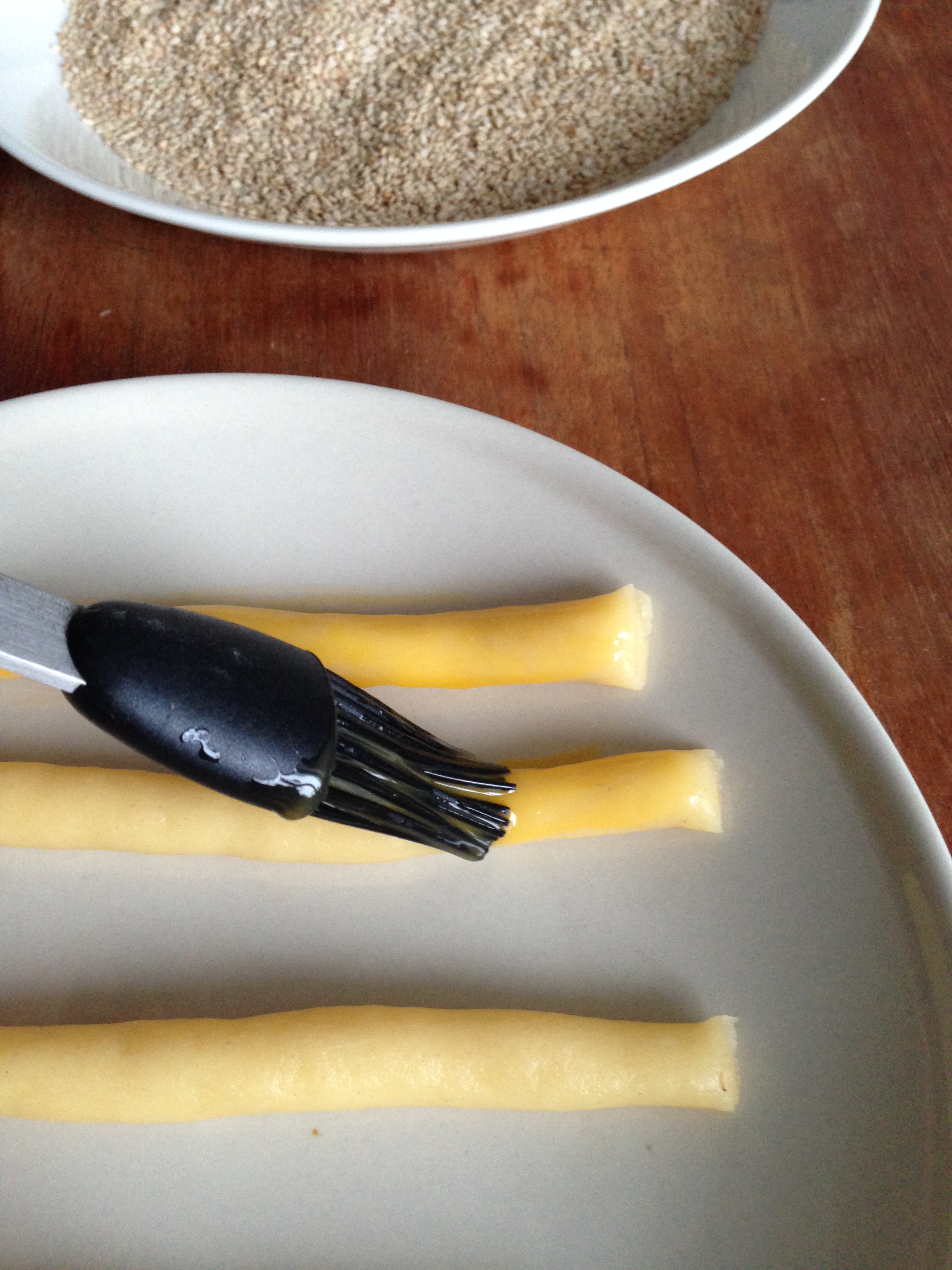 6. Take about 10 gr of dough in your hand. Roll it into a stick that is 15 cm long. Put the stick on the shallow empty plate and brush all its surface with egg yolk. Act fact because the surface that is brushed with yolk sticks to the plate. Once all the surface is brushed, roll the stick on sesame plate to cover it completely with a rich amount of sesame. Put each ready stick on an oven tray covered with a baking sheet. In the photo you can see that my sticks were all different sizes because I wanted them to vary in size. But the amount of 40 sticks that I wrote at the beginning of the ingredients list is when all the sticks are equal in size (which is, as written there, 15 cm long).