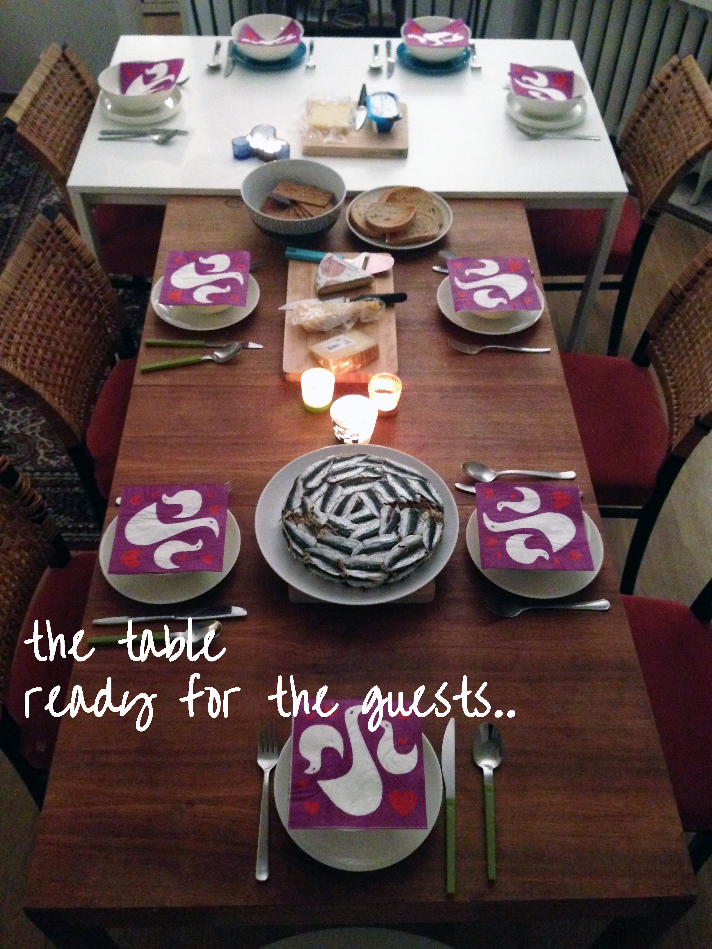 All in all, I was so happy with the food, and I was also happy that the cooks managed to prepare all that without the need to call me – which they were free to do, in case they did not understand a step in the recipe. This shows that at least those three recipes work just fine, no? Oh and one more thing: I would not be able to make this event without the contribution of my roommate, Maisa!! She provided her lovely Arabia dishes, otherwise I would have to use some plates that I hate, and maybe even paper plates!! Hmm… I need to have better dishes of the same kind probably, for future events…