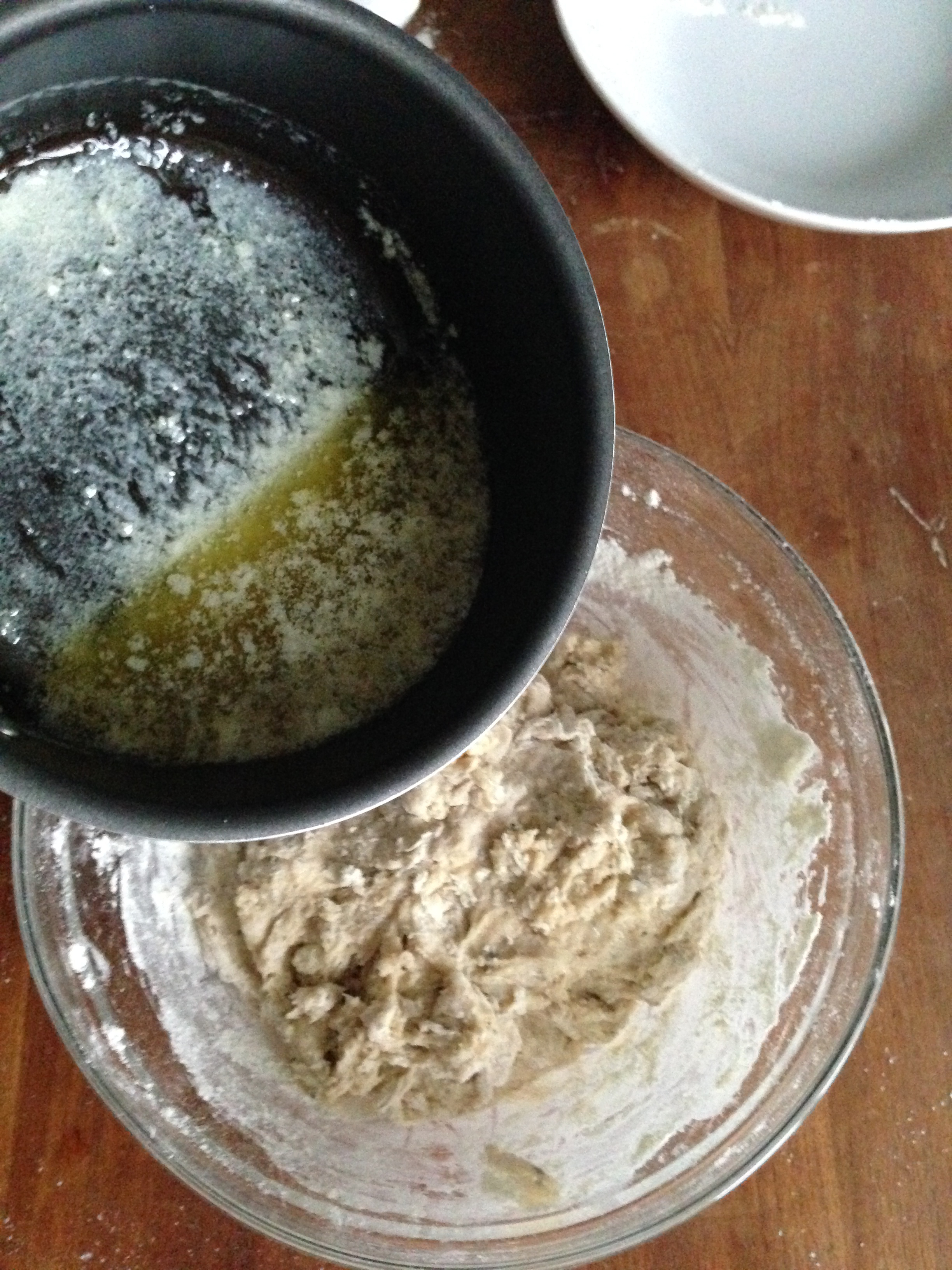 10. In the dough, pour melted butter and continue kneading to incorporate the butter.
