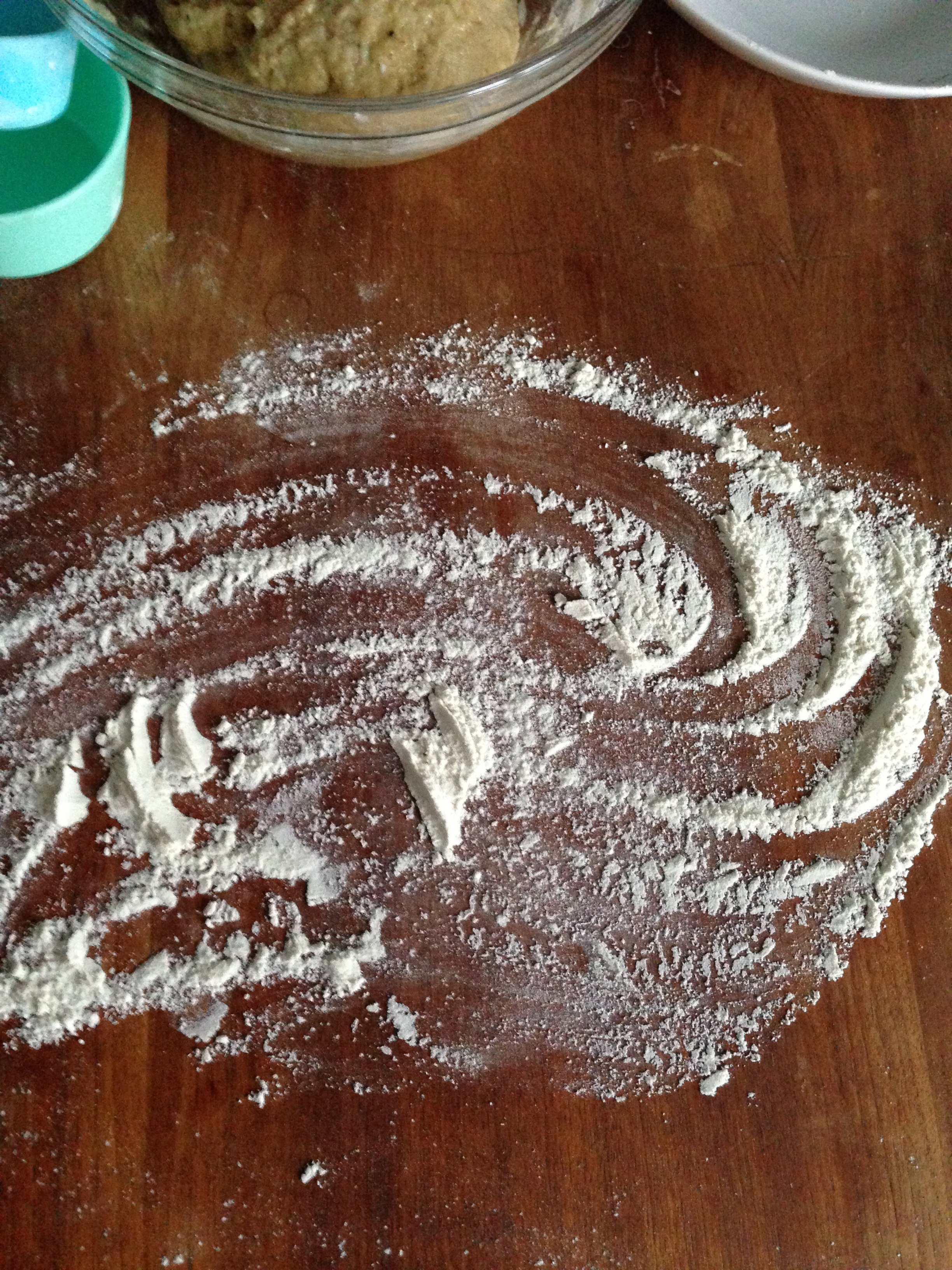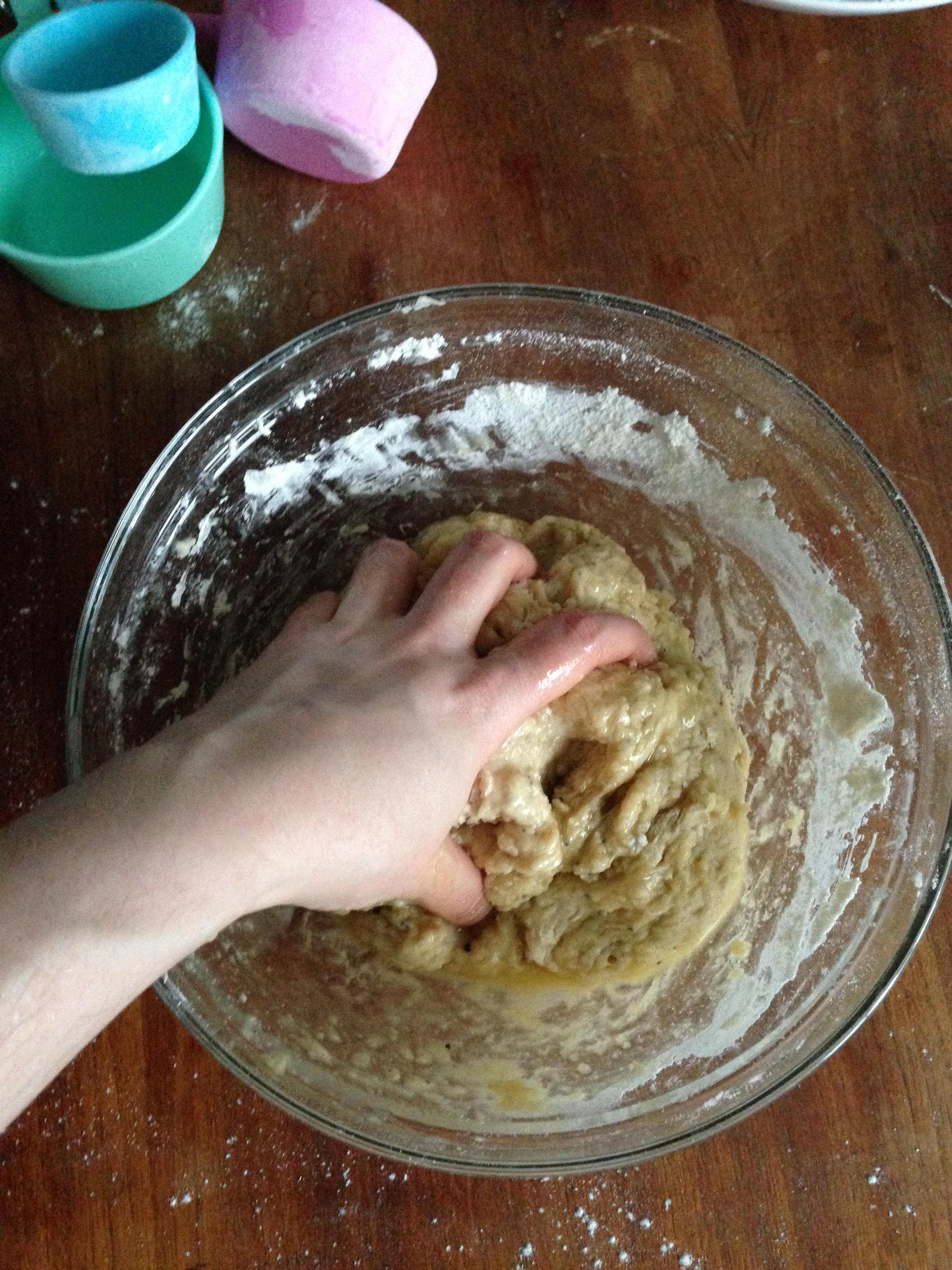 14. When the dough is doubled in size, you are ready to continue. First, flour the kneading surface again. Then put away the cloth covering the dough and punch the dough a few times to get the air out of it.