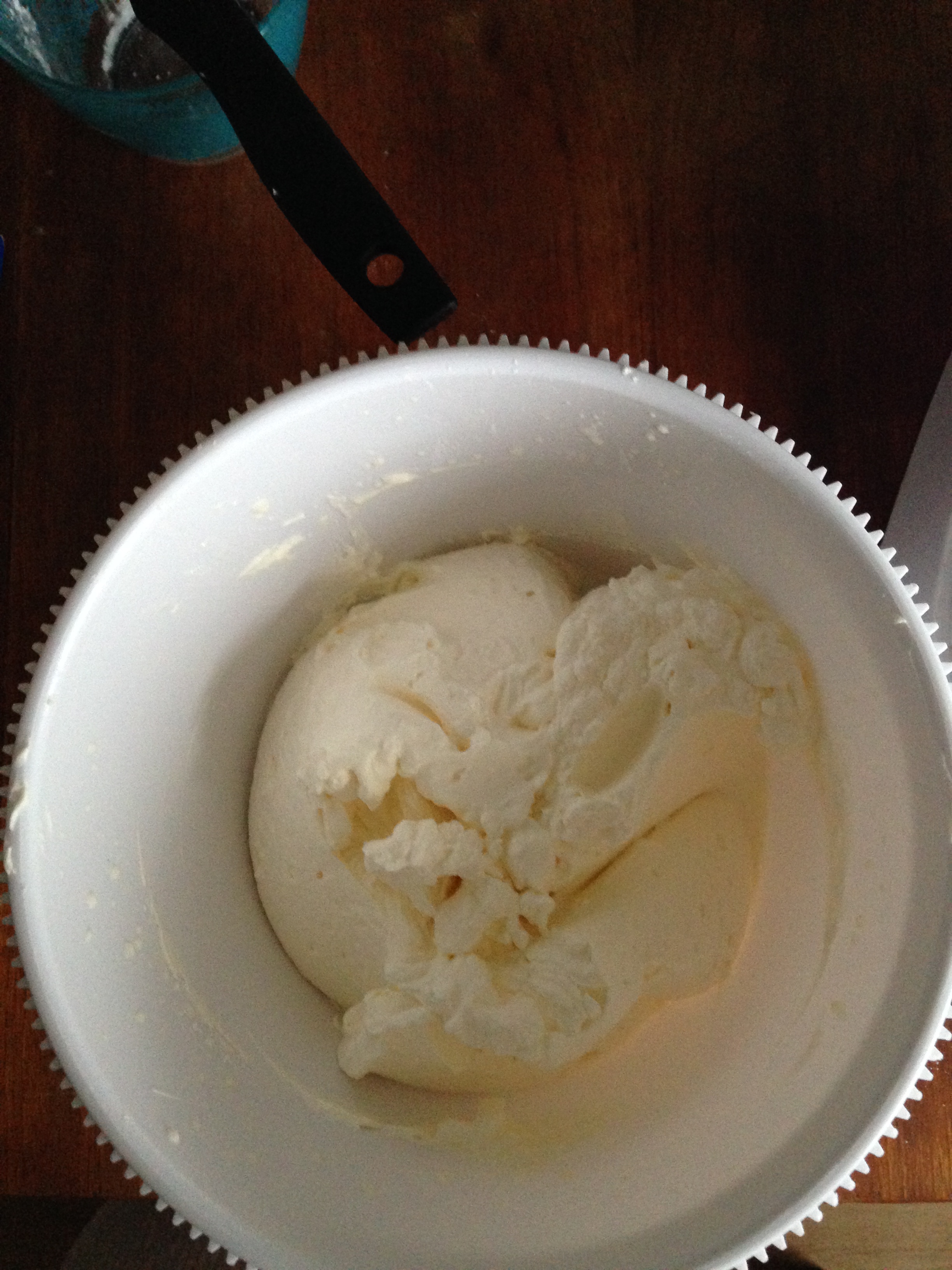 13. While waiting for the dough to rise, you can prepare the cream for filling. To do that, in a mixing bowl, pour heavy cream and powdered sugar and mix it until you get a hard cream. Put the cream in the fridge until the time comes to use it for filling.