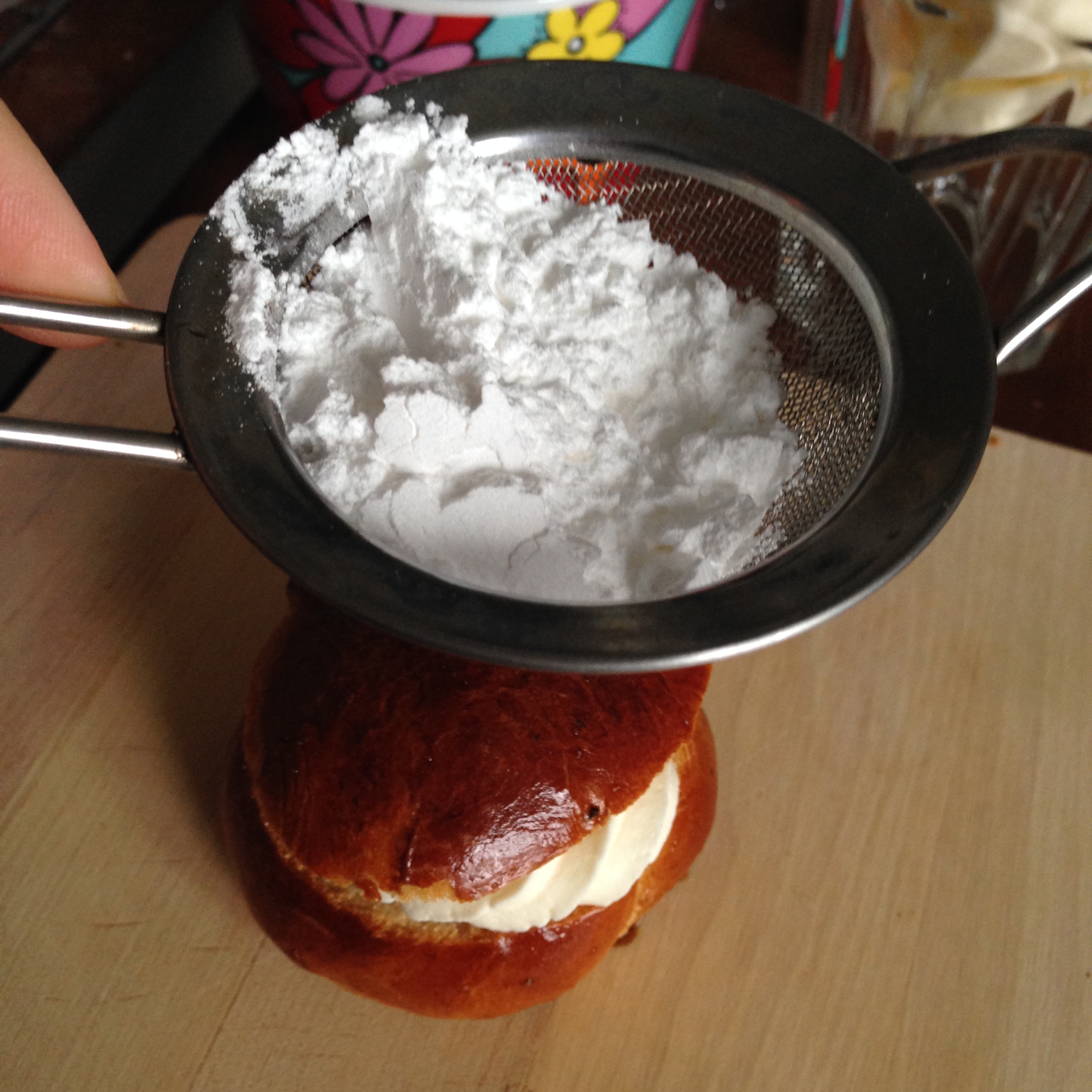 21. When the buns are cool, take out your whipping cream from the fridge and put it in a piping bag with 10 mm star nozzle. Take out also the jam from the fridge and have a small spoon ready. Have also some powdered sugar with a little strainer ready.