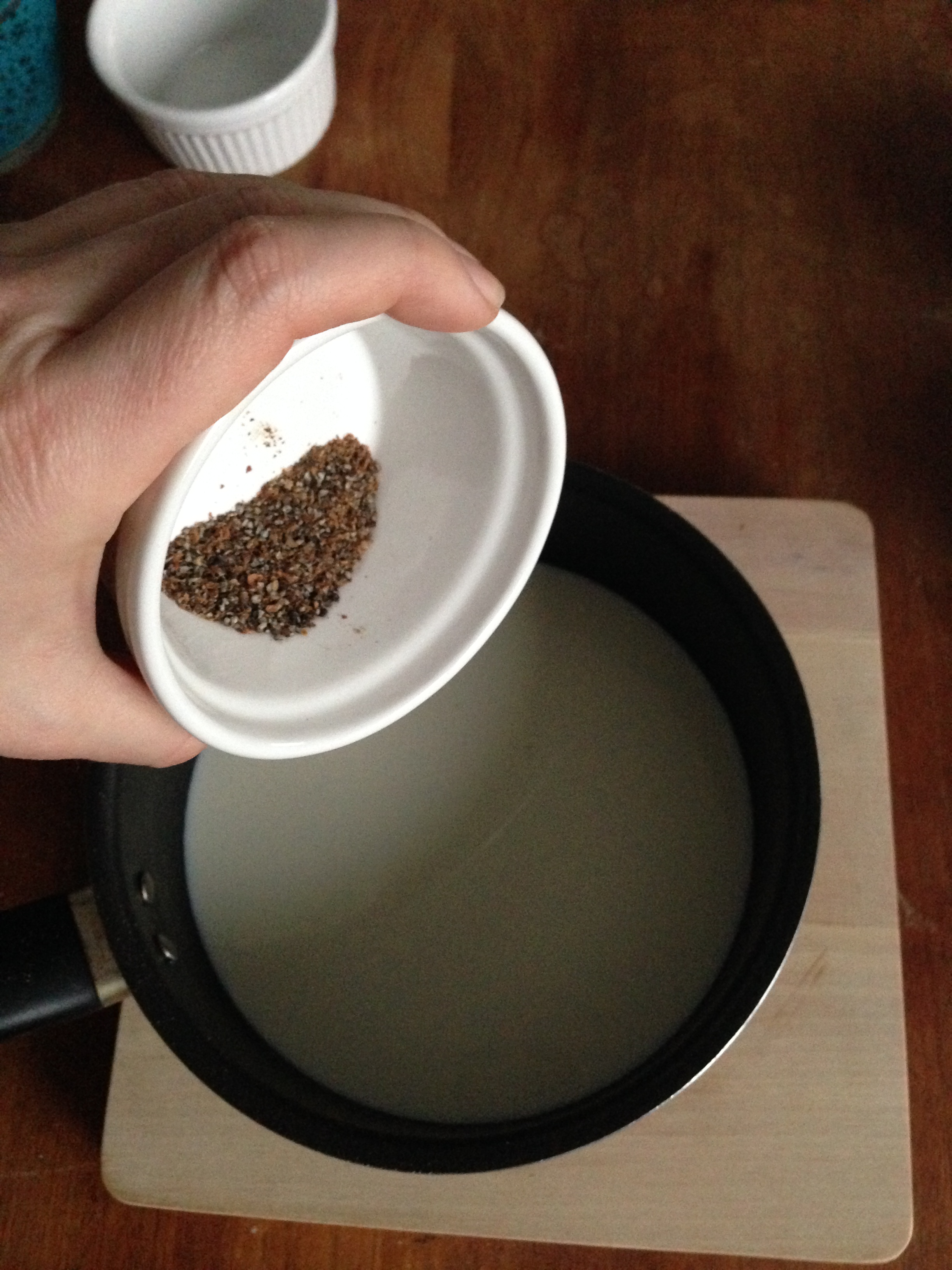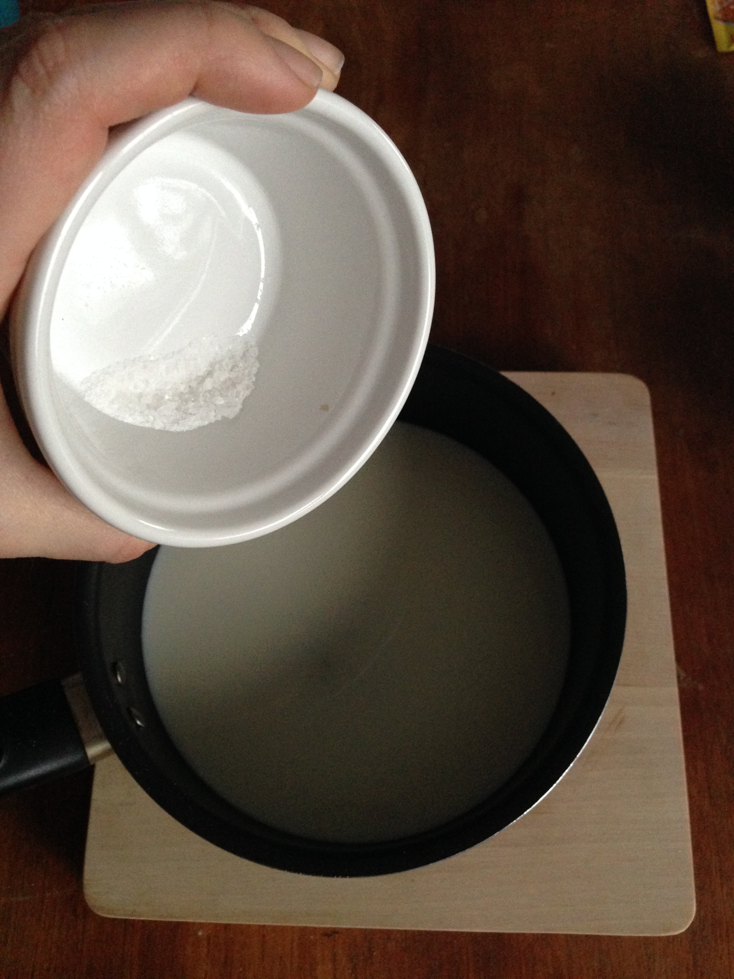 5. When the milk is warm, take it away from the heat. Add sugar, salt and cardamom and whisk it until the sugar dissolves.