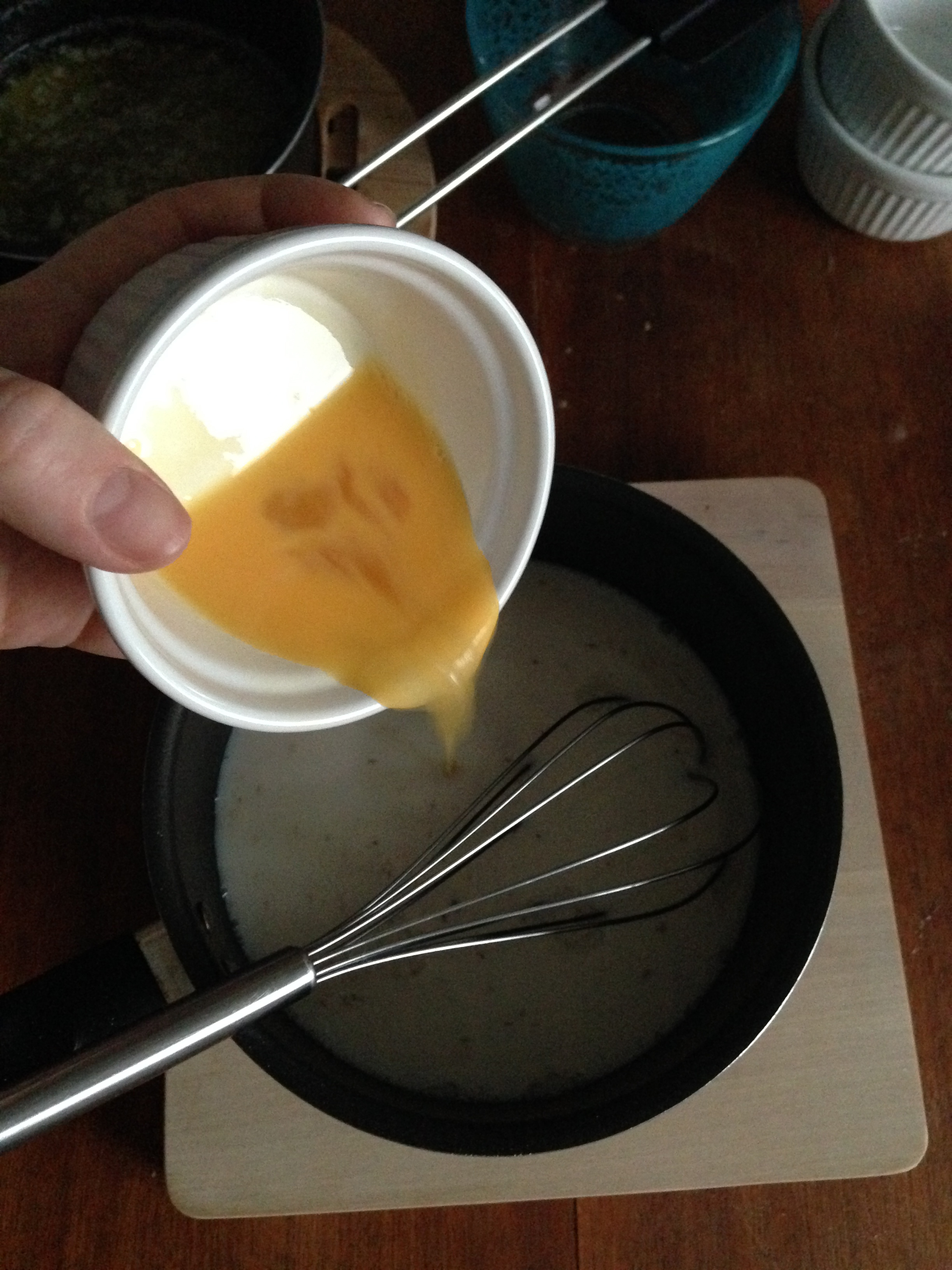 7. Put 1/2 egg that you prepared in step 1 in the milk mixture and whisk it until egg is partially incorporated.
