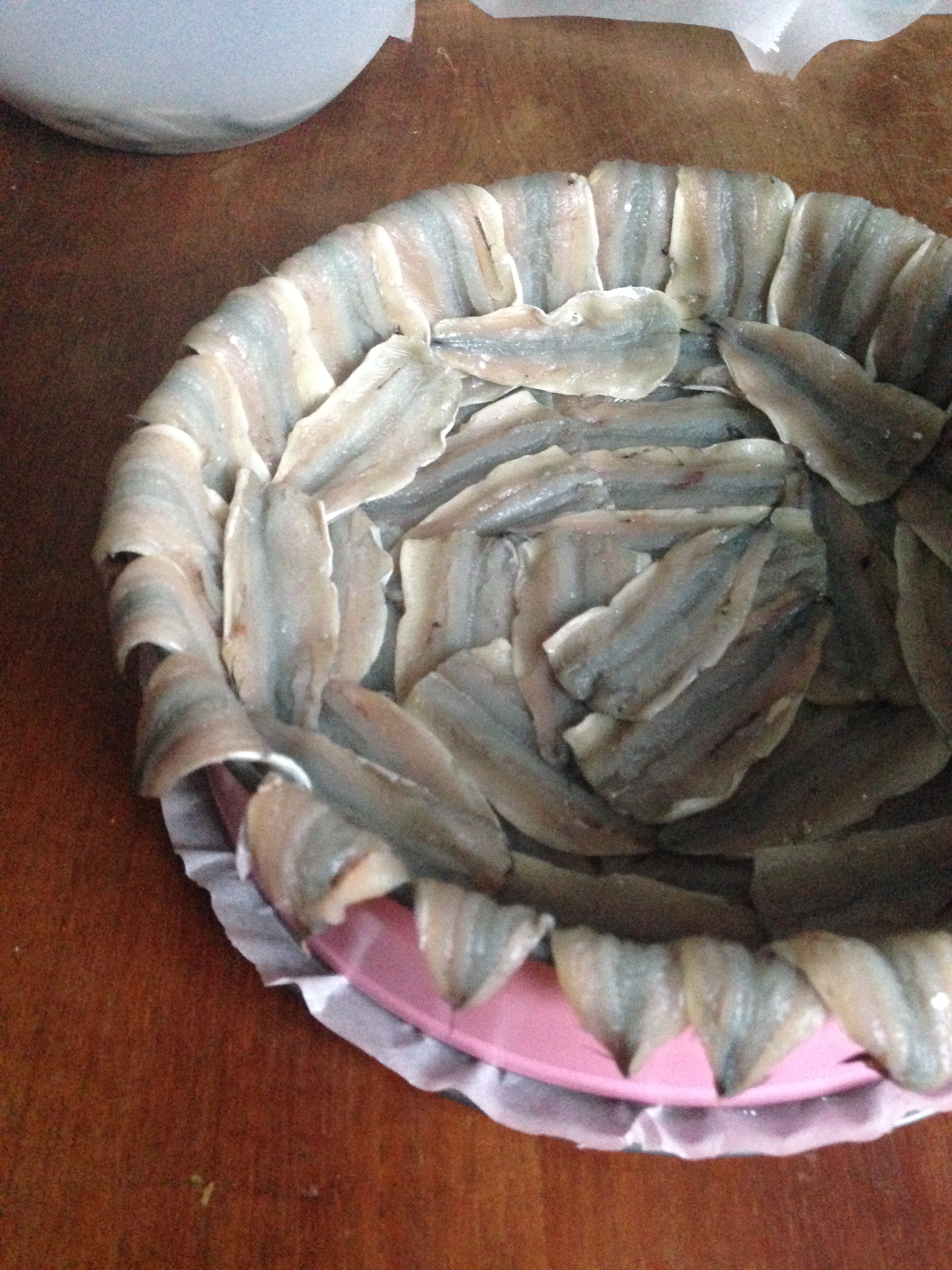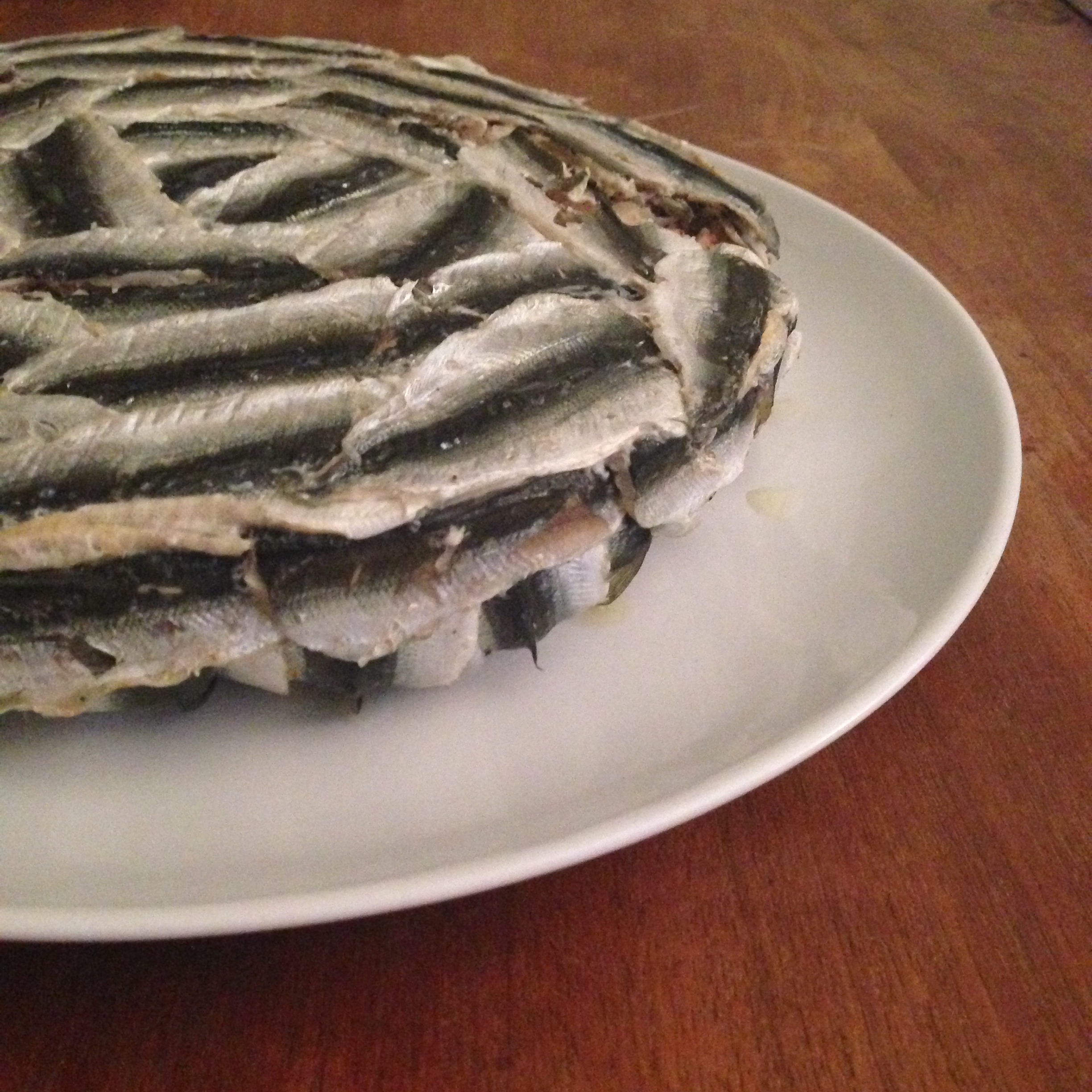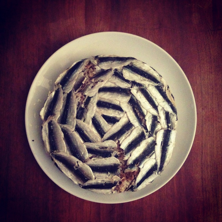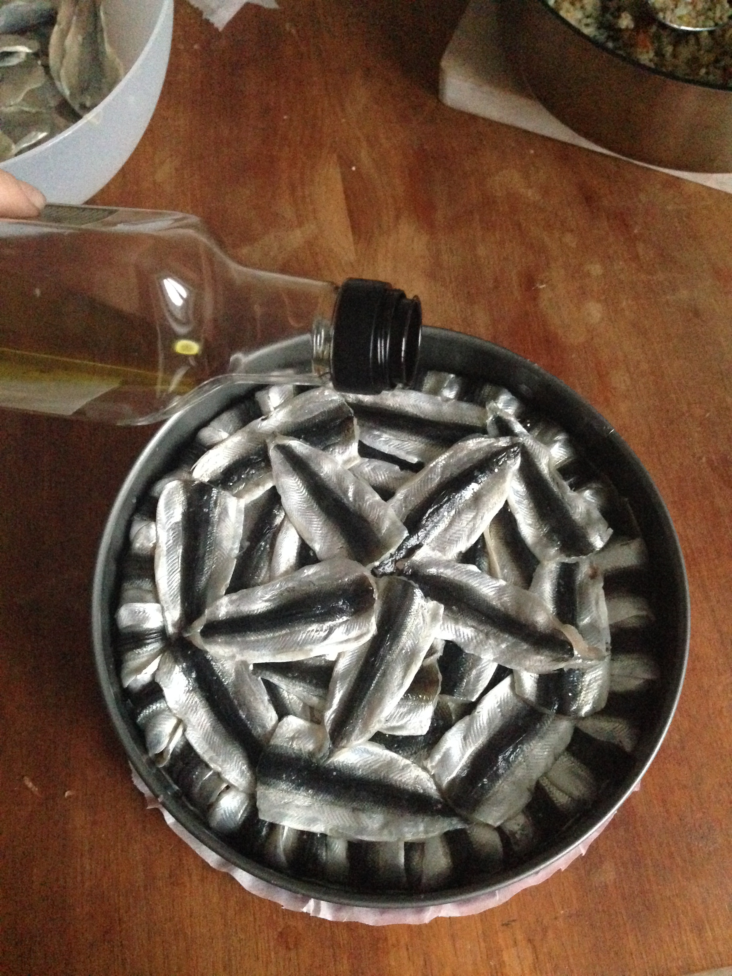 10. Cover the surface of the rice with more fish fillets. Pour 1 tbsp / 15 ml olive oil on the surface. Put the mold in the oven, in middle rack. Bake it for about 20-25 minutes, until the fish are fully cooked, but not burned! This fish shrinks quite a lot when baked so you will have some holes in the fully covered surfaces, no can do… If you use European anchovy, you do not have such a problem..