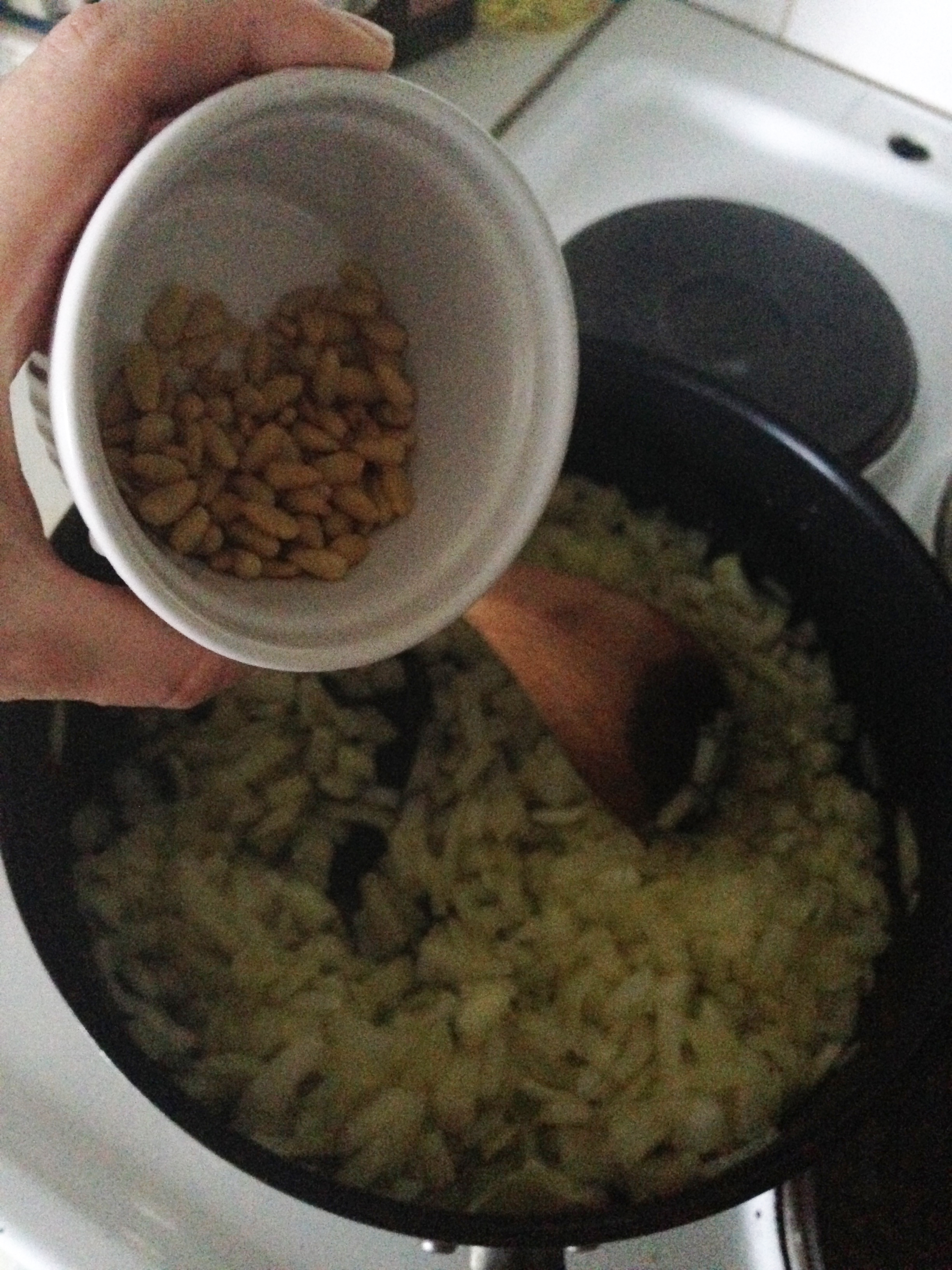 4. Add pine nuts and stir for half a minute.