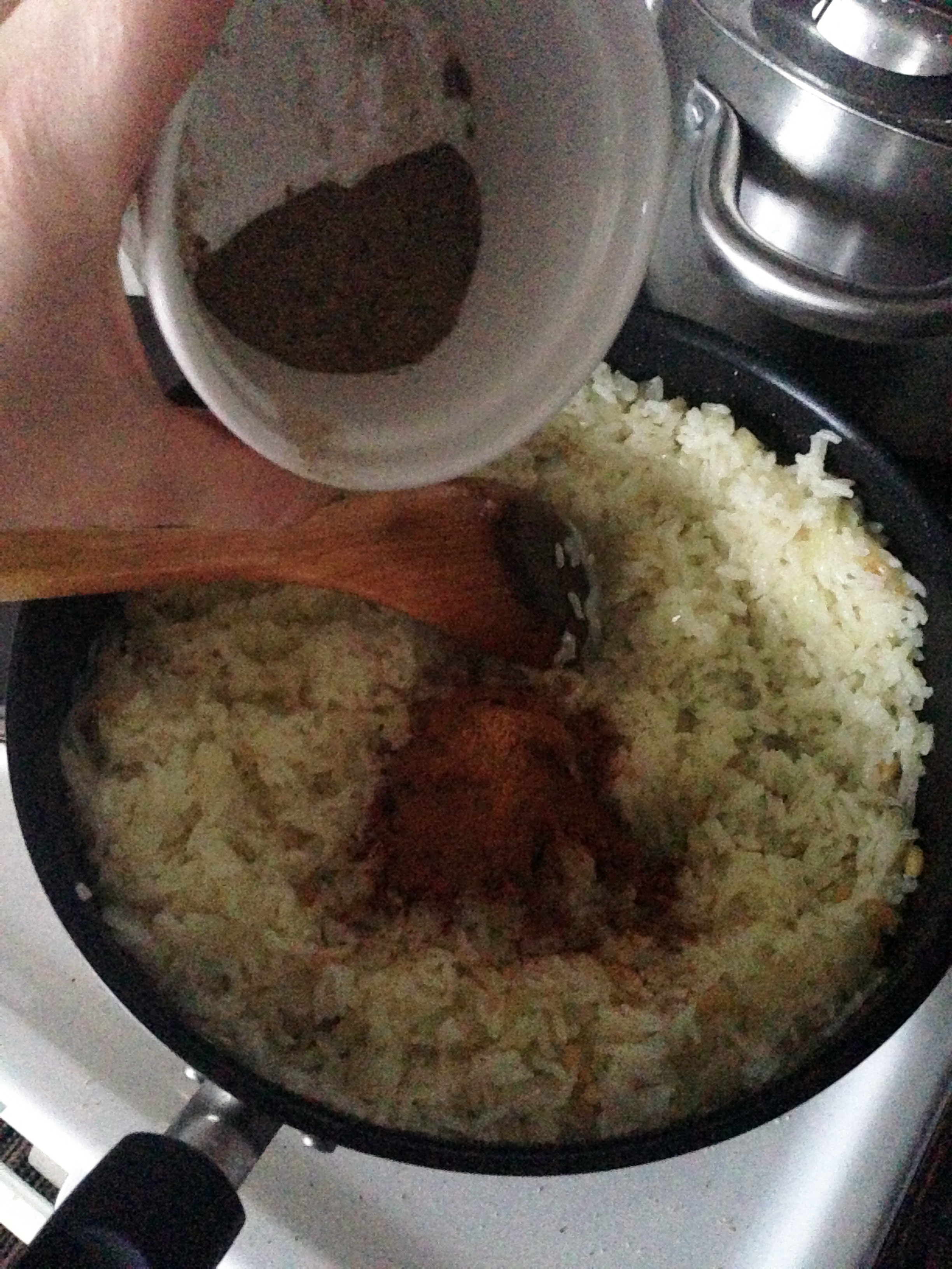 7. The pile of rice will have some holes when it is done as seen in the photo. At this stage turn the heat off. Add cinnamon and black pepper and stir it until all ingredients are nicely mixed.