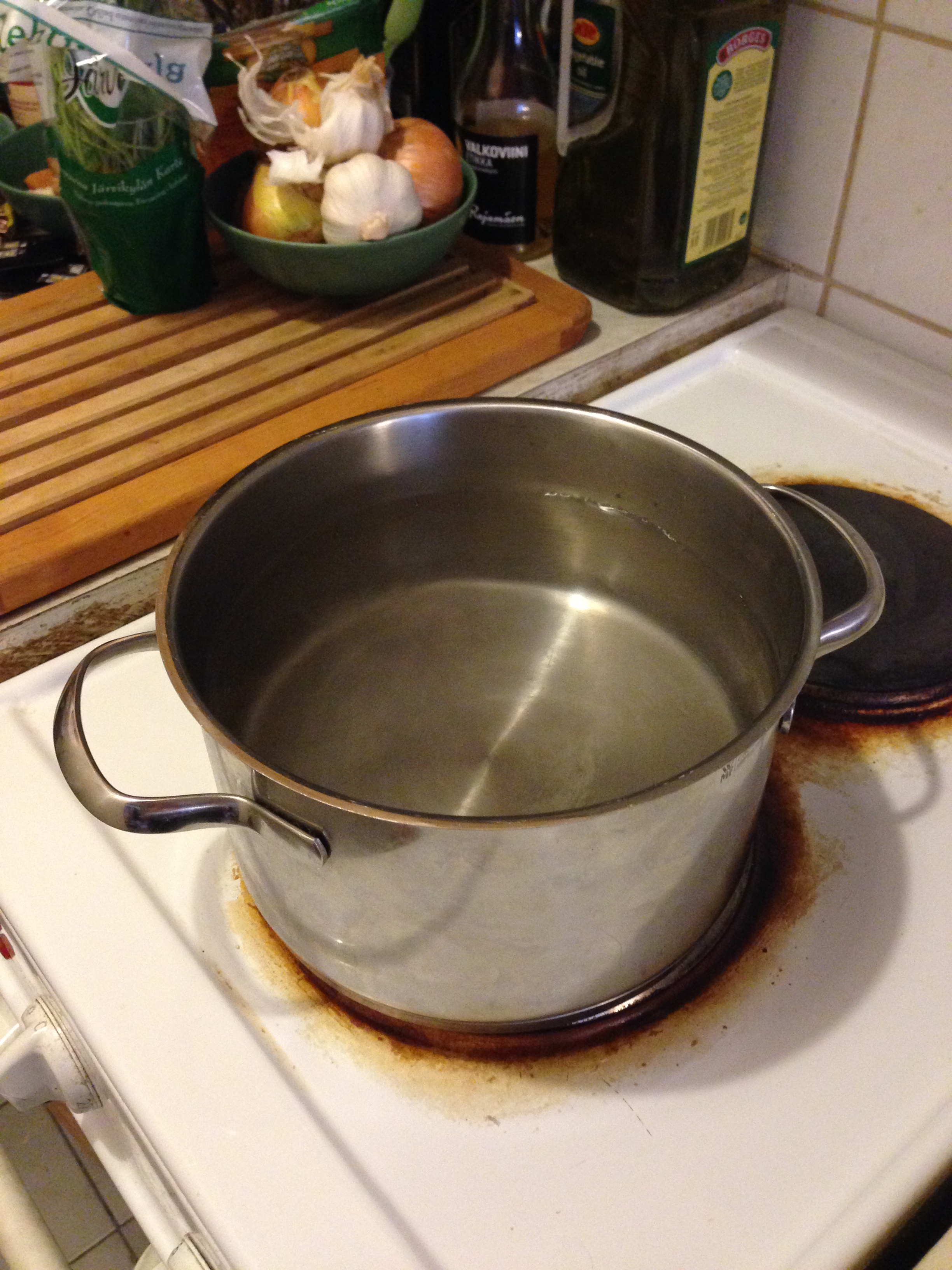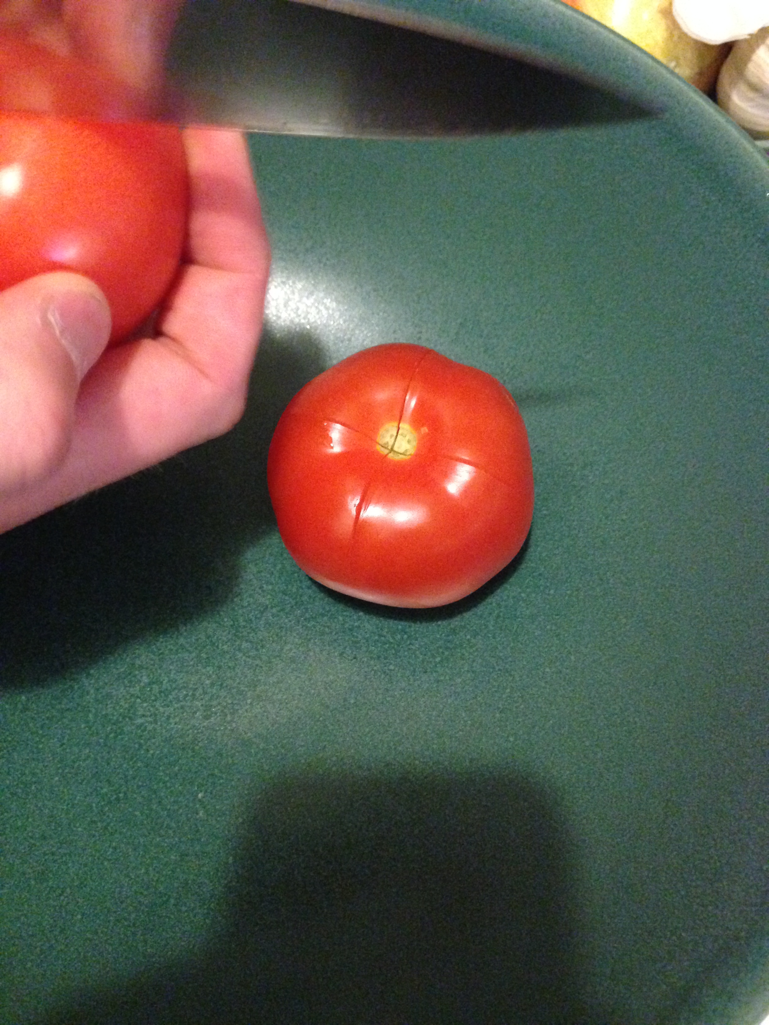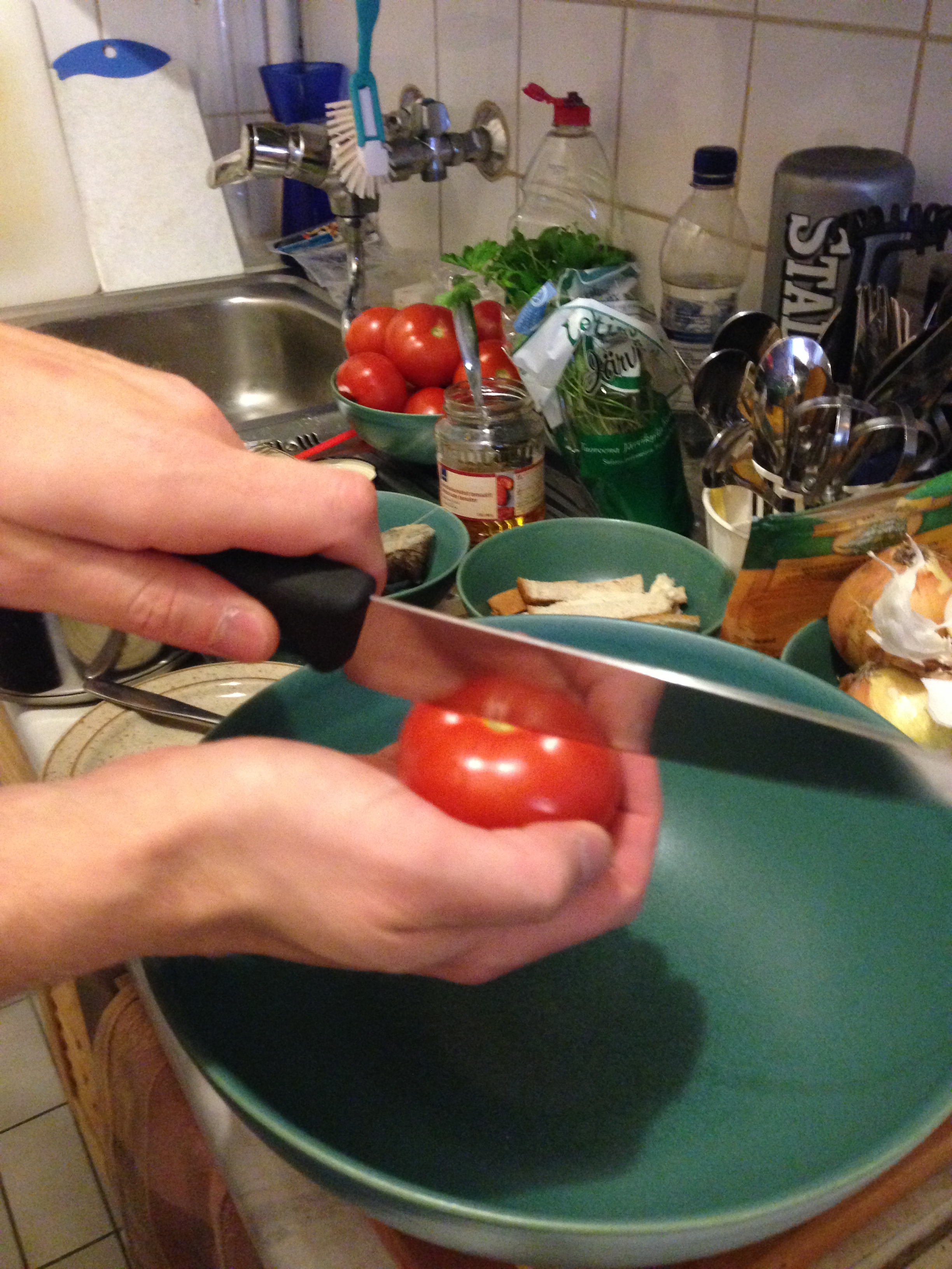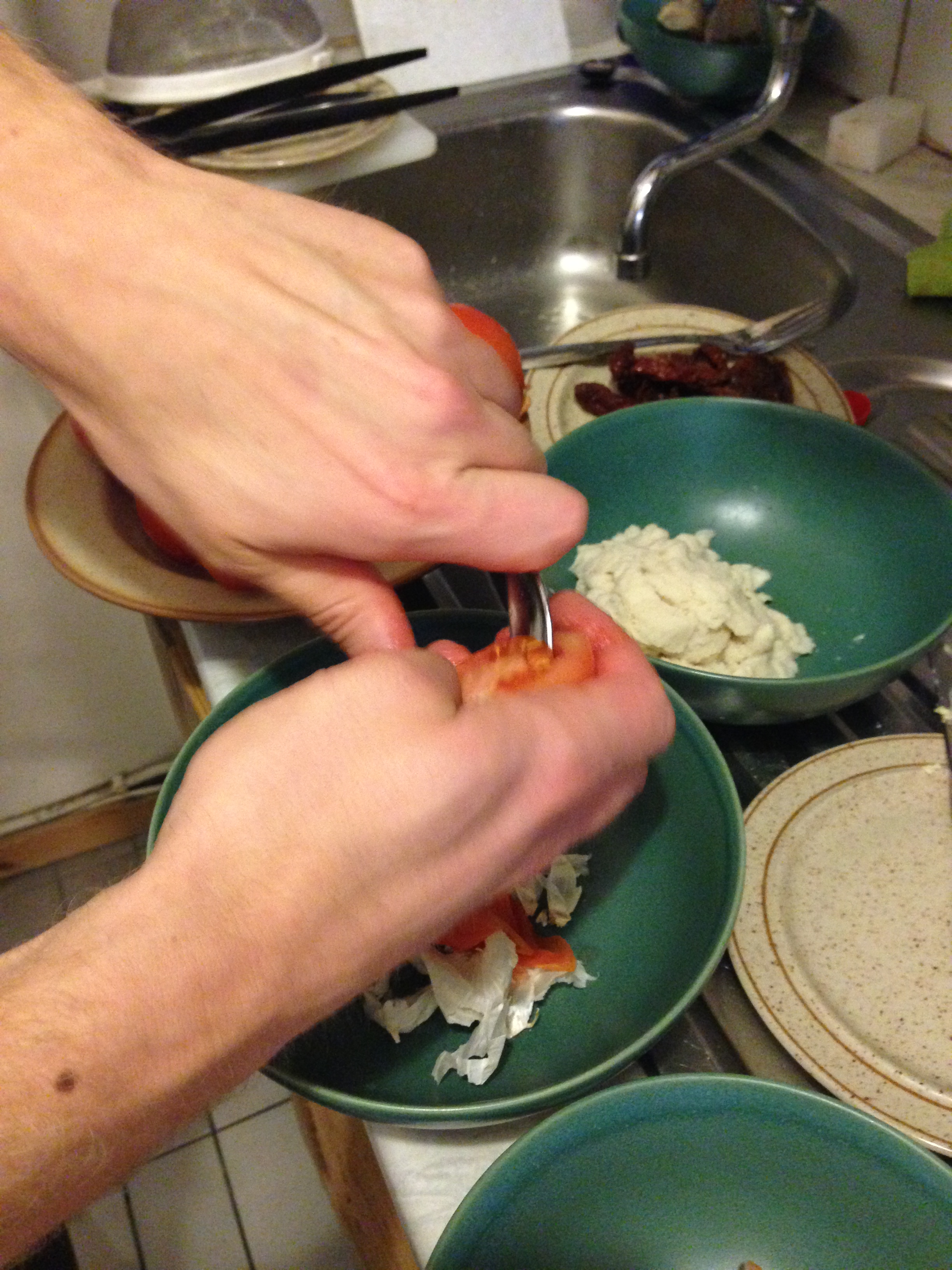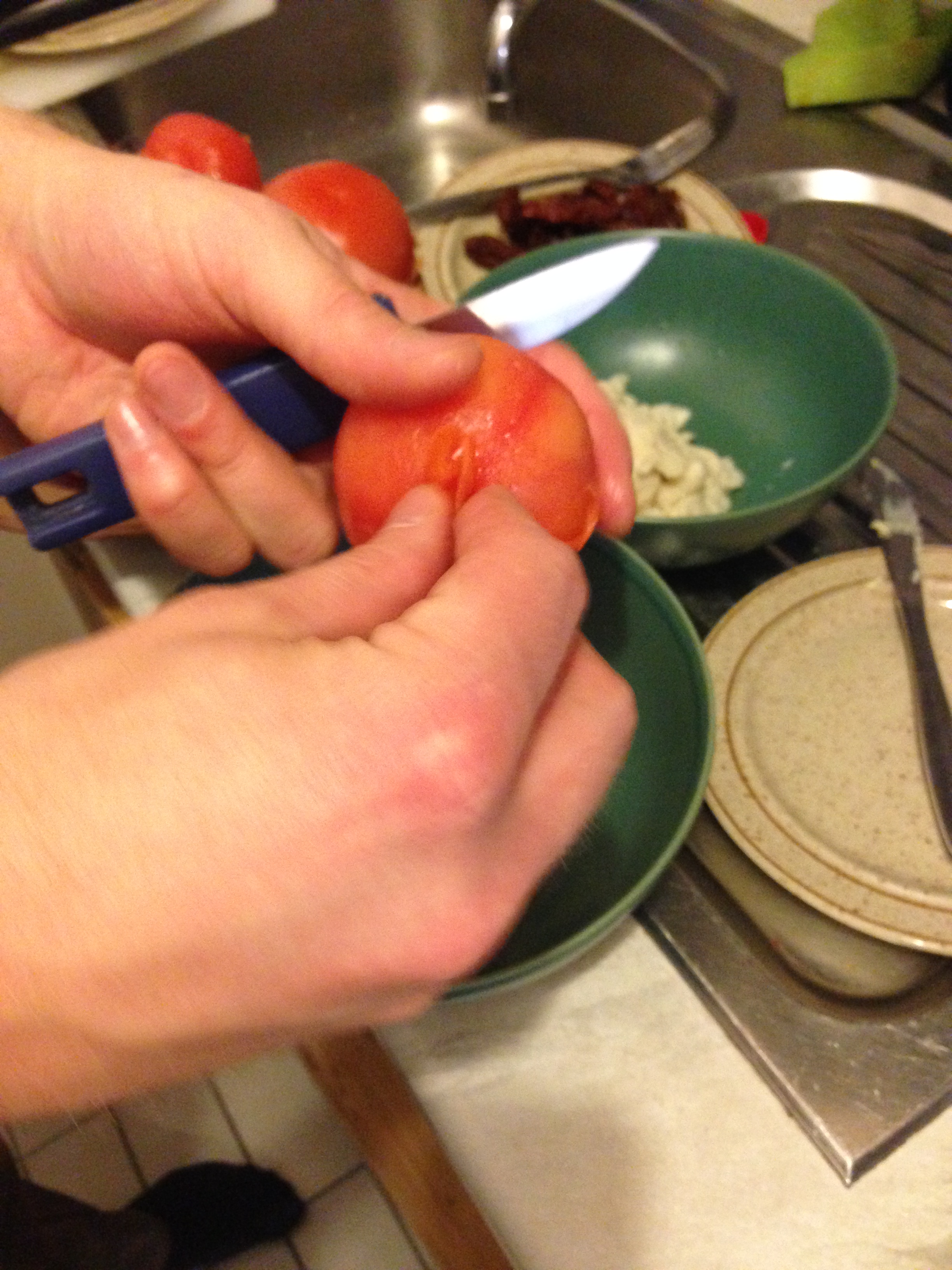 2. Peel the tomatoes. Now here’s a good tip from Panu on how to easily peel tomatoes: As seen in first photo below, using a sharp knife, slice a shallow cross on the stem of each tomato and put them in a big bowl (since we have 1 kg of tomatoes here, put them in a BIG bowl). Pour the boiling water over the tomatoes and wait until the cross starts to split open – about 30 seconds to 1 minute. Watch carefully and take the tomatoes out as soon as you see the splitting – do not accidentally cook poor tomatoes!! After that lovely adventure, just peel the skin, take the core of each tomato out and put them aside.