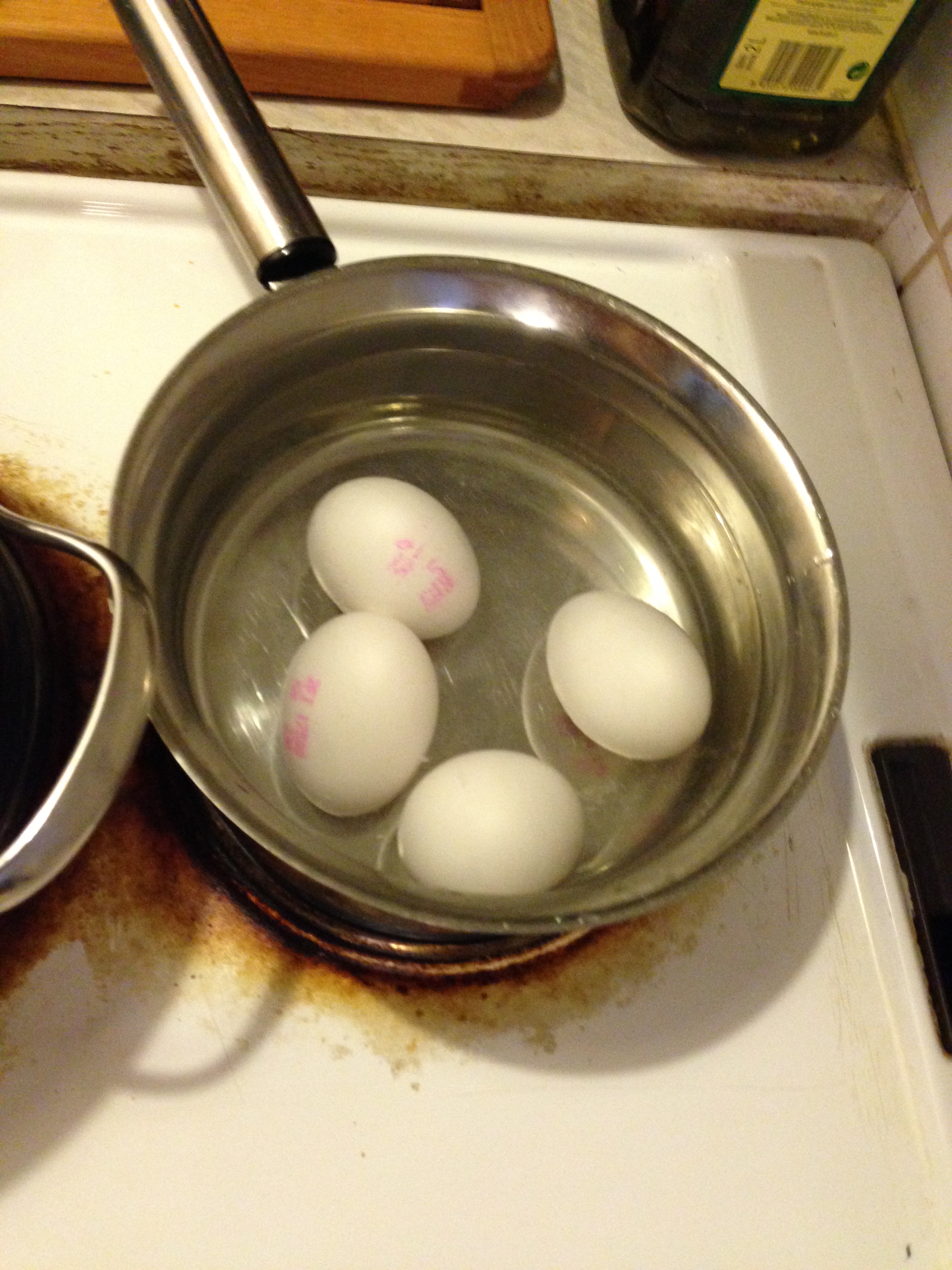 1. In a medium pan, put some water and hard-boil 4 eggs in it. When eggs are boiled, put them aside to cool down, keep the boiling water.