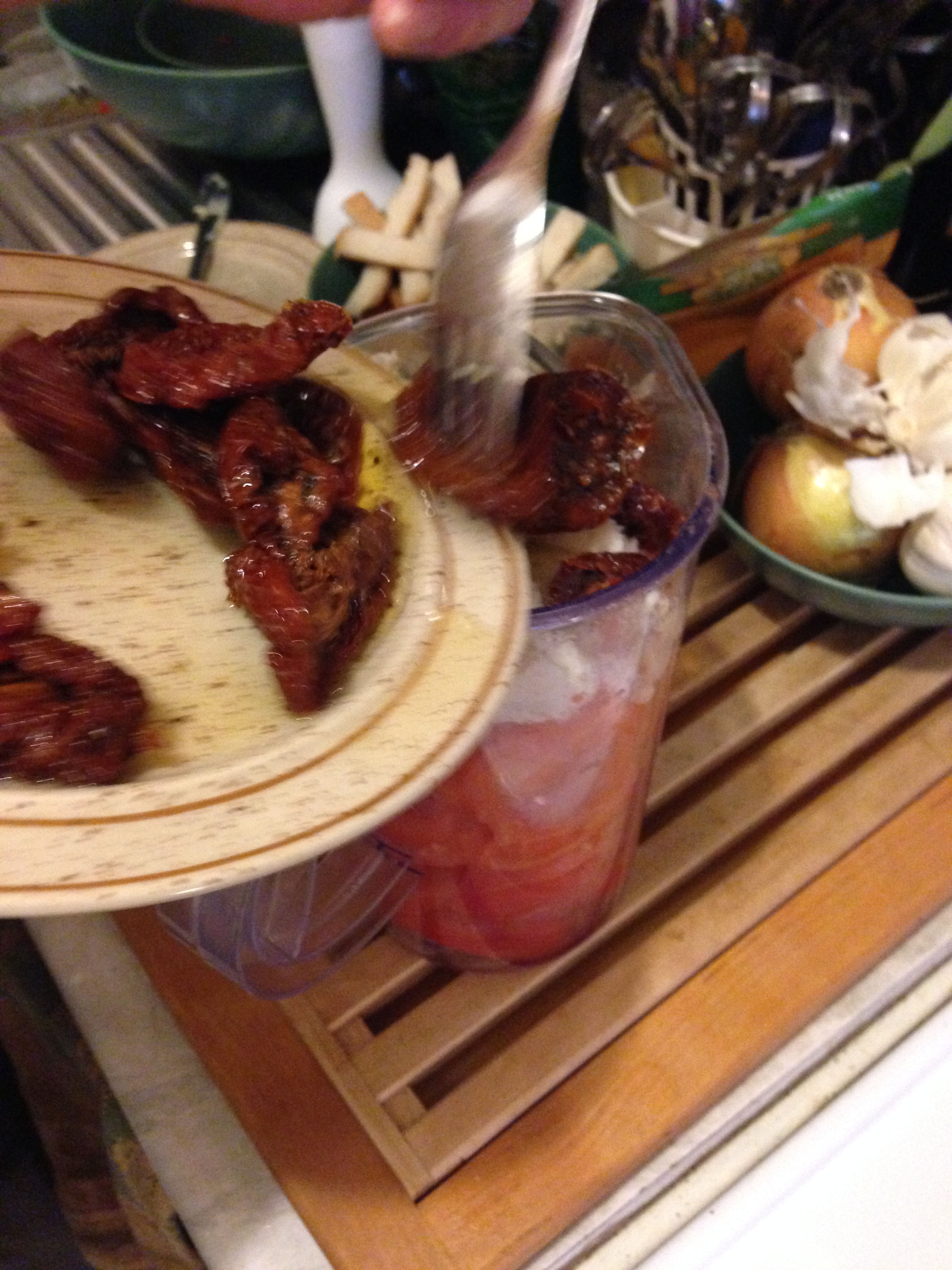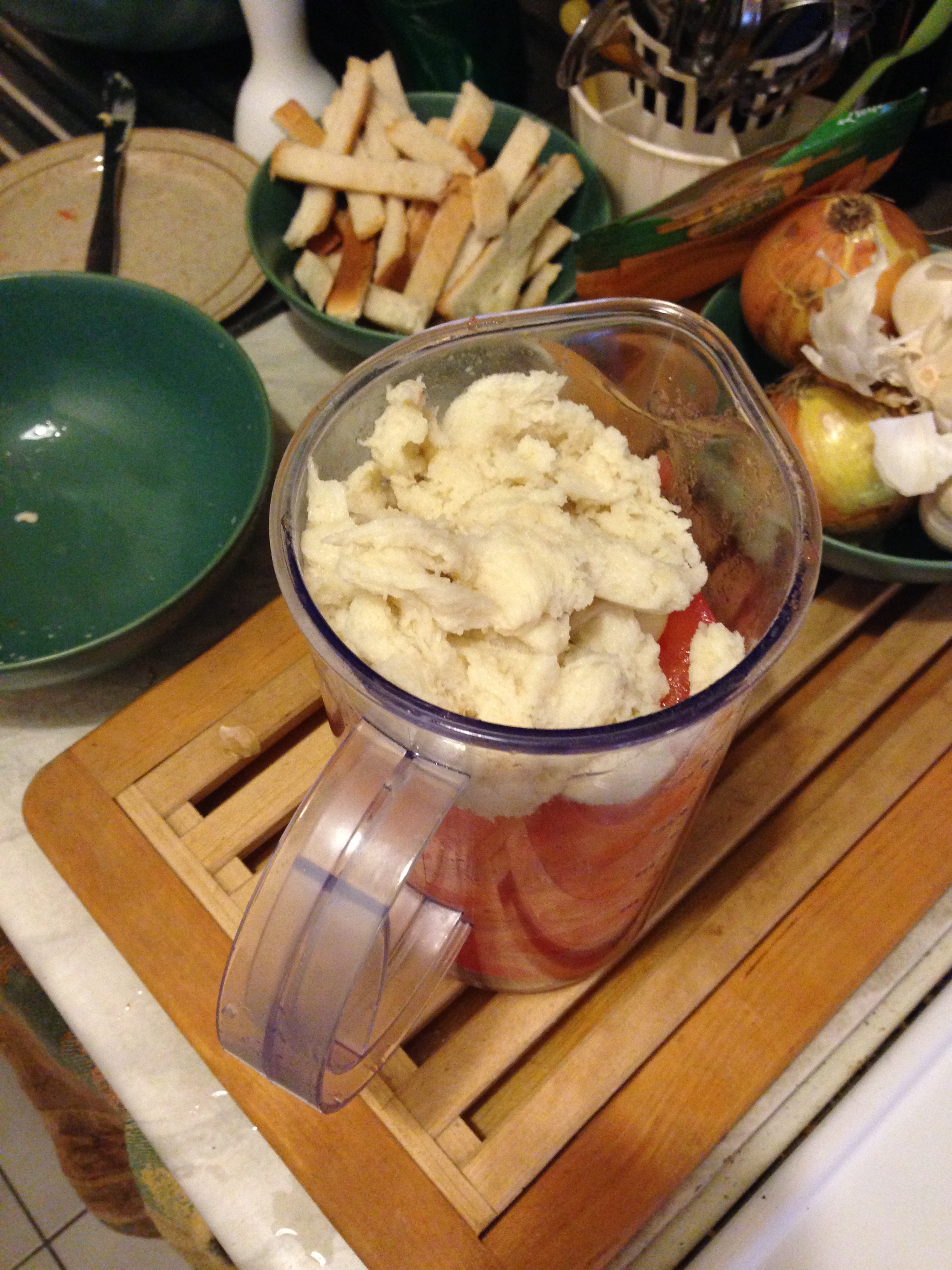 5. In a hand blender beaker (or any other deep blending bowl), put tomatoes, garlic, bread, sun-dried tomatoes and vinegar.