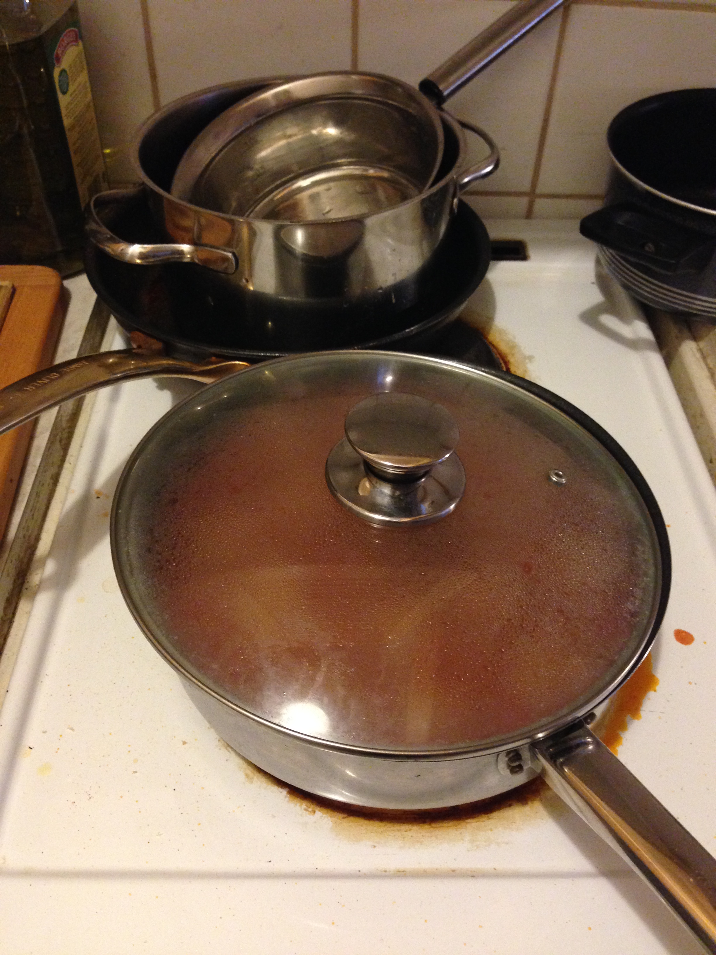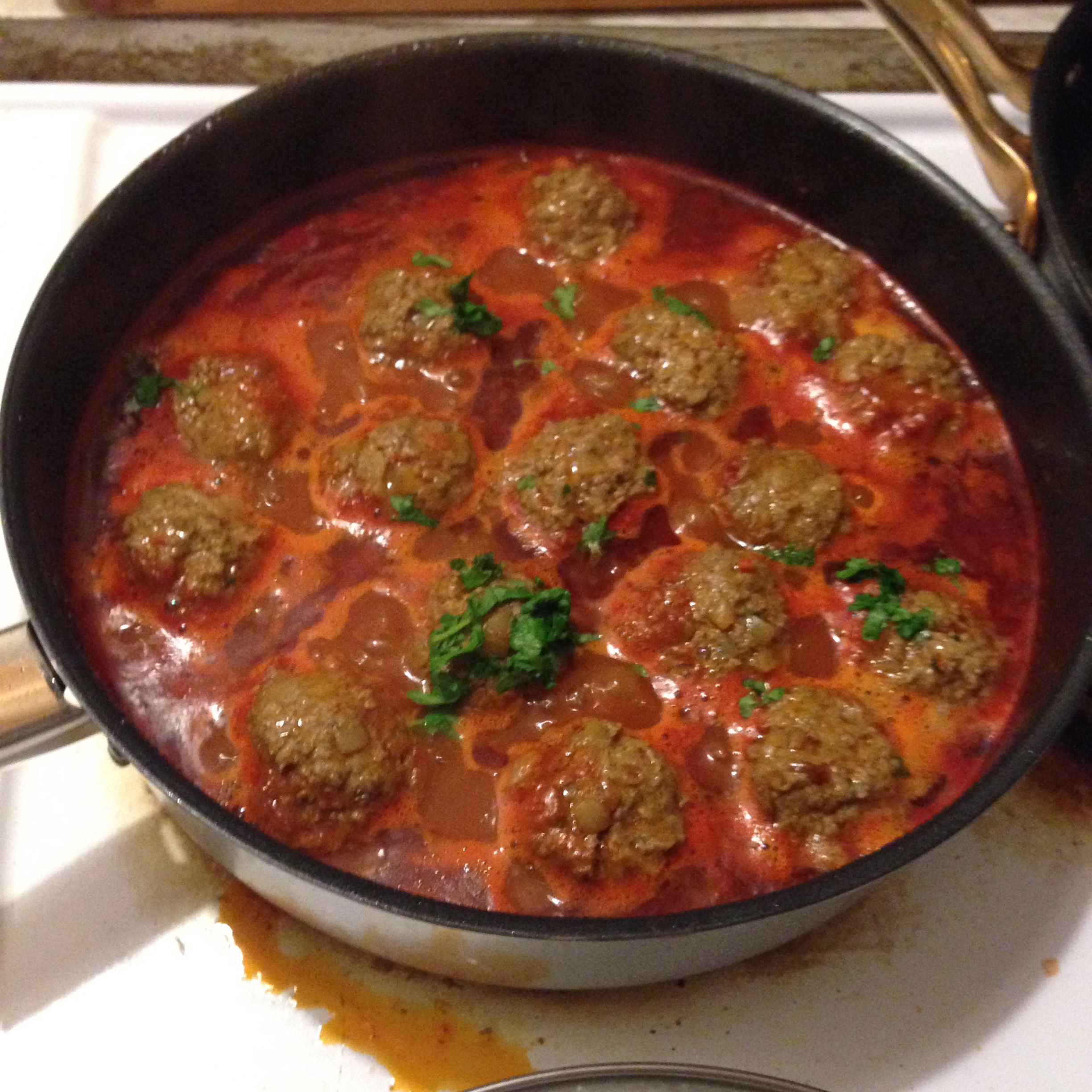 16. When the sauce is cooked, add meatballs as seen in the photo. Add rest of parsley. Cover the pan and let it simmer for about 15 minutes.