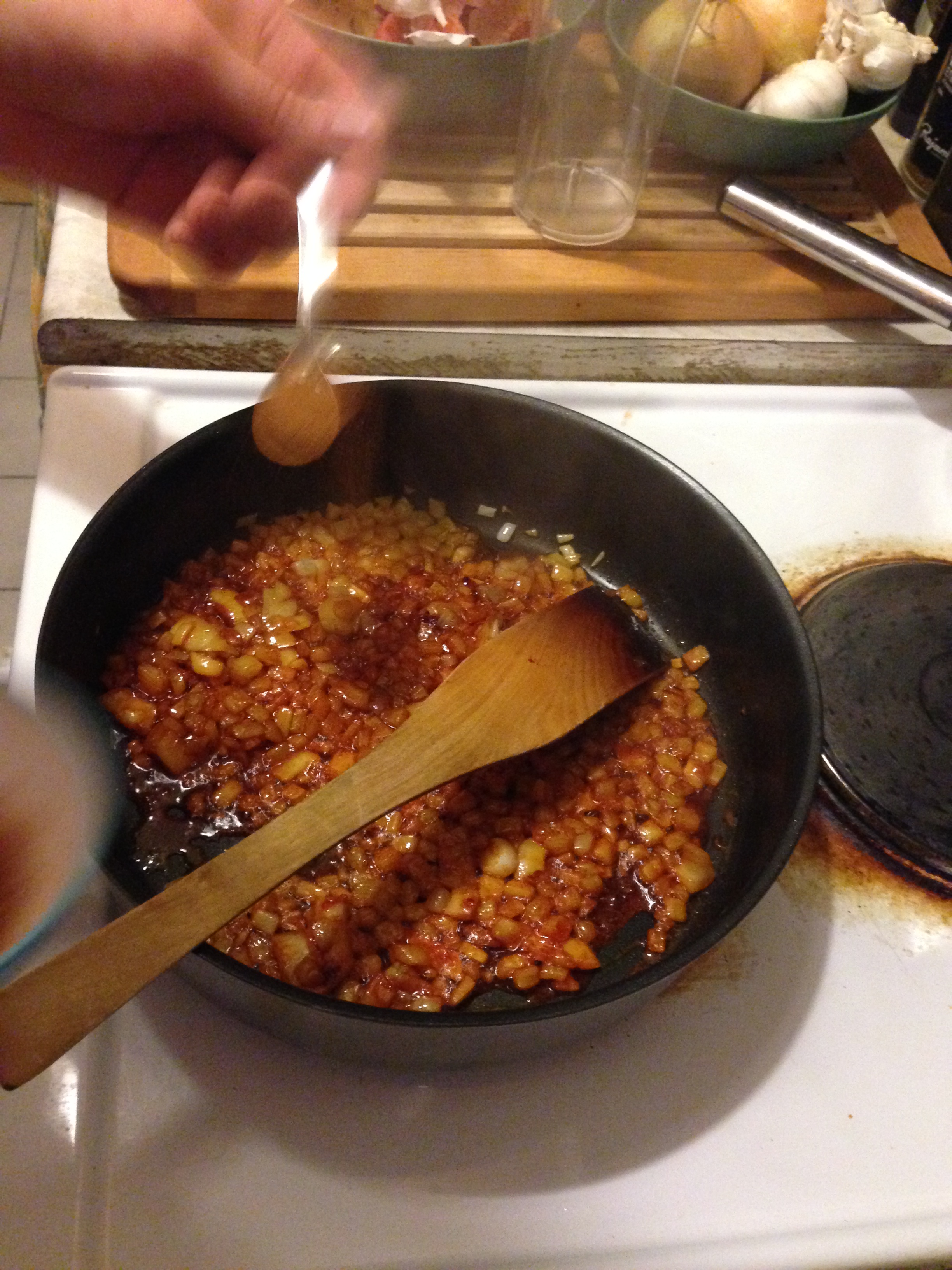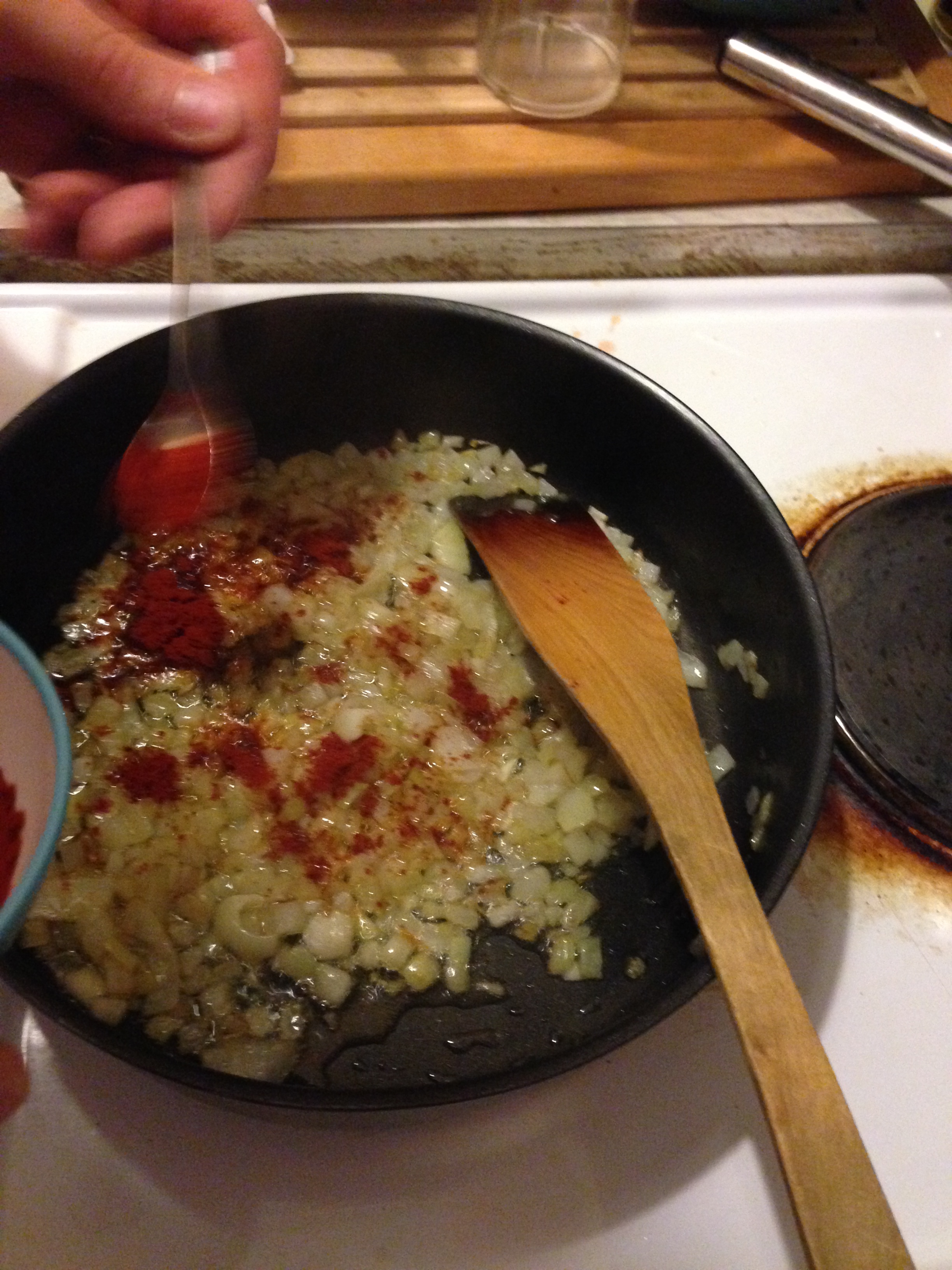 8. To the onion, add 1/2 tsp / 2.5 ml ground cinnamon, crushed garlics, 1 tsp / 5 ml pimiento and chilli pepper and continue stirring for 1 more minute.