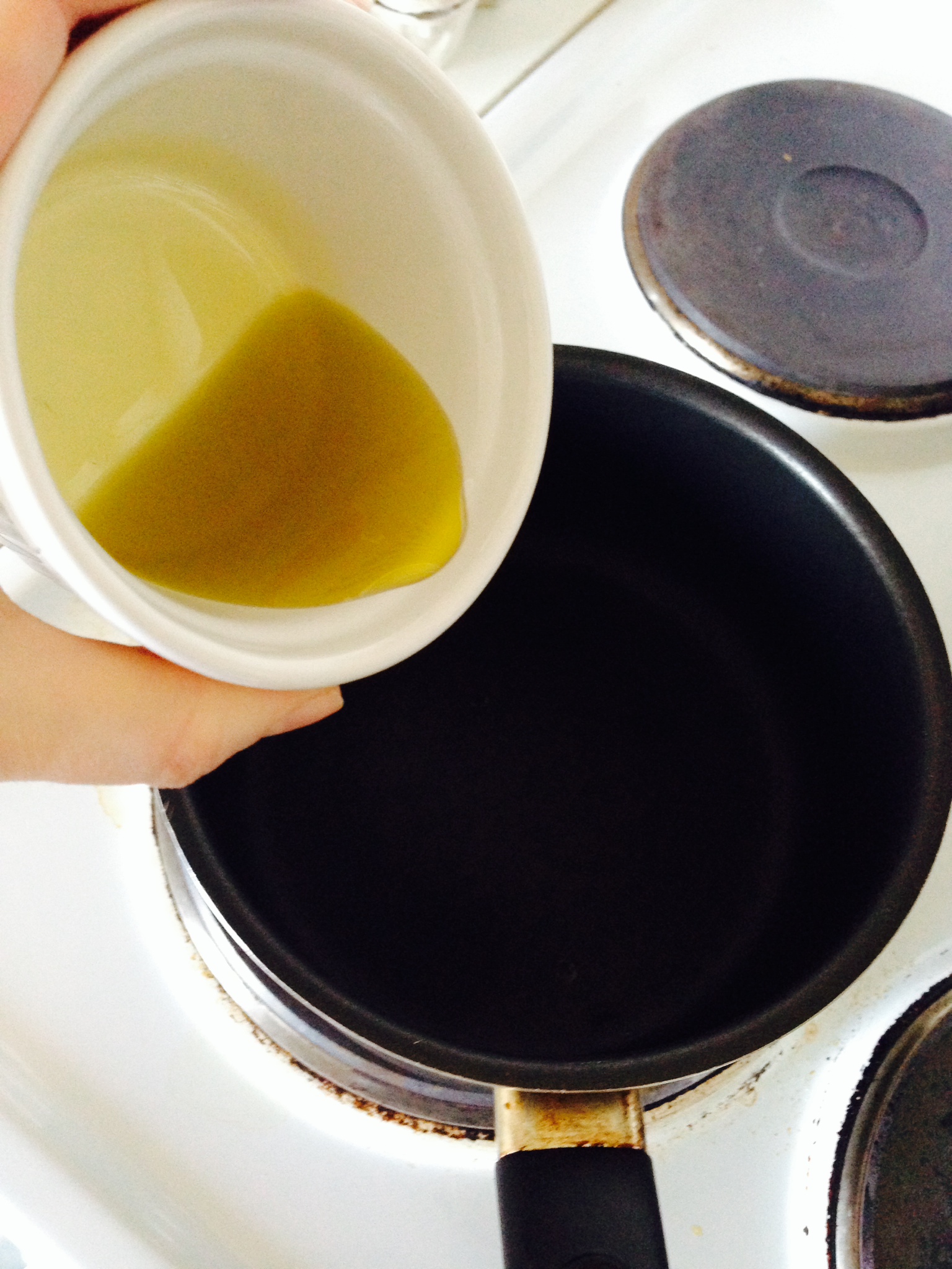 2. Put 2 tsp olive oil in a medium pan. Add spring green and sauté in medium high heat by stirring constantly, for about 5 minutes or until the greens absorb most of the oil and start getting softer.