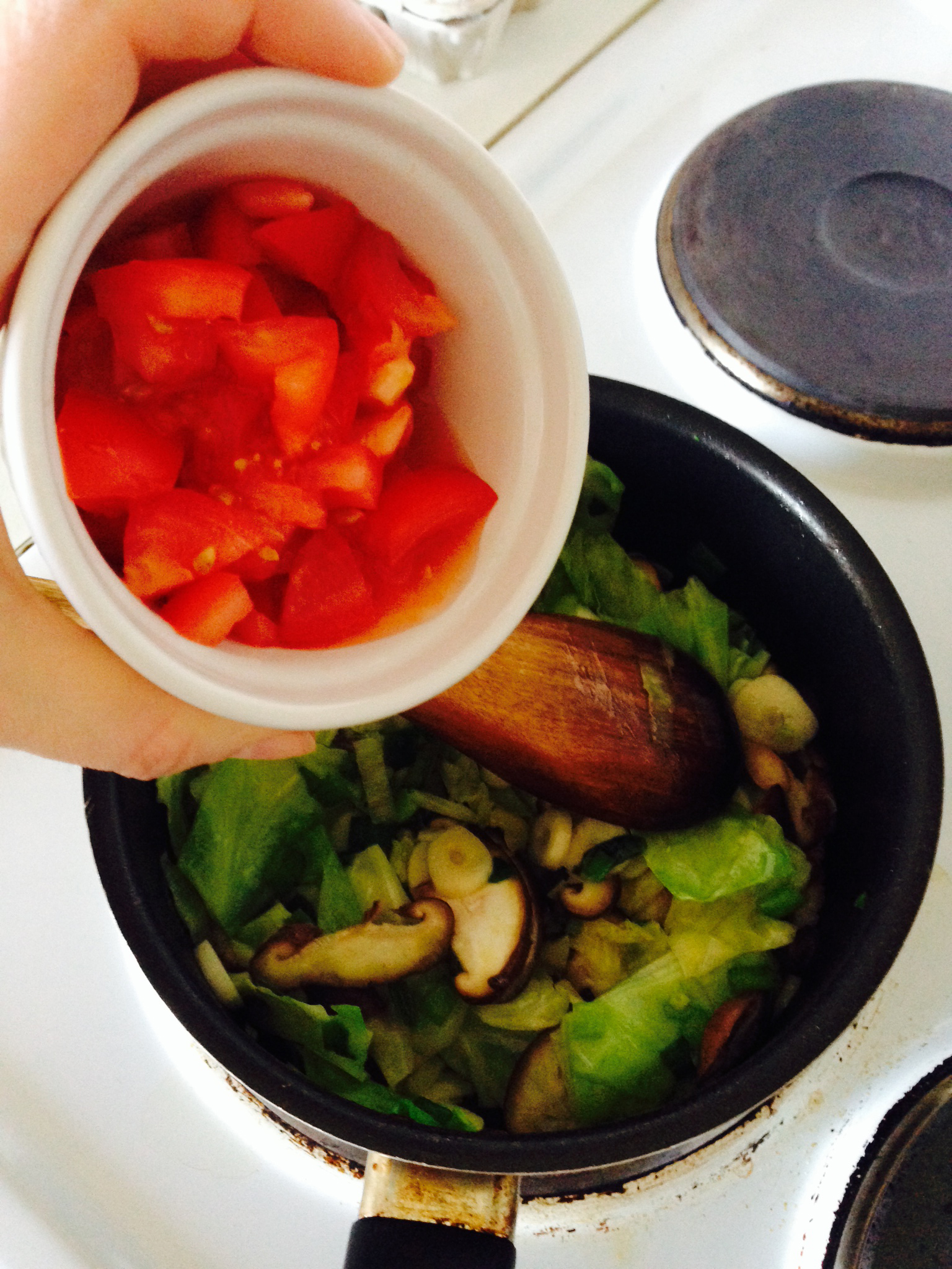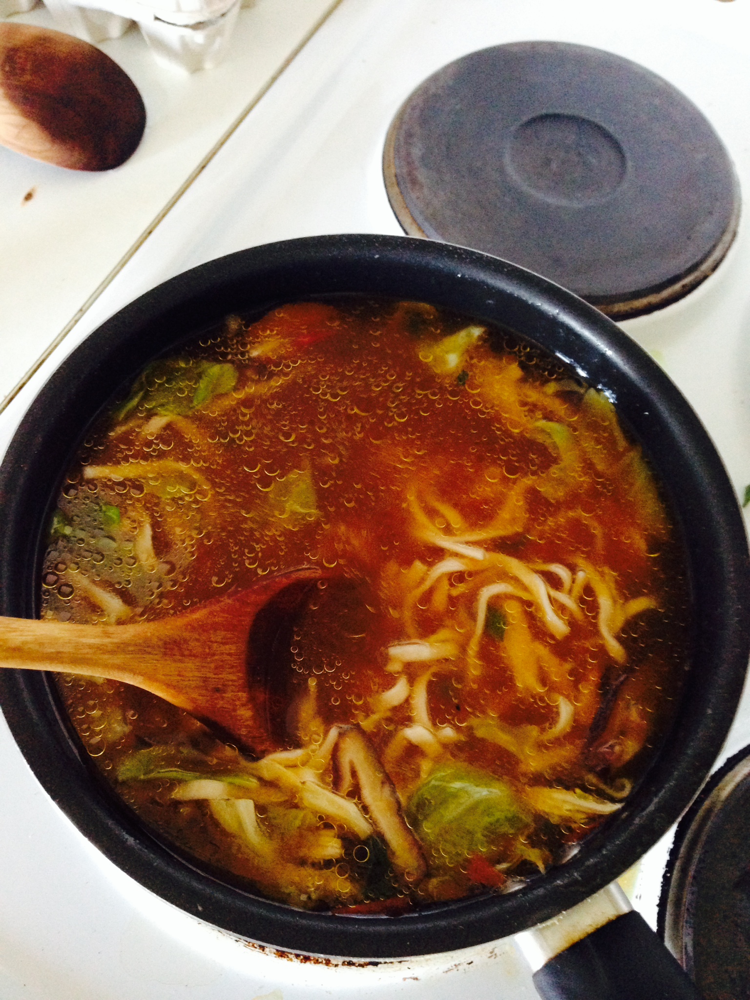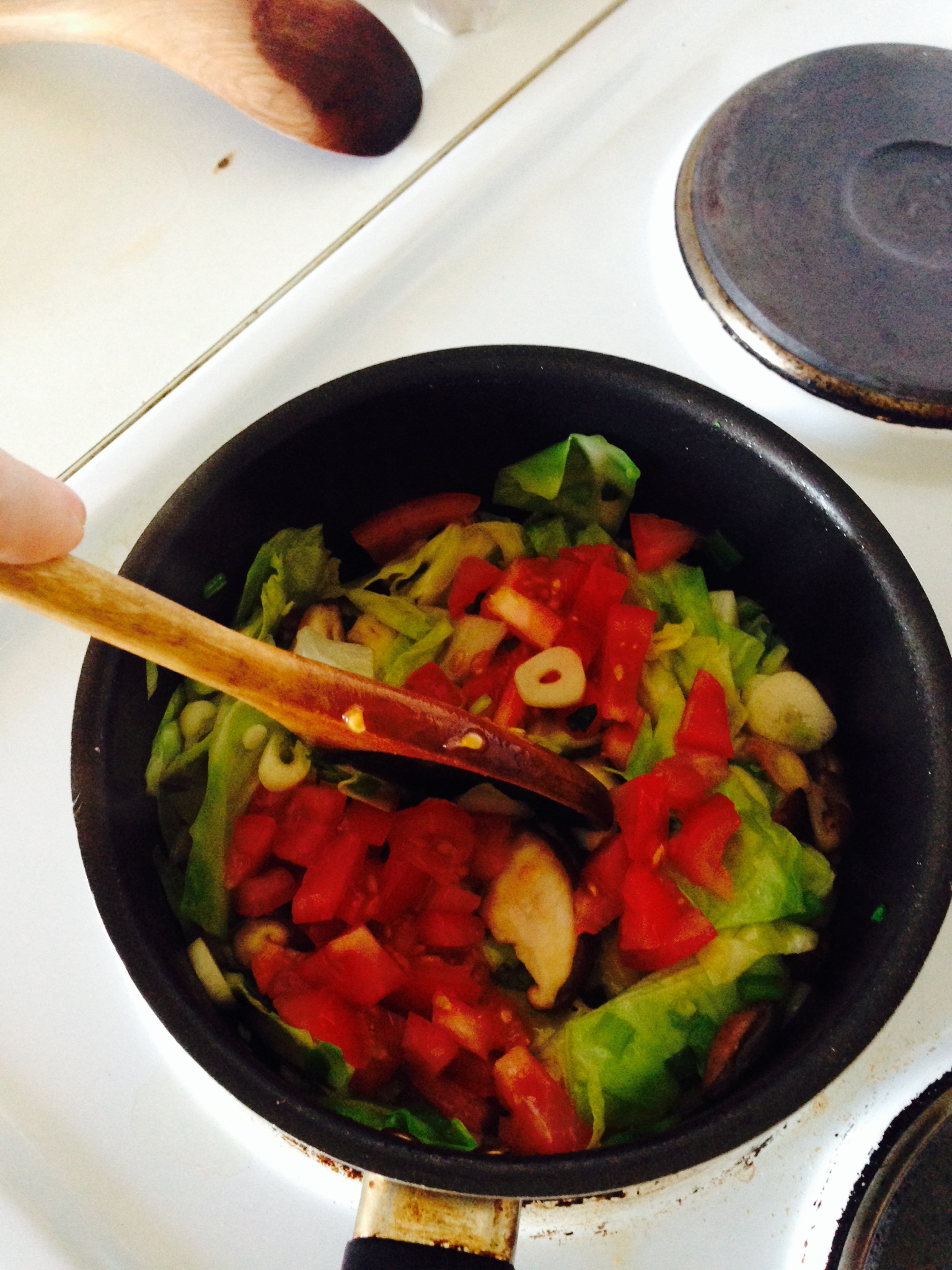 I was actually planning to cook some kind of soup already for that day but the question was what kind. I knew that I wanted a few colours in the soup. So there I had, in the end, soup with spring green, spring onion, tomato, chicken and a few different kinds of spices. It was colourful enough for that day!