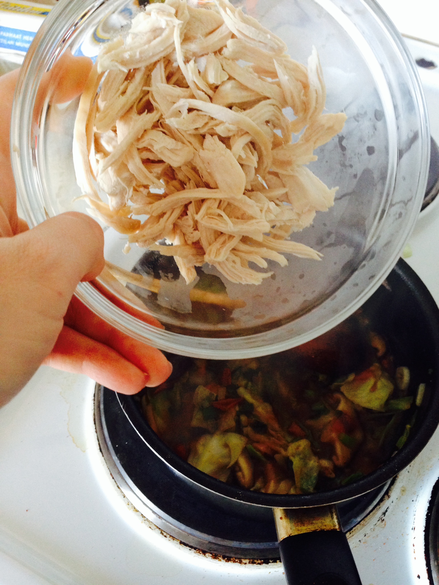 1. As written in the ingredients list above, first boil chicken fillets and shred into pieces. Also cook noodle according to the instructions written on the package. Put chicken and noodles aside.