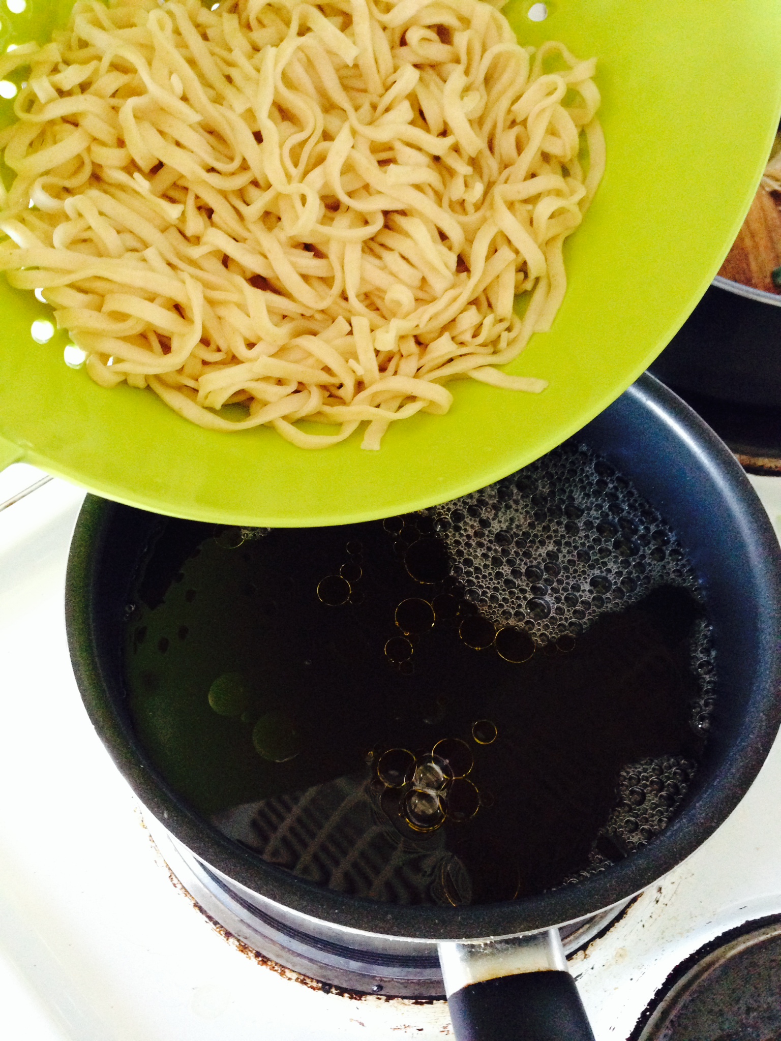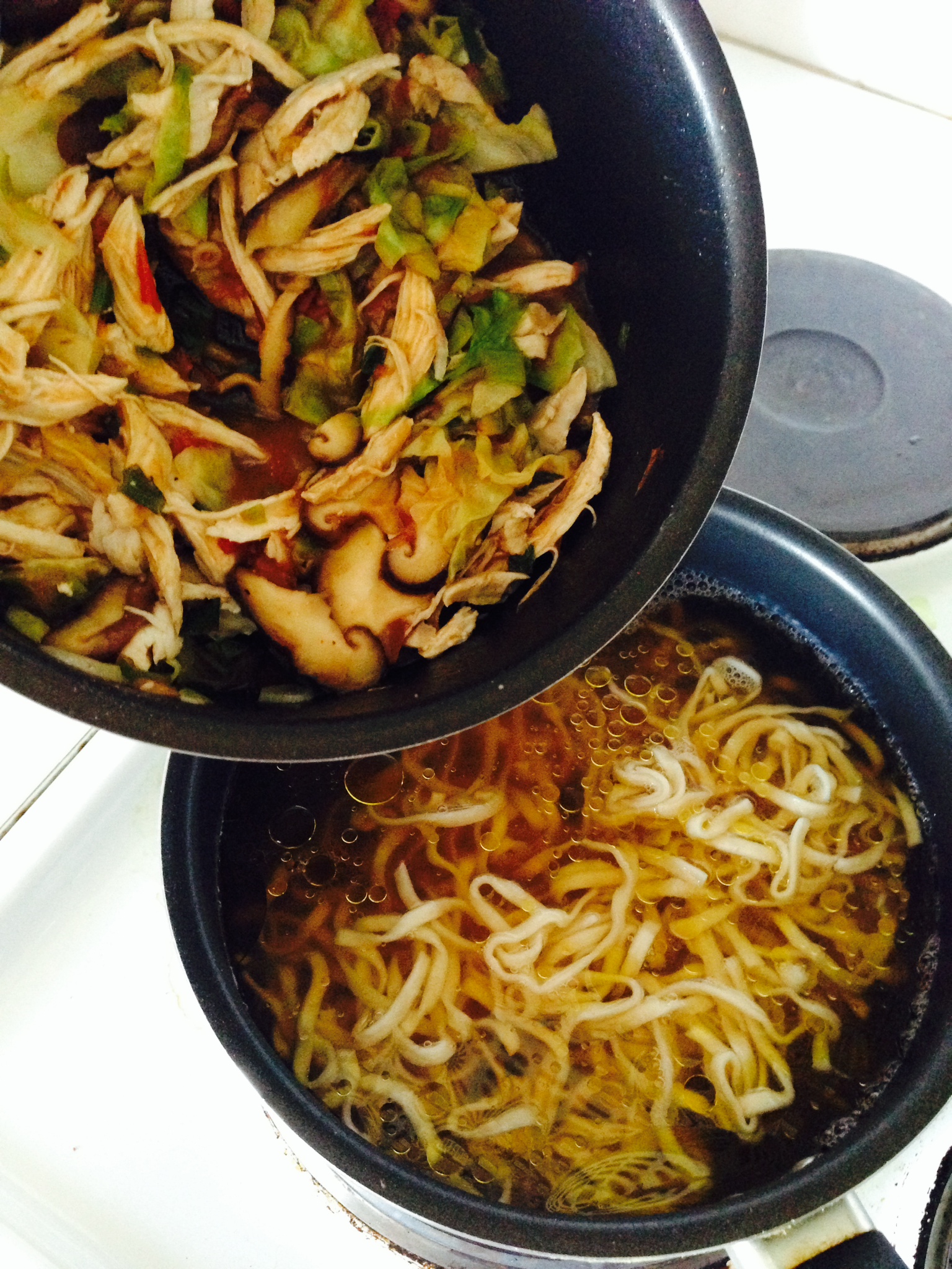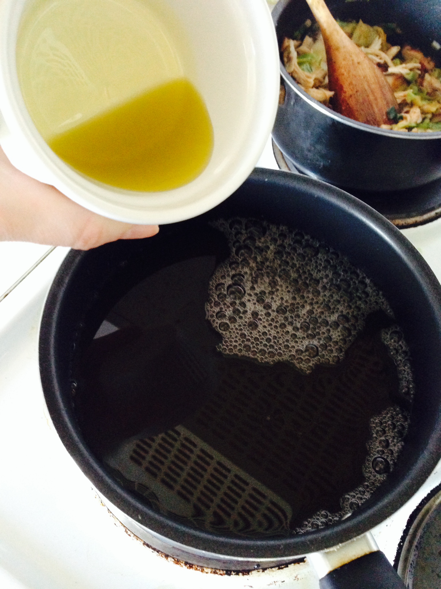 8. Take another pan to cook the final soup and pour chicken broth in it. Add remaining (1 tsp) olive oil, noodle and chicken mixture into the pan, in medium heat, stirring every now and then.