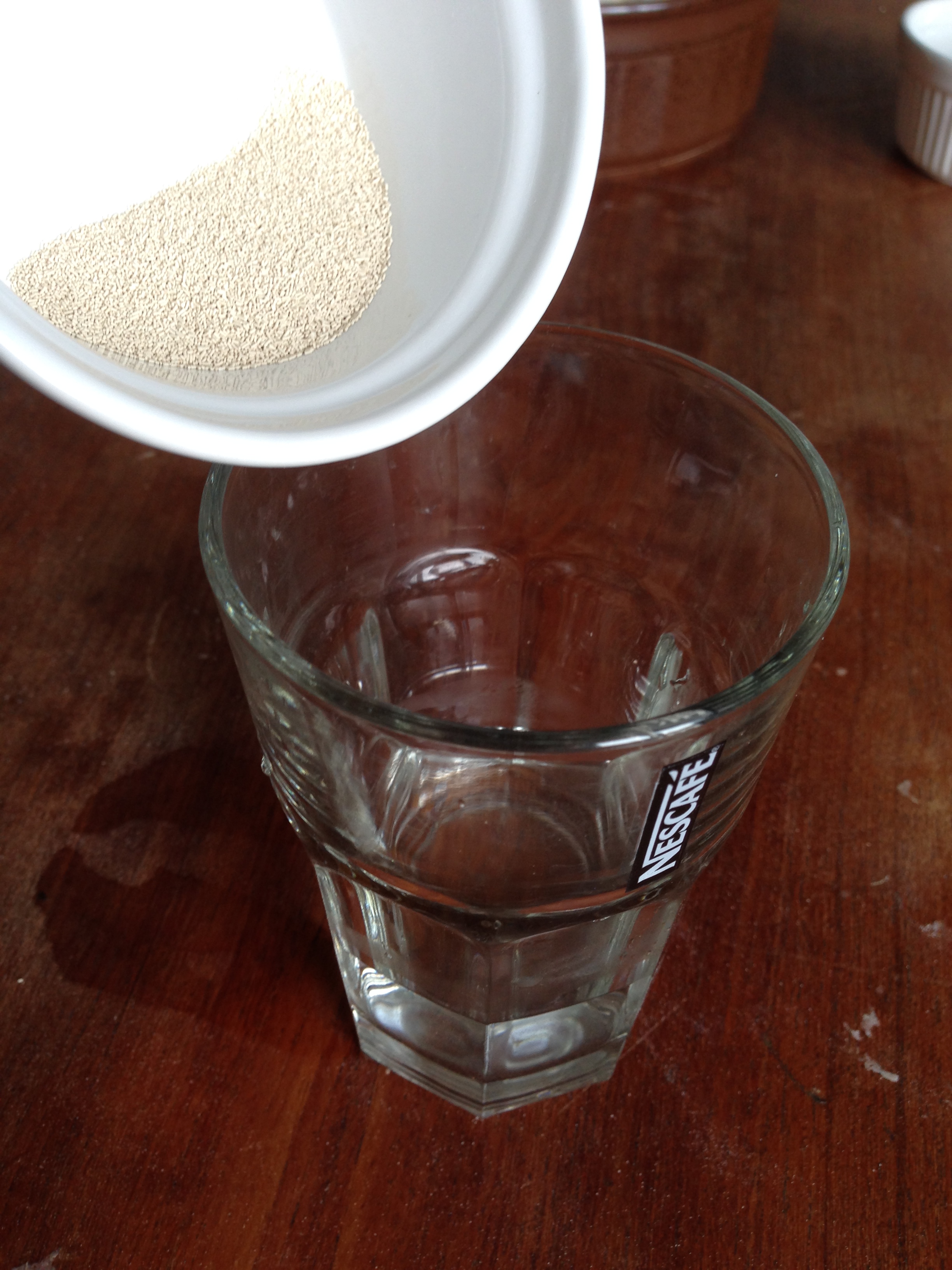1. Pour the yeast inside lukewarm water. Stir a bit and leave it for 15 minutes so that the yeast activates.