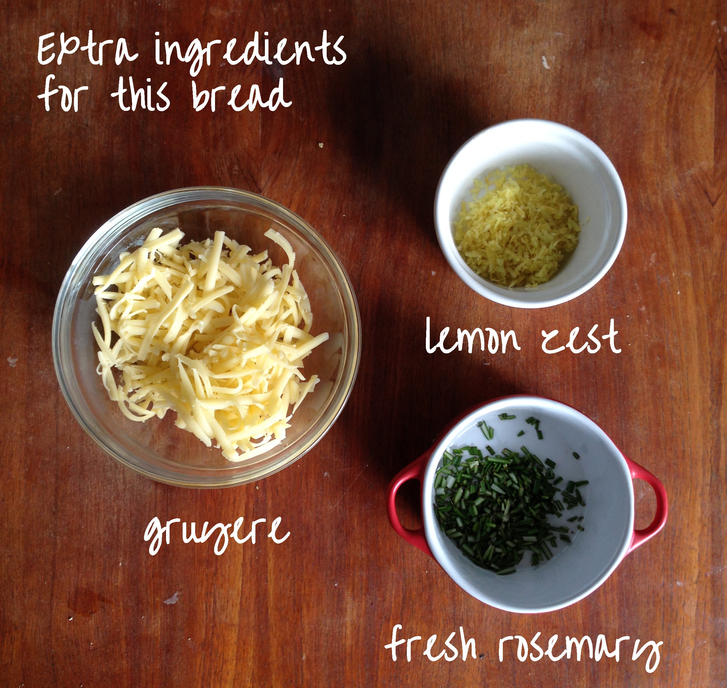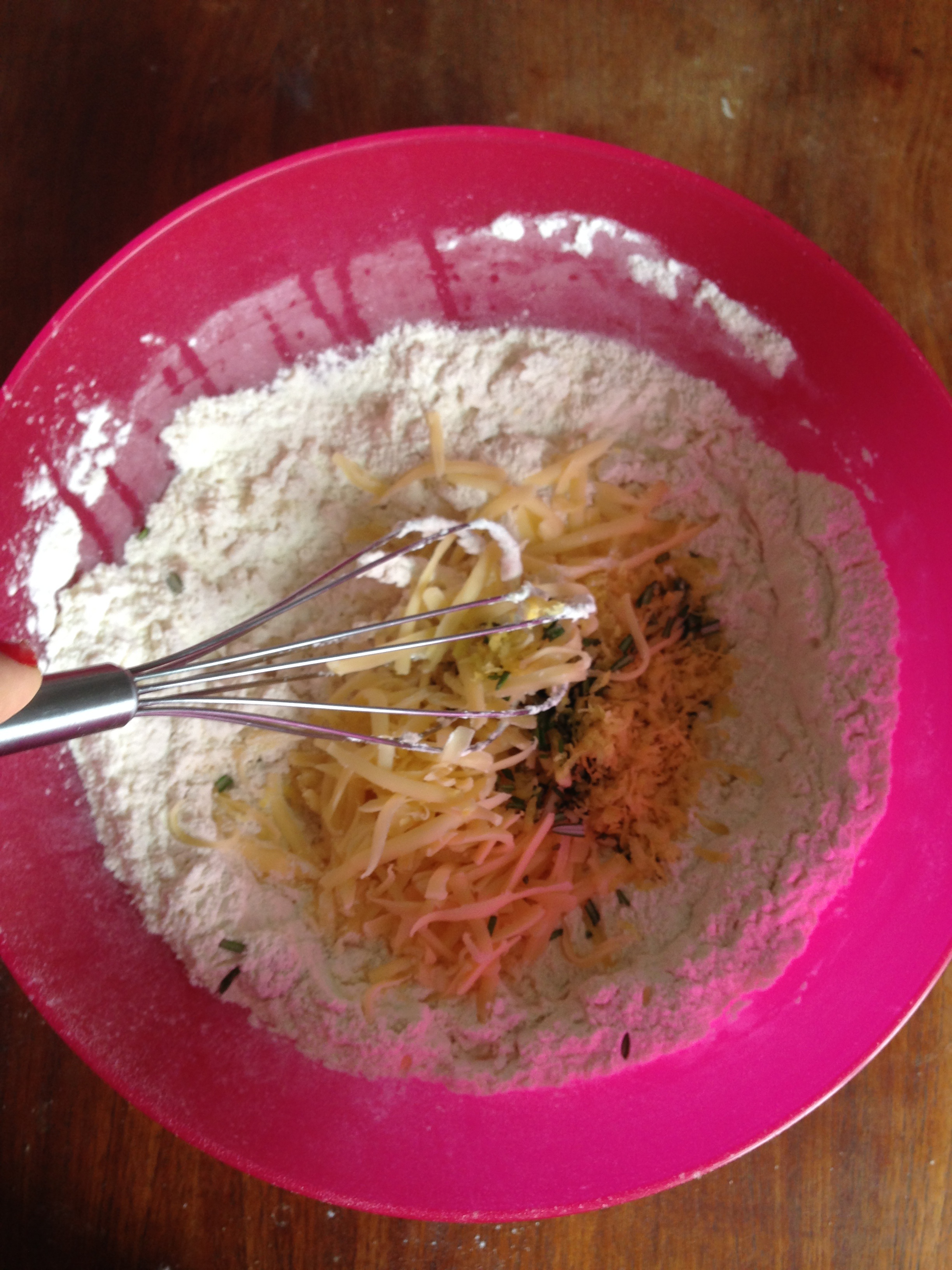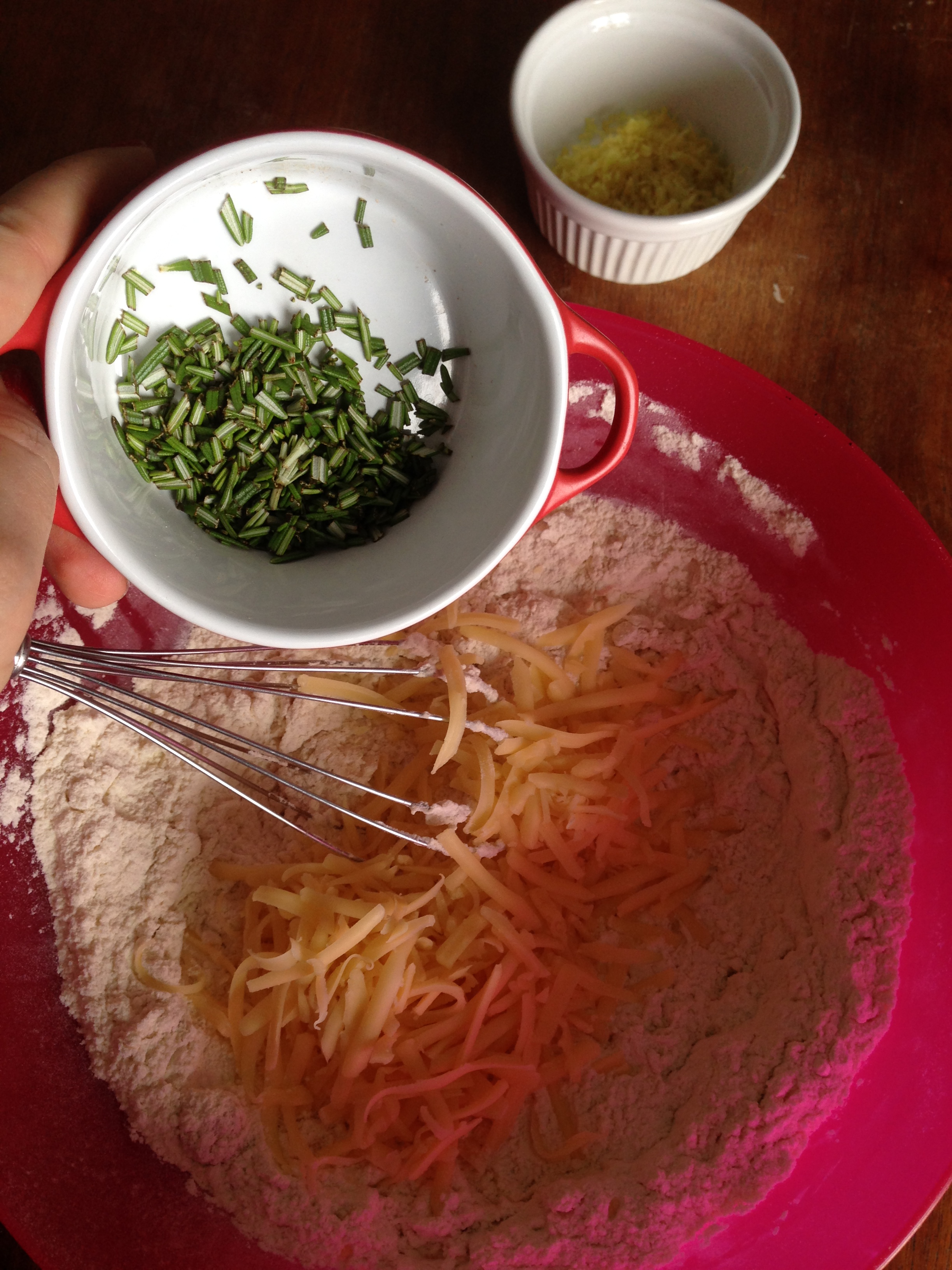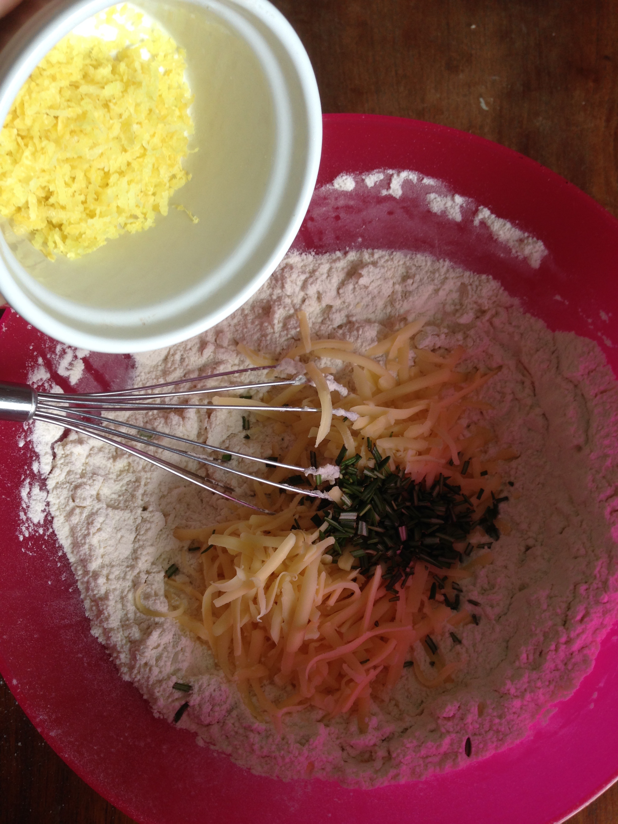 3. To the flour mixture, add gruyere, rosemary and lemon zest and whisk / mix more.