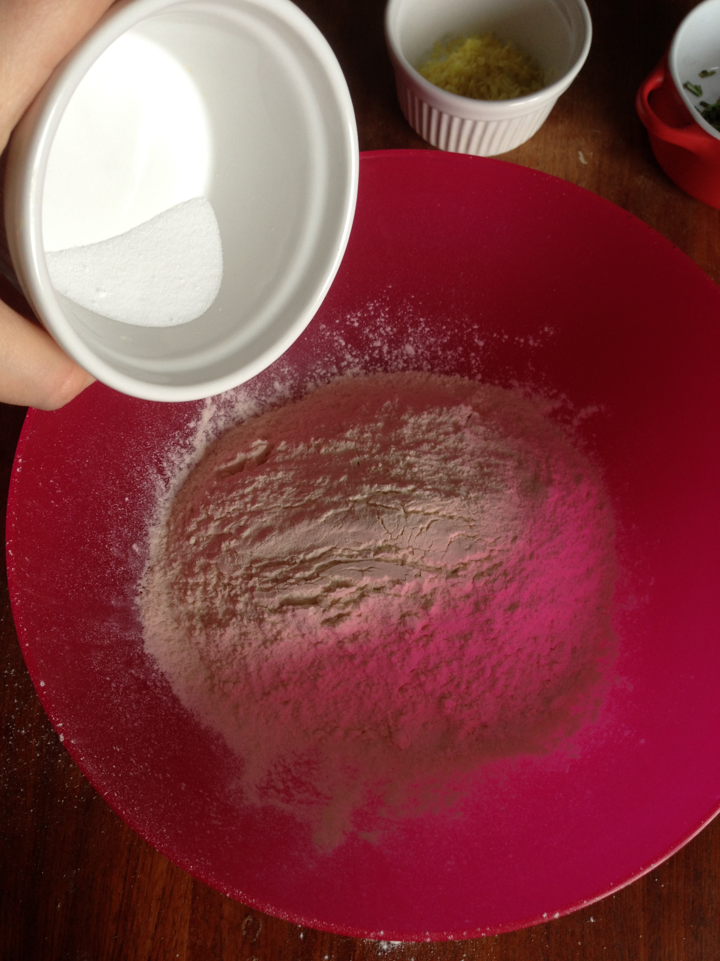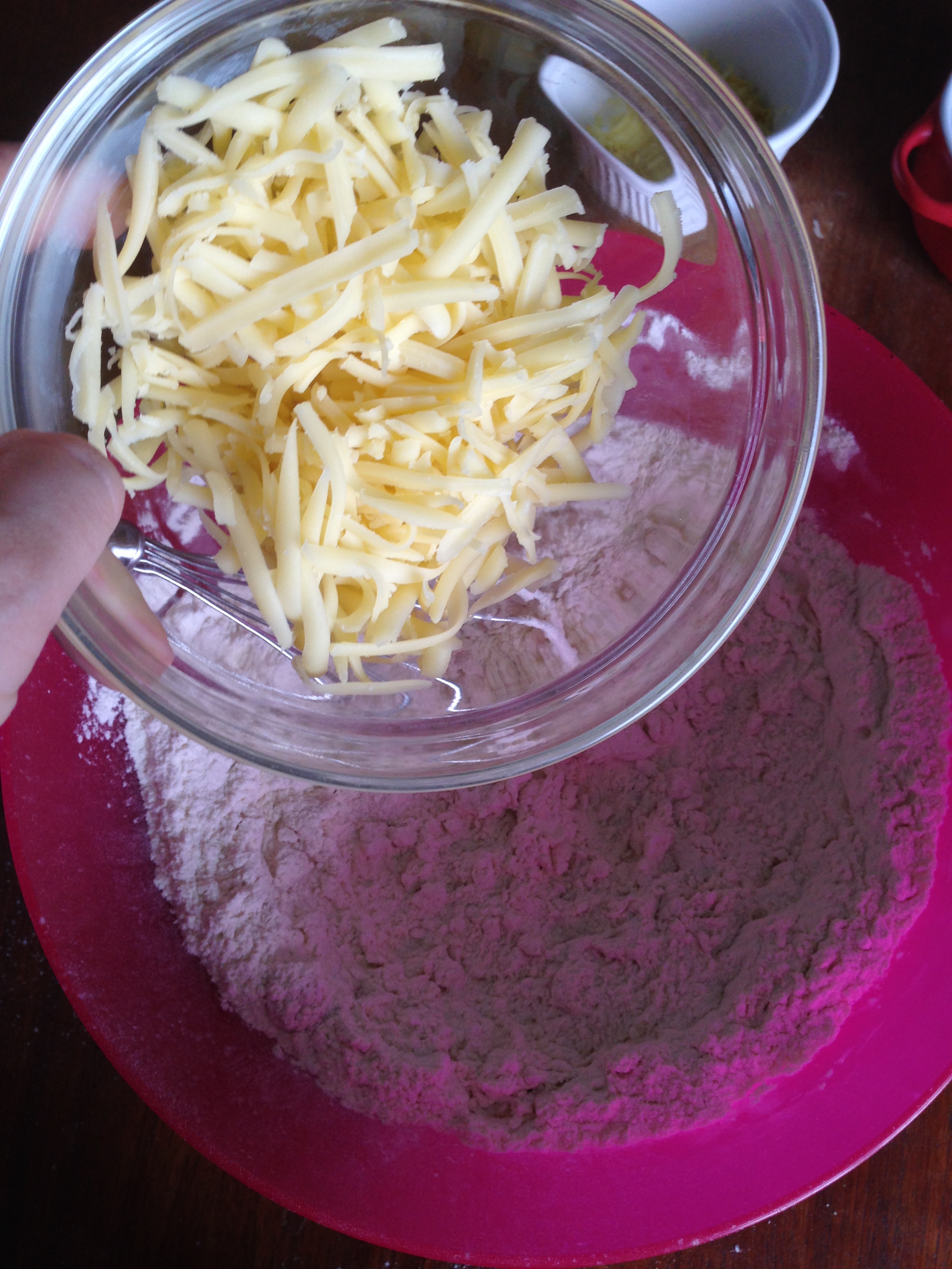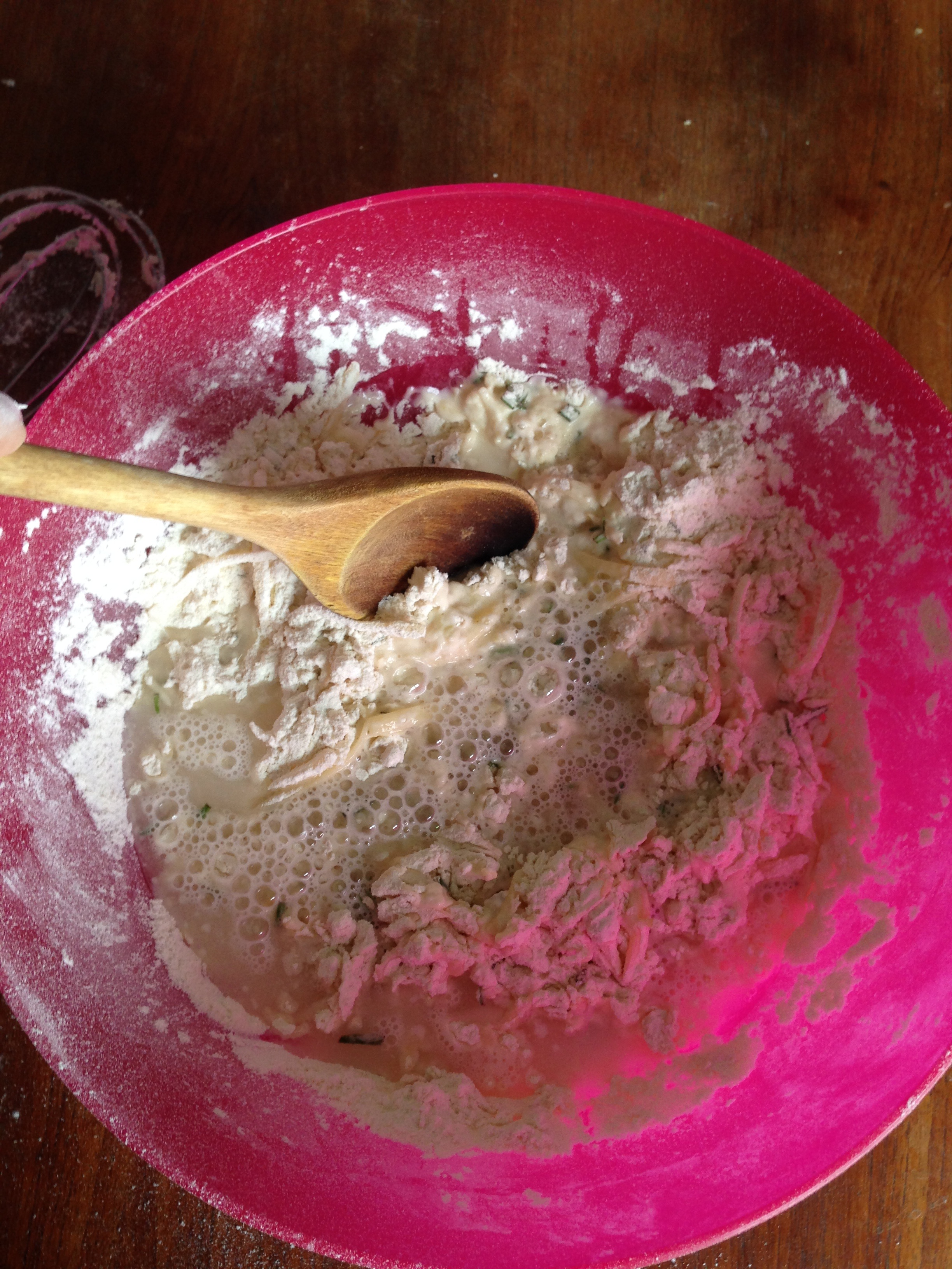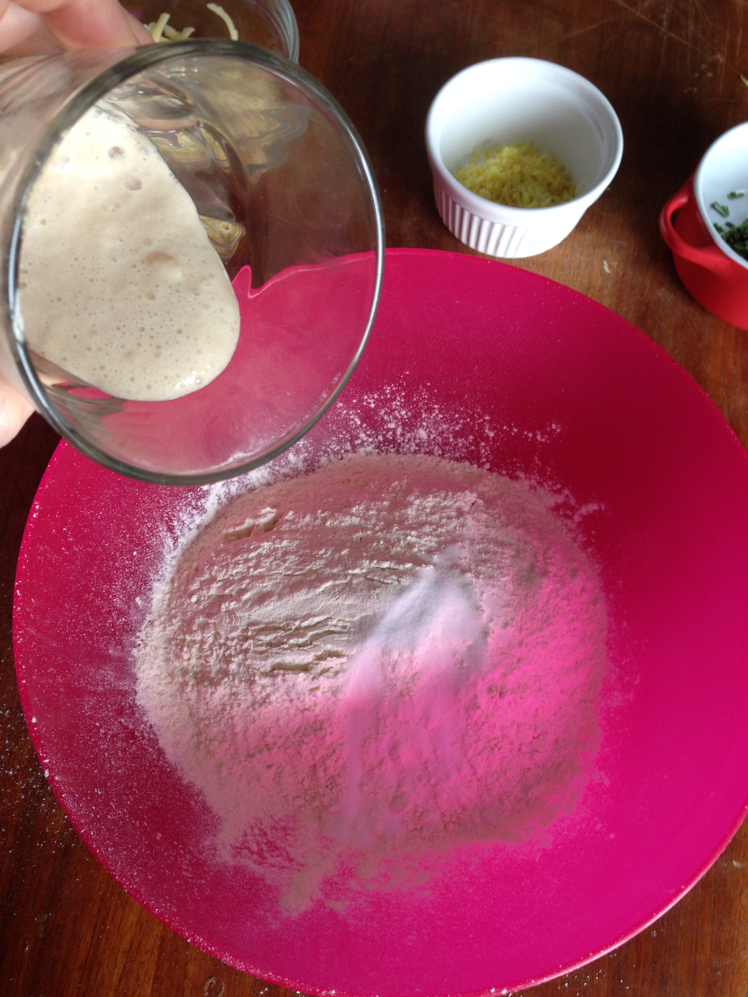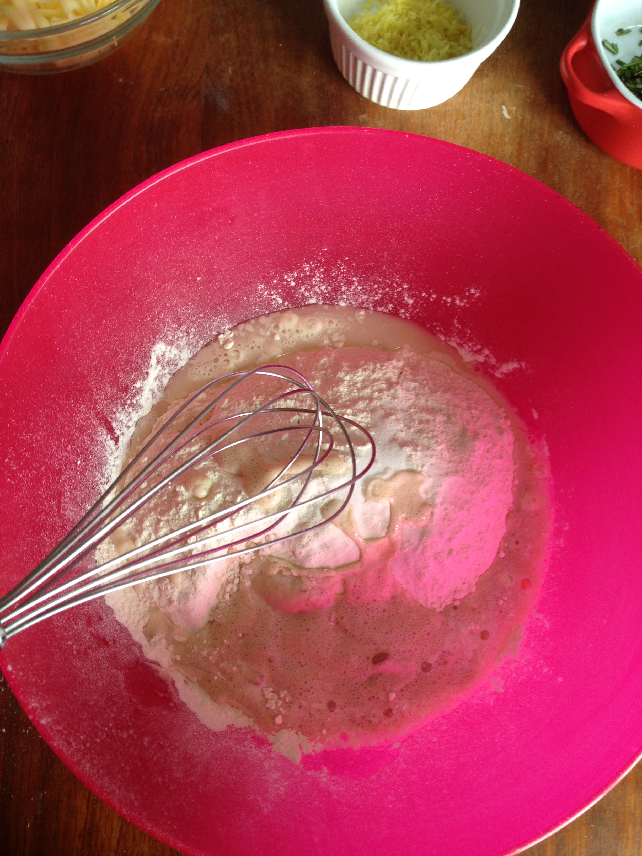 3. To the flour mixture, add gruyere, rosemary and lemon zest and whisk / mix more.
