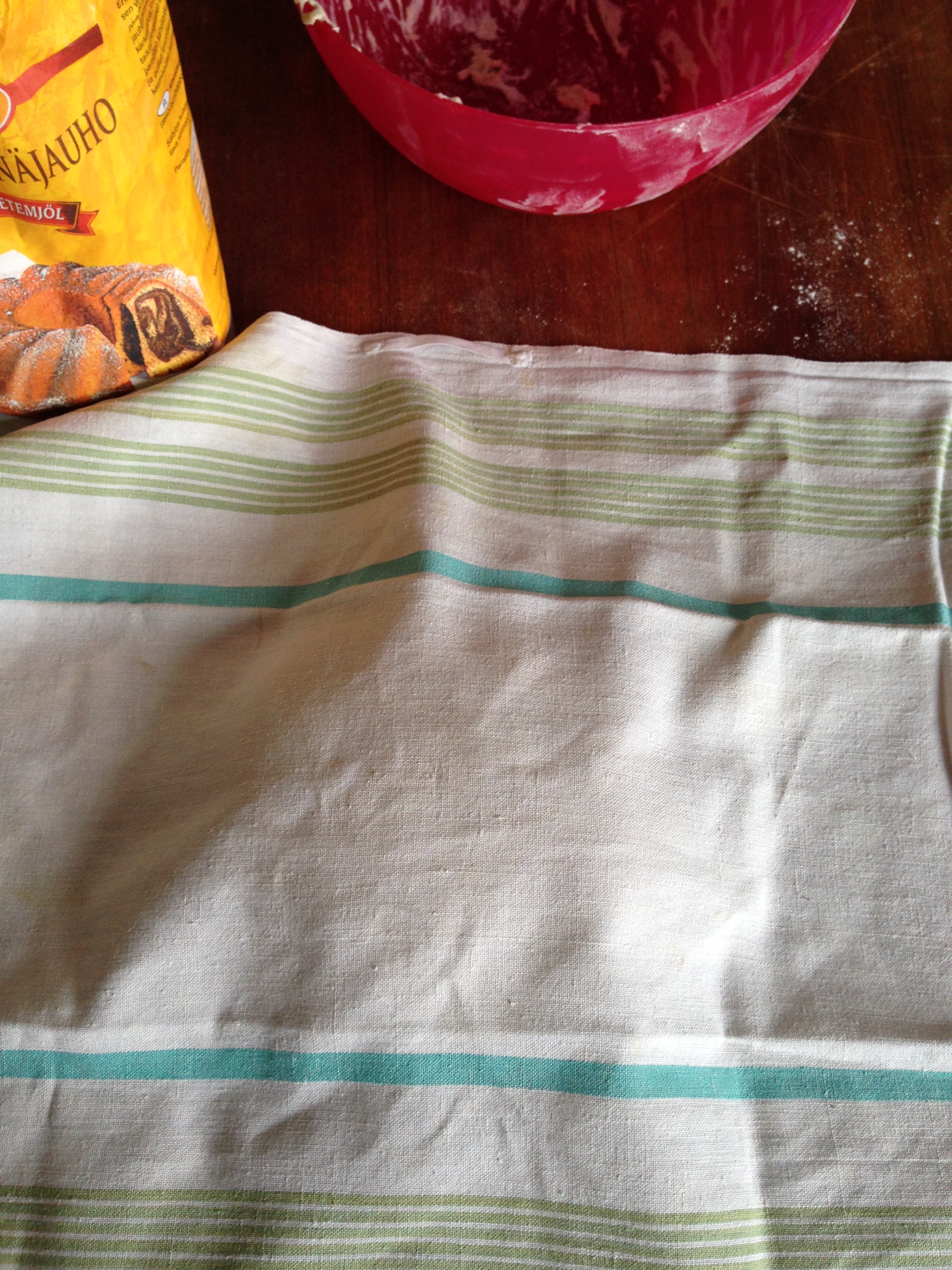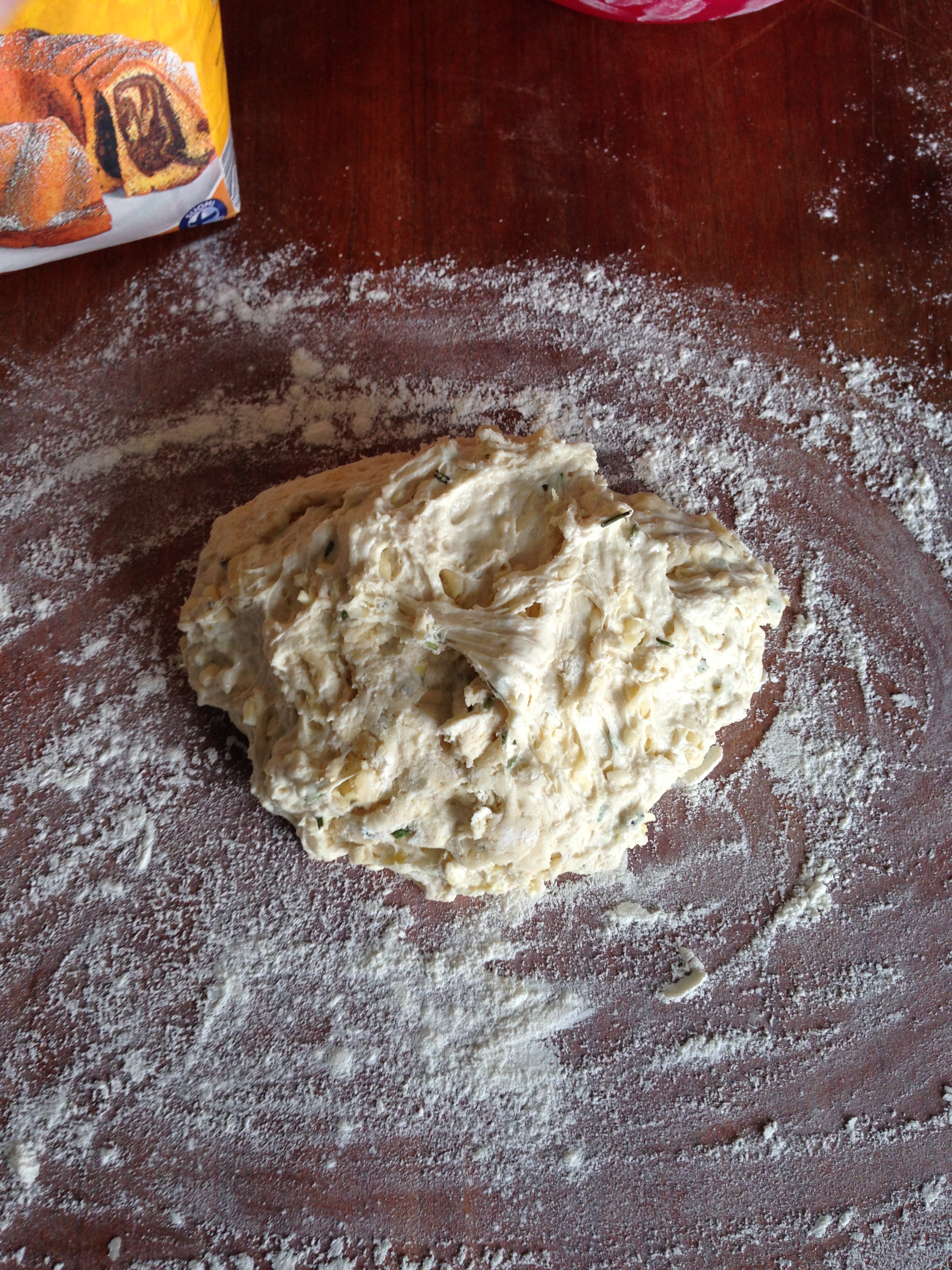 7. Spread a lot of flour on the table / counter (since bread dough is REALLY sticky). Put the dough on the counter. Flour your hands. Make the dough into a round shape – do not knead it, just adjust the shape that’s all. Then cover it again with the cloth and leave for 30 minutes more.