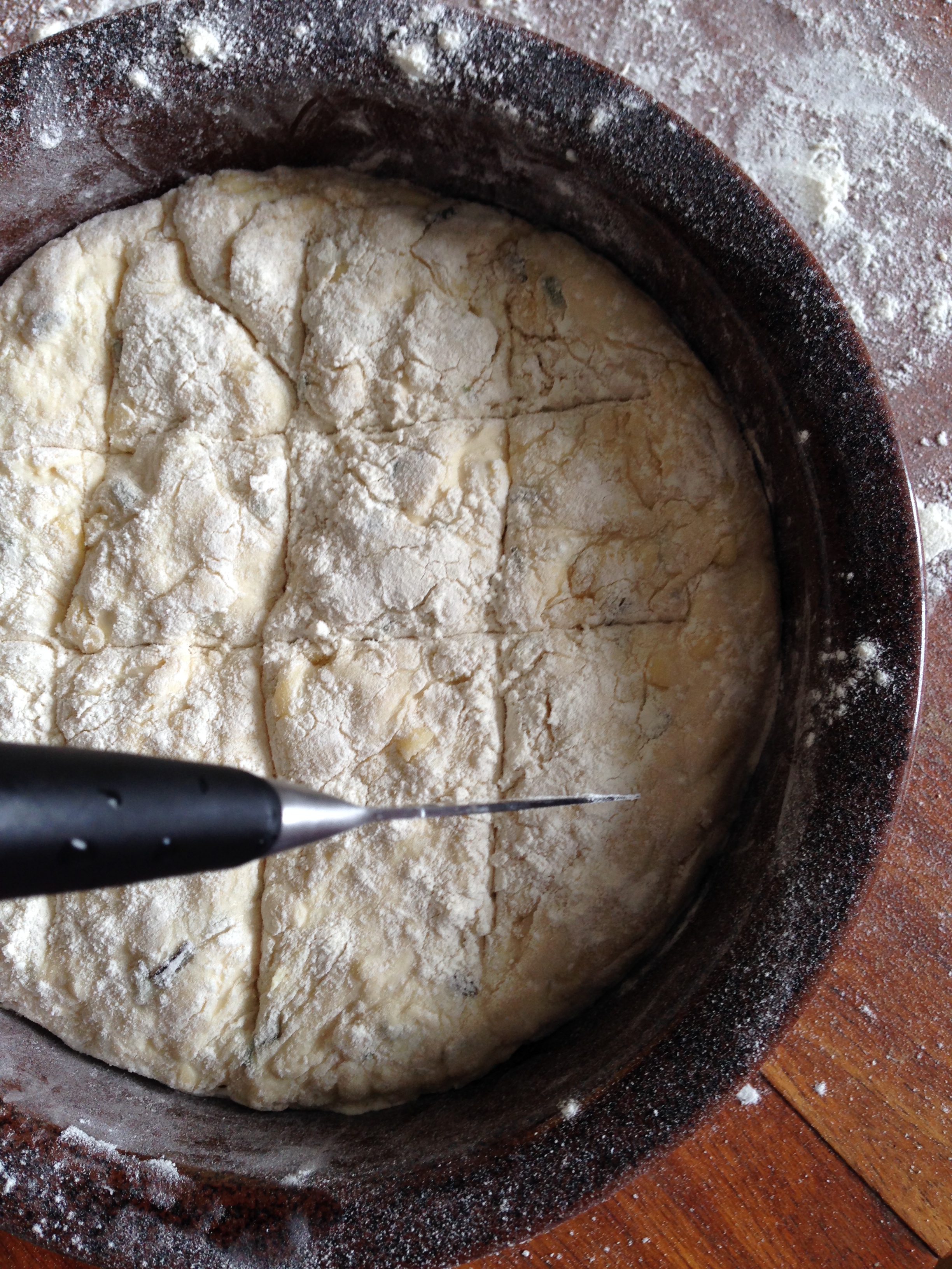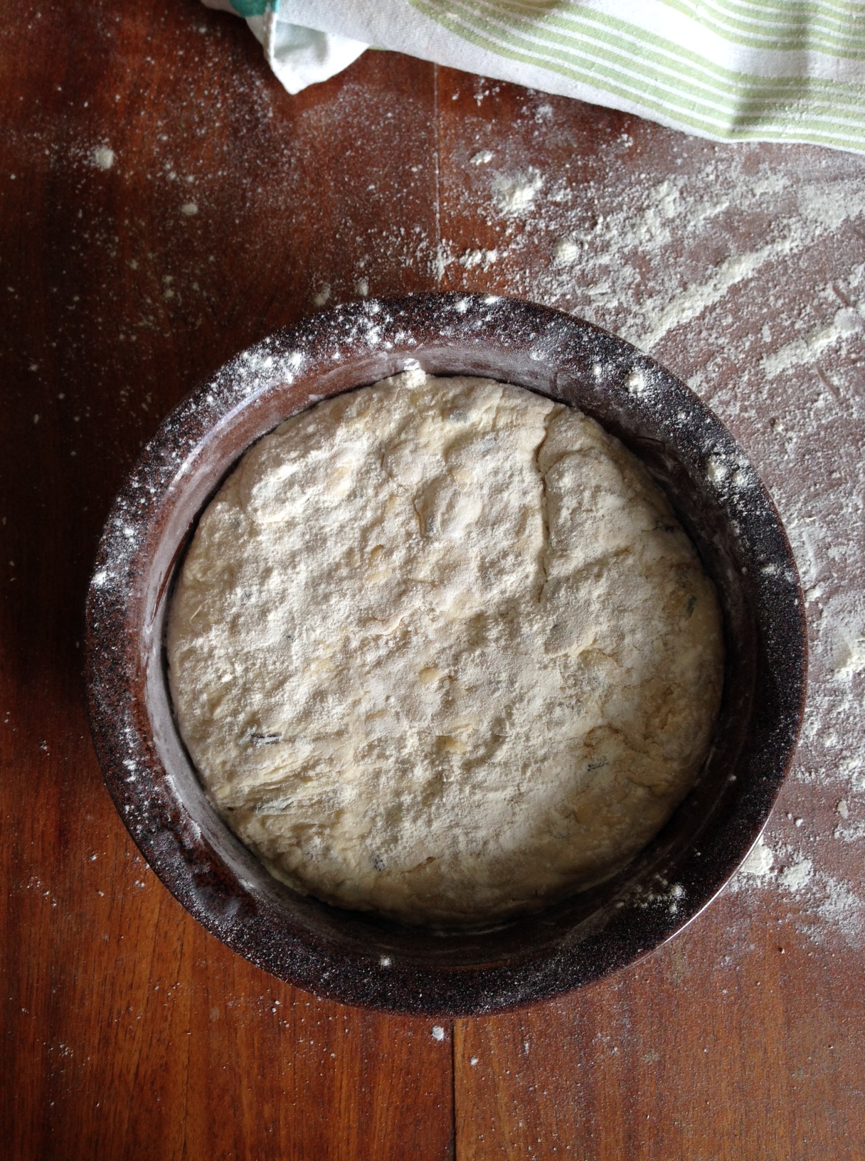 9. When your oven is ready, and you left your bread dough for 30 minutes under the cloth, prepare your dish. I always use a ceramic dish to bake bread. Just spread some flour on the dish. Gently take your dough and put it inside the dish. With a sharp knife, slash the top – or you can even use scissors. I realised that I did not do it deep enough in my bread. But well, no can do. Dust the surface of the bread with a bit of flour and you are ready to bake.