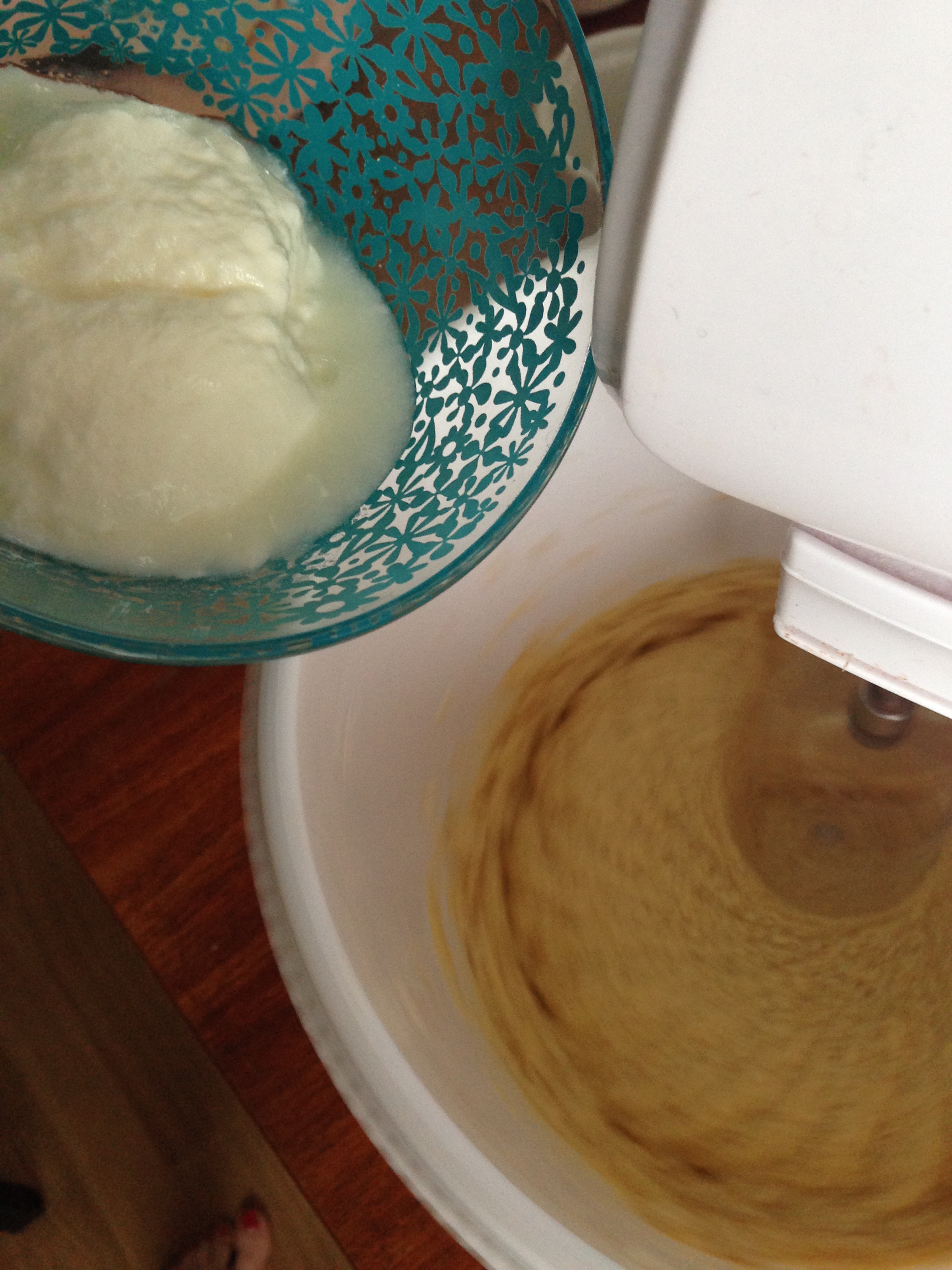 4. Add yogurt, bananas and vanilla extract and continue mixing, until you get a nice and smooth batter.