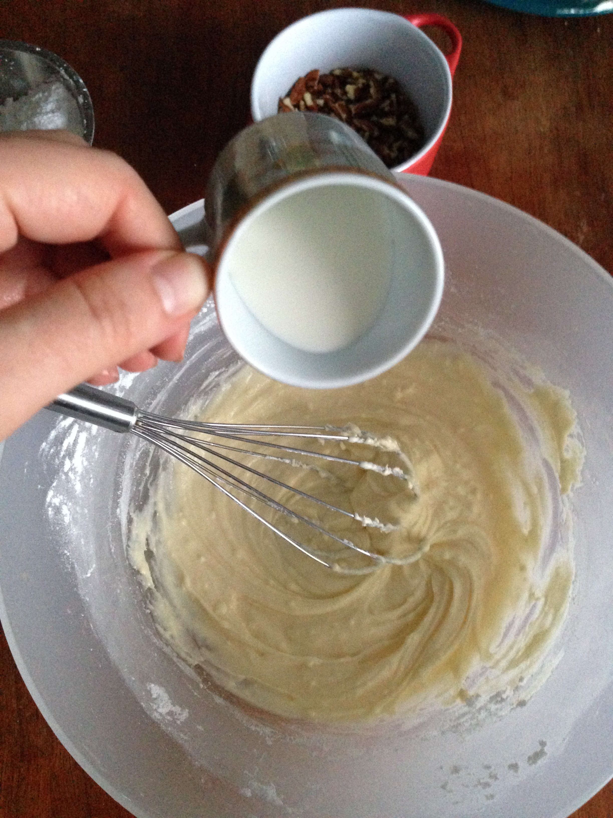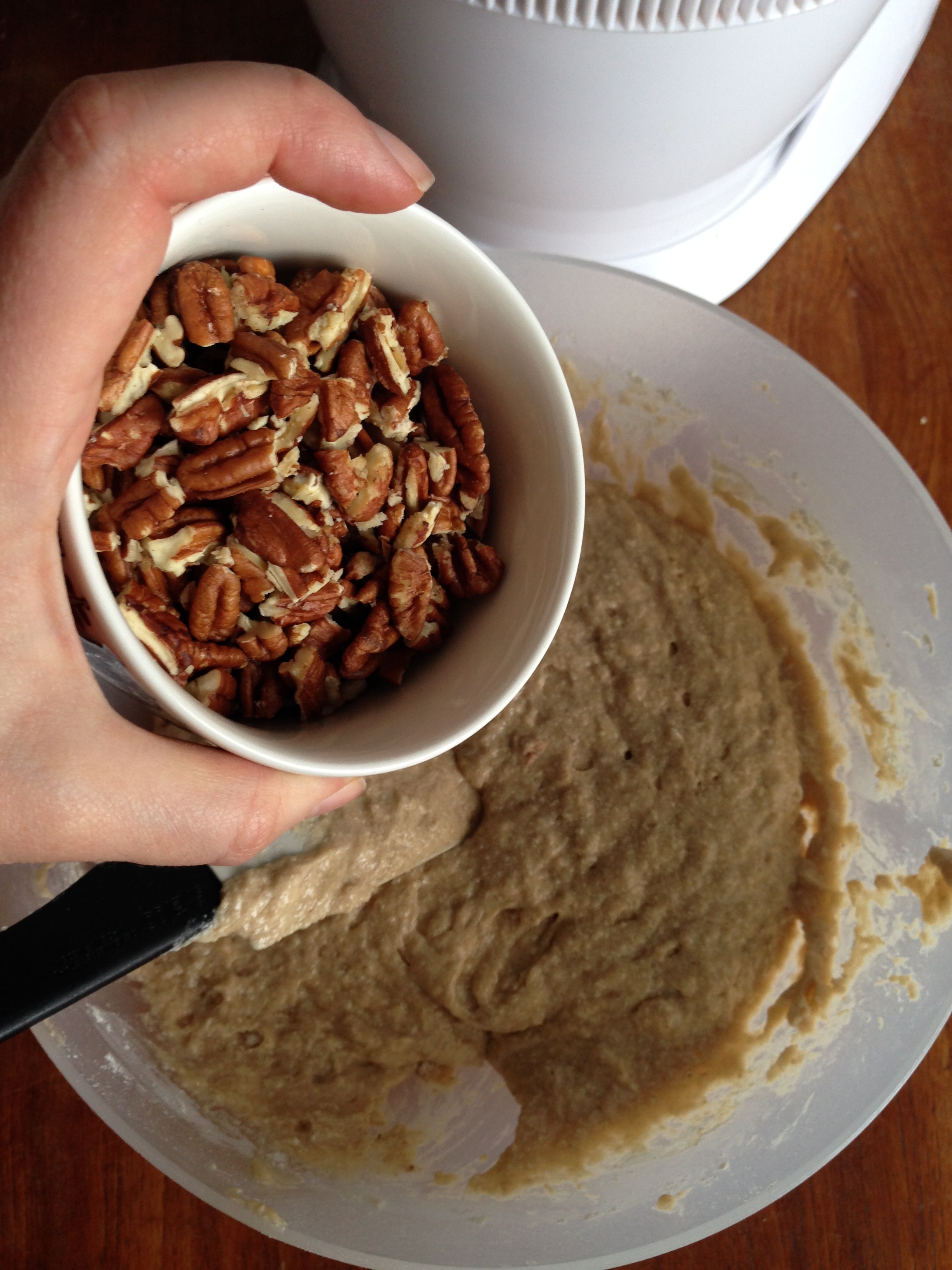 6. To the dry ingredients, add wet batter. Fold in gently. Do not over mix, just fold gently until all the flour is mixed with wet ingredients. Finally add the pecans and fold a bit more.