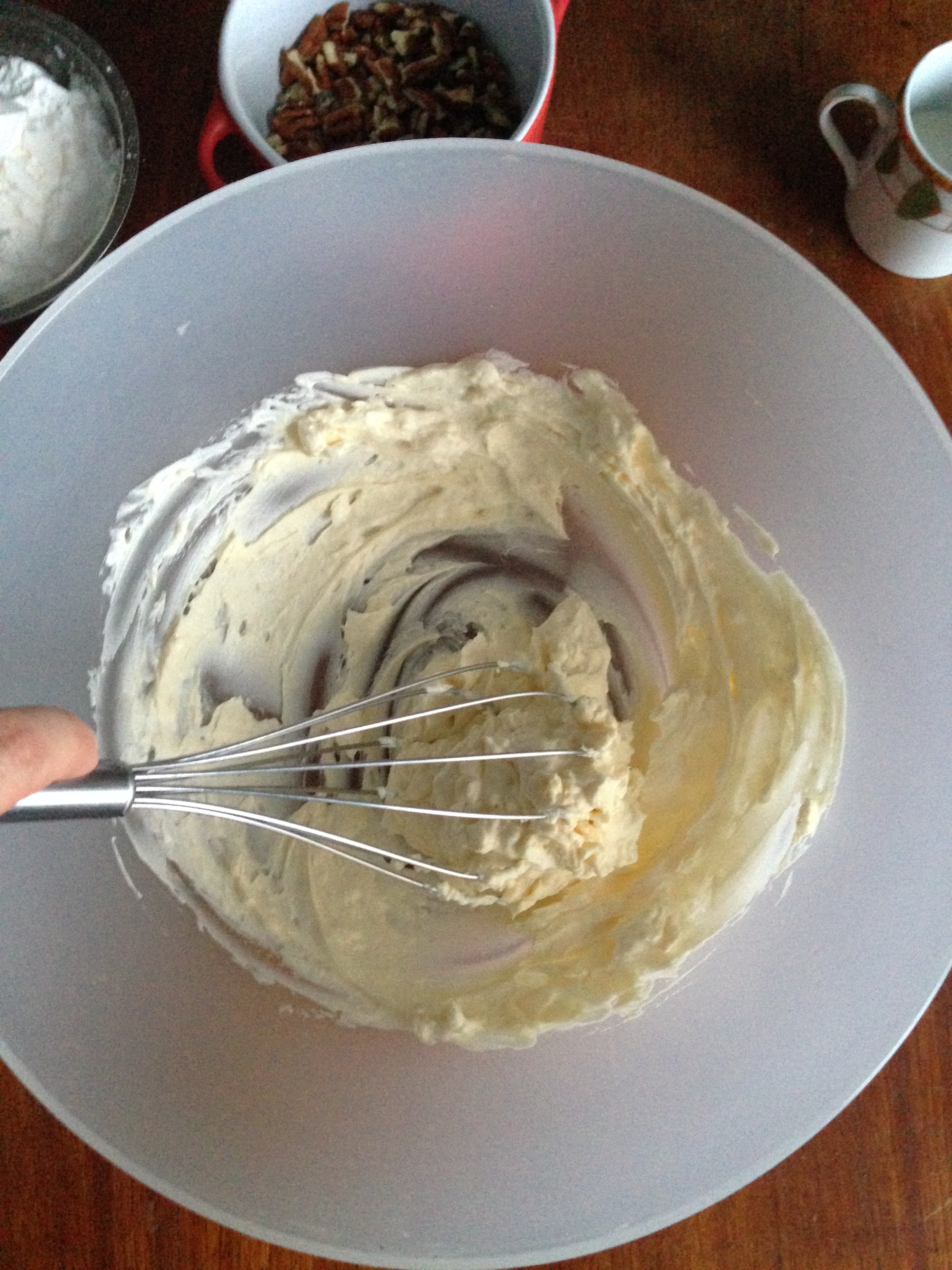 9. When cake is cool, prepare the frosting. In a medium bowl, put cream cheese and butter and whisk them well.