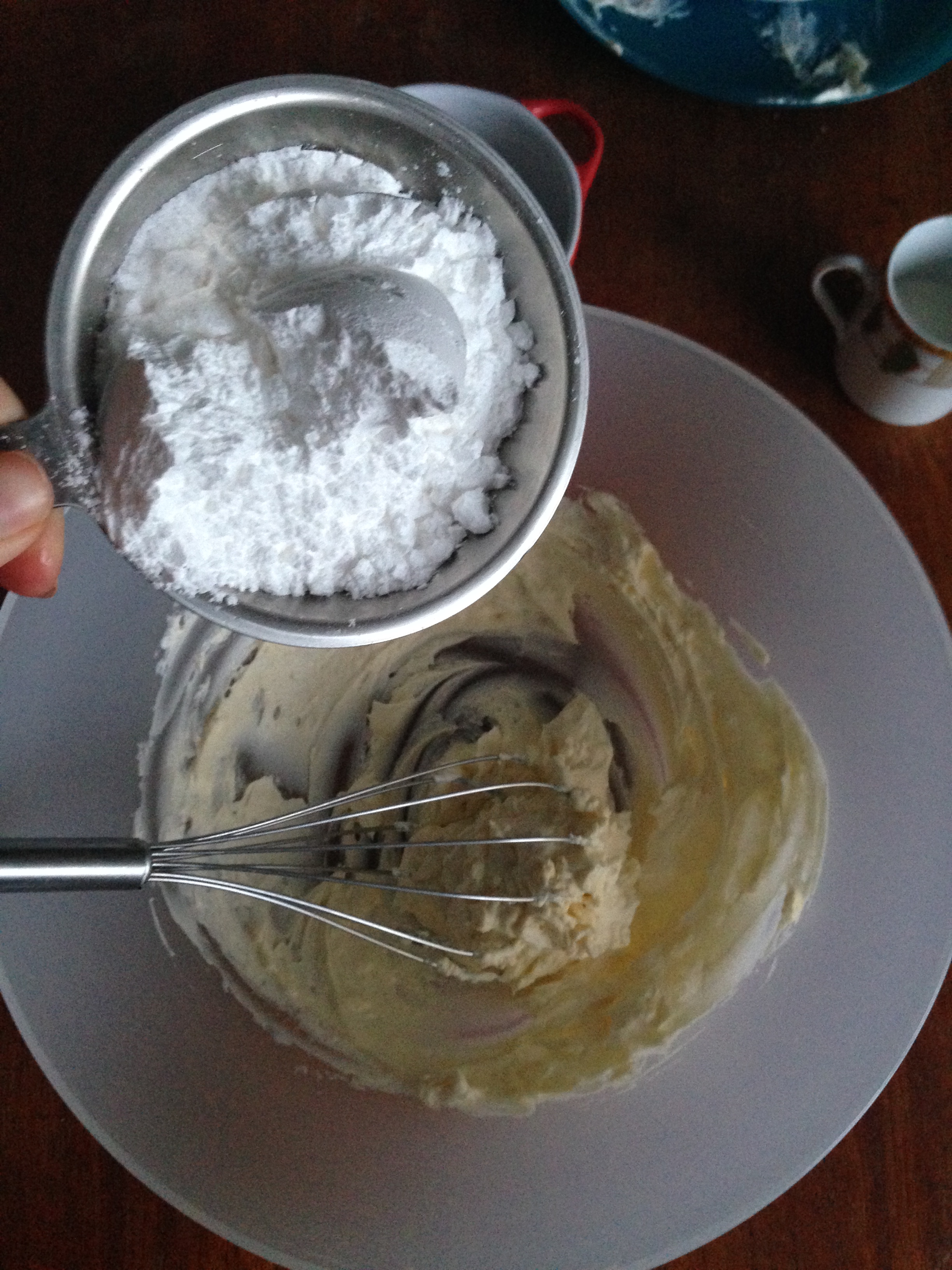 10. Add powdered sugar and continue whisking. Finally, add milk and continue whisking more, until you get a creamy frosting.