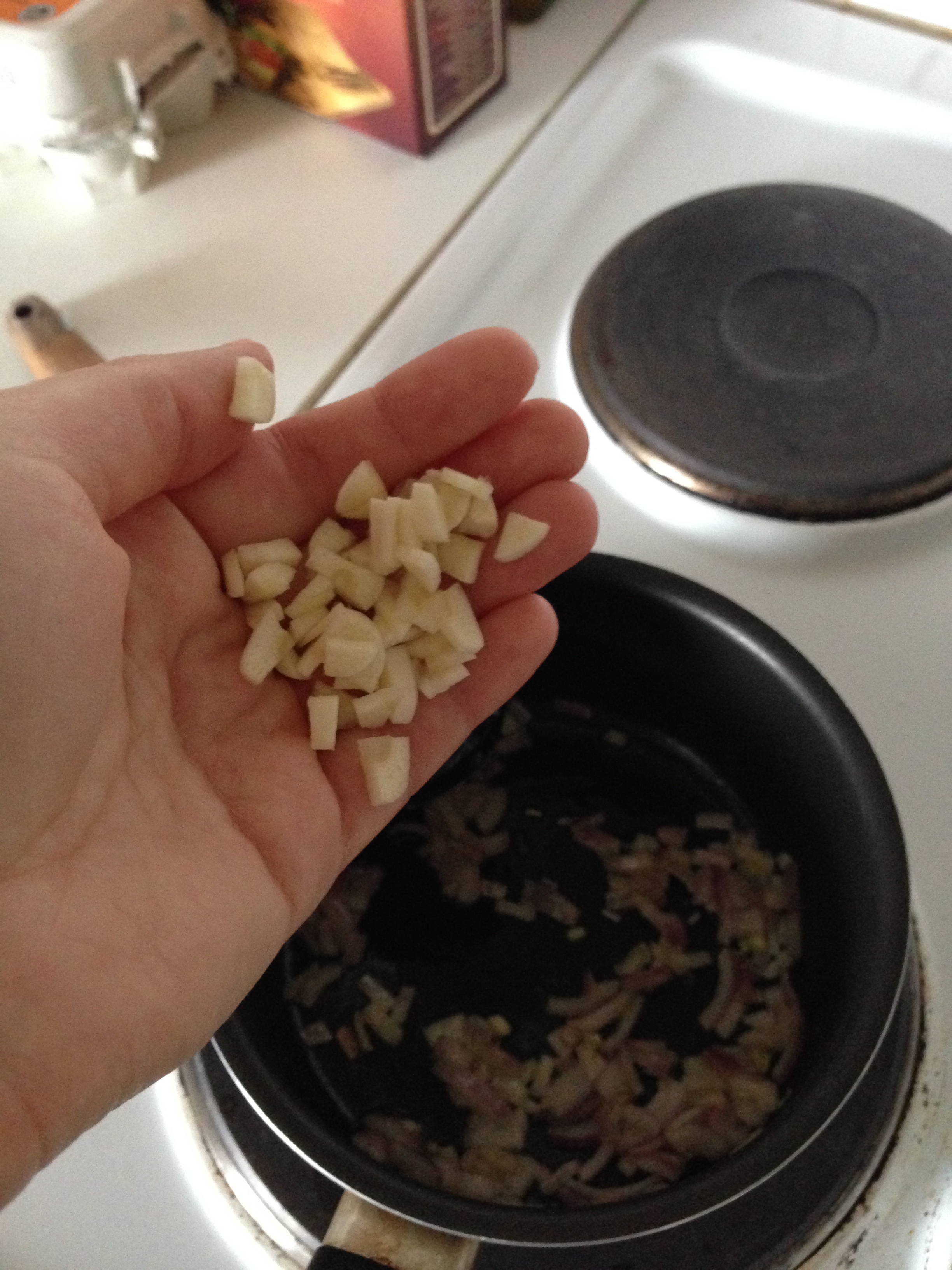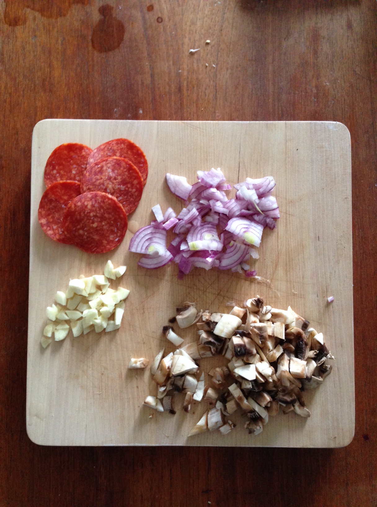 2. Cut onion, garlic clove and mushrooms into small pieces.