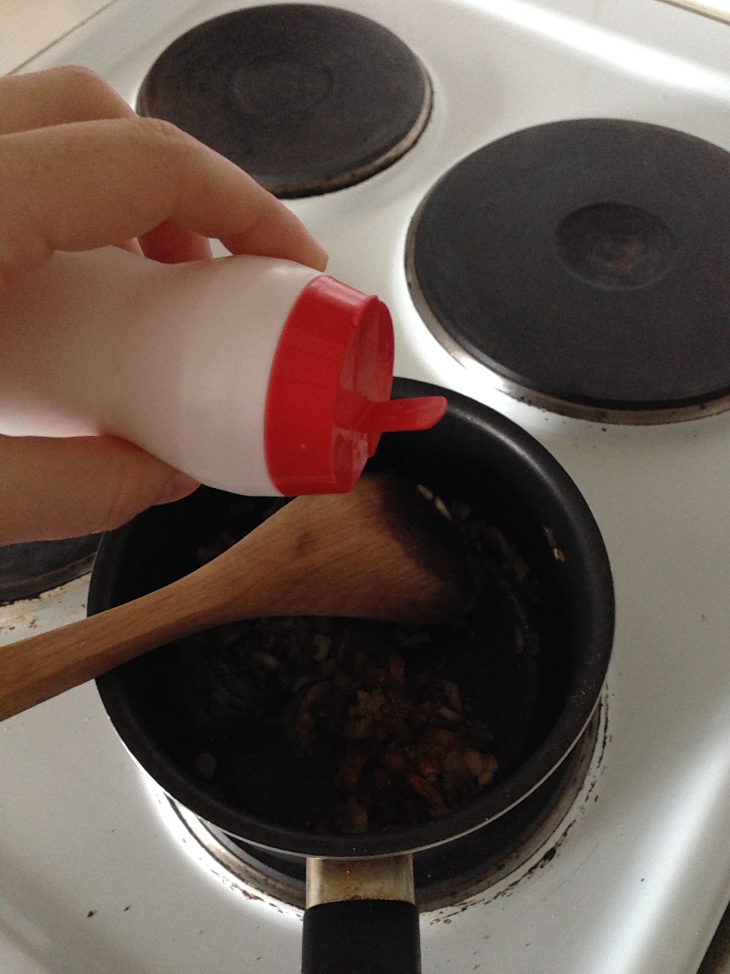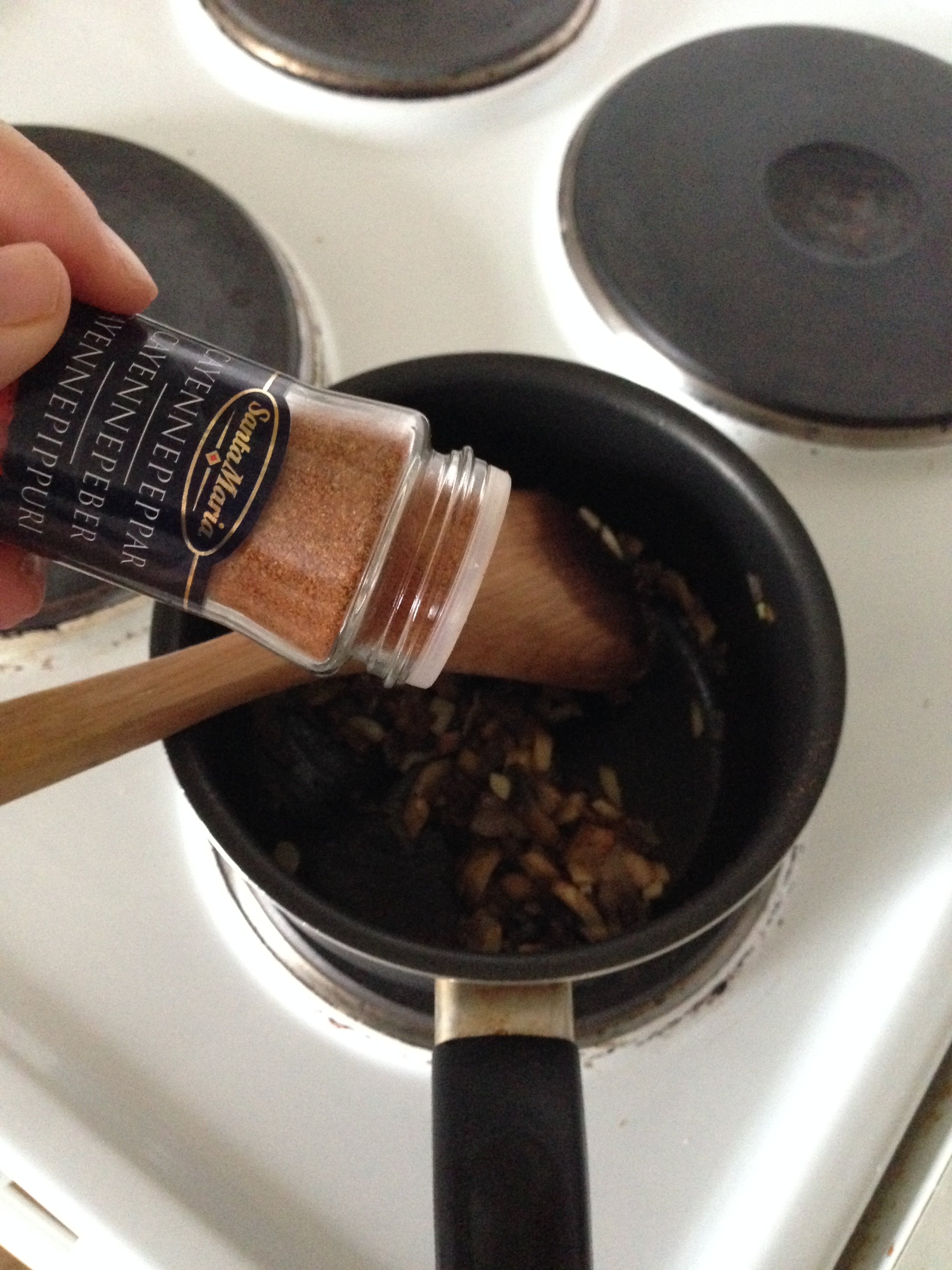 6. Take the pan away from the heat. Add cayenne pepper, cumin, black pepper and salt (all to taste) and stir until they are well distributed.