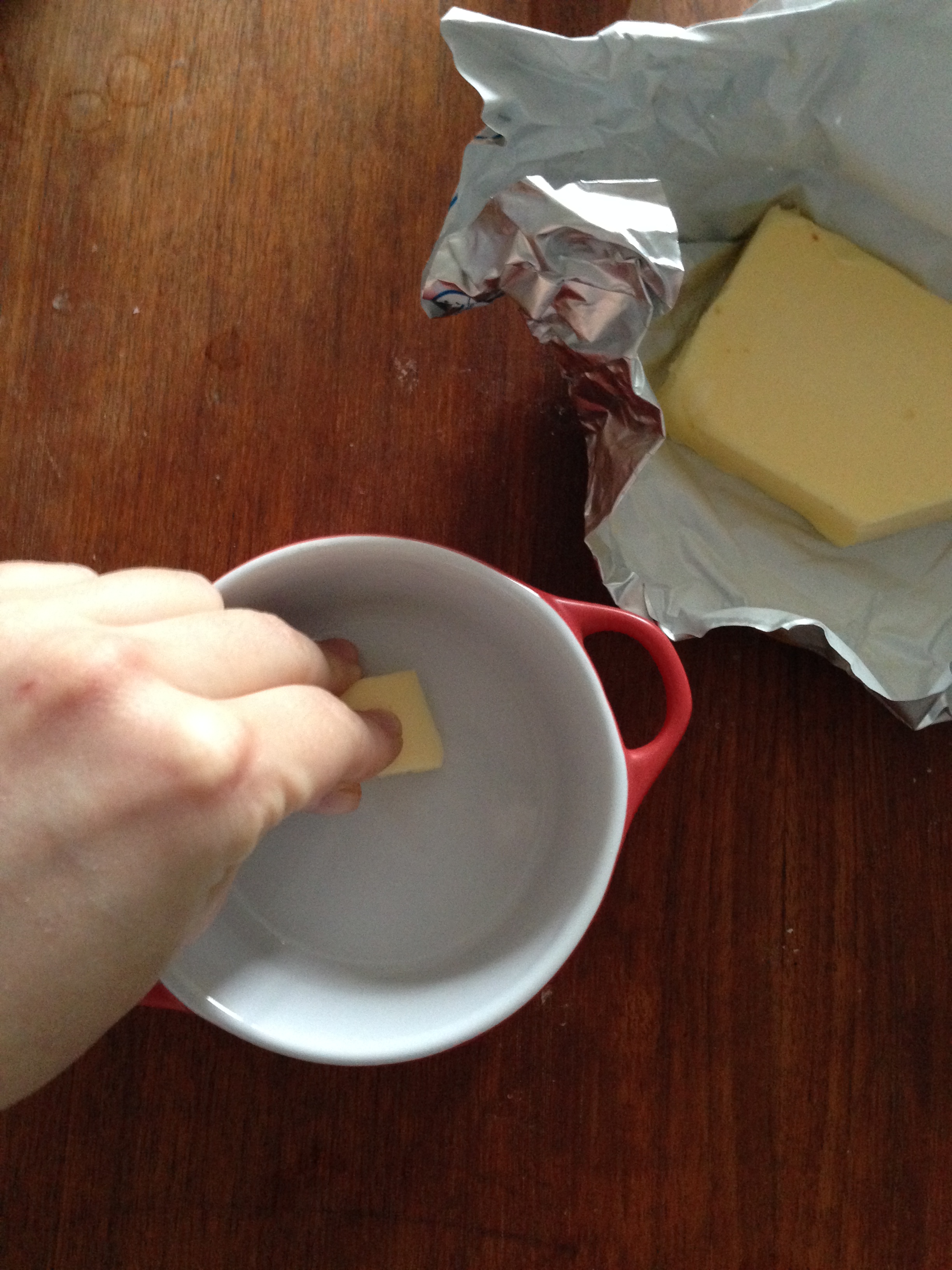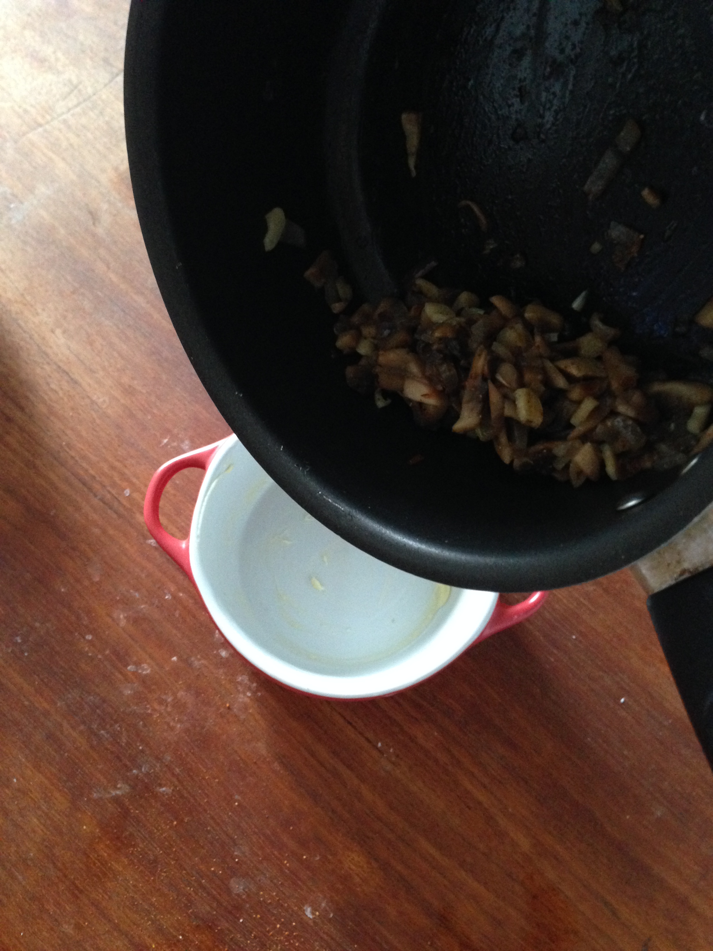 8. Put all the cooked ingredients in the pan inside buttered ramekin.