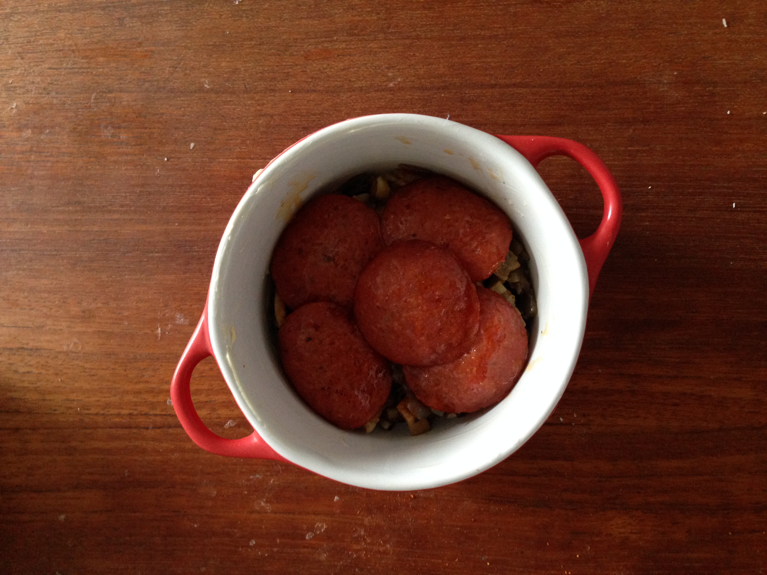 10. Add cooked pepperoni slices on the mushroom mixture inside the ramekin. On top of this, crack 1 egg carefully without destroying the yolk. If you are not confident with cracking the egg, do it in another bowl and transfer the cracked egg carefully on to the ramekin. Add mozzarella pieces and put a dash of black pepper to finish.