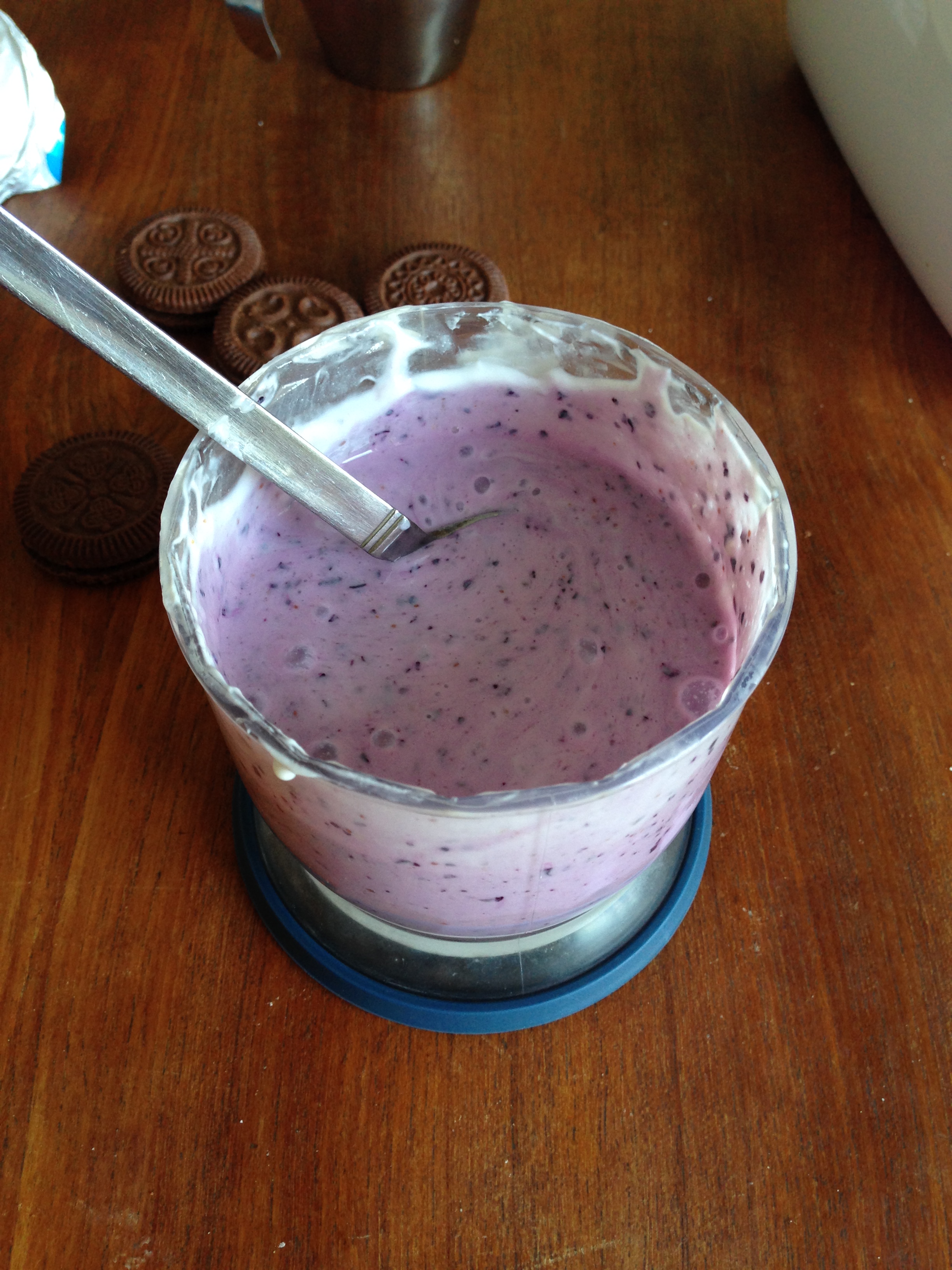 1. In a blender or a food processor, put quark, blueberries and sugar. Mix them until they are incorporated (you do not have to make it too smooth, the blueberries are nice to feel a bit).