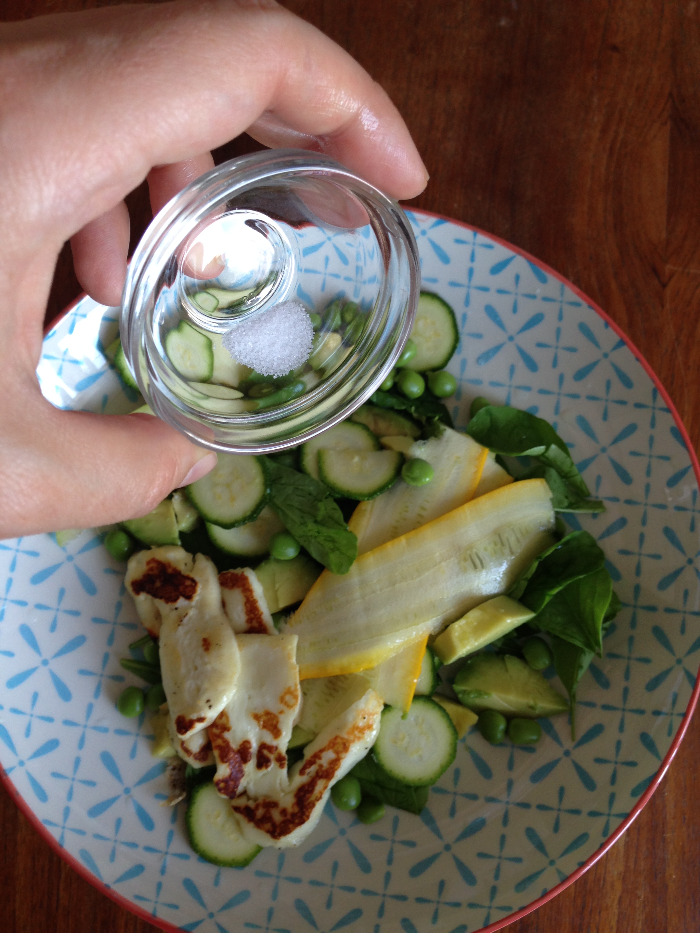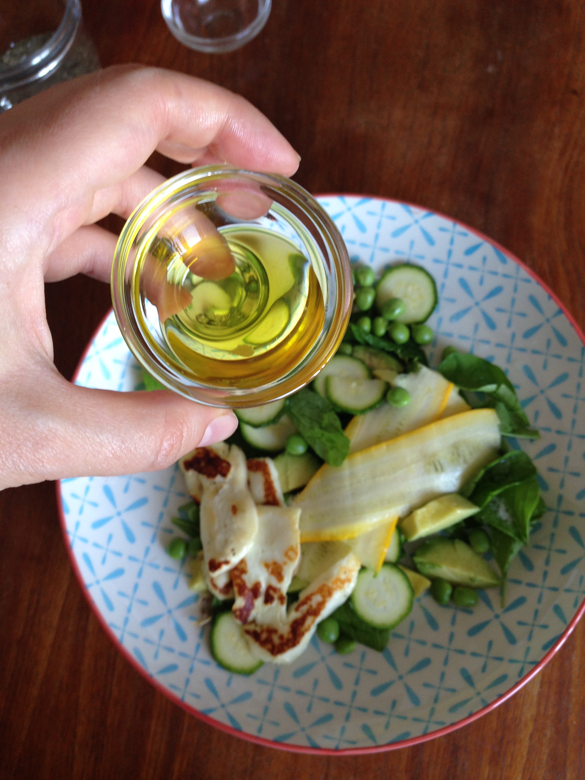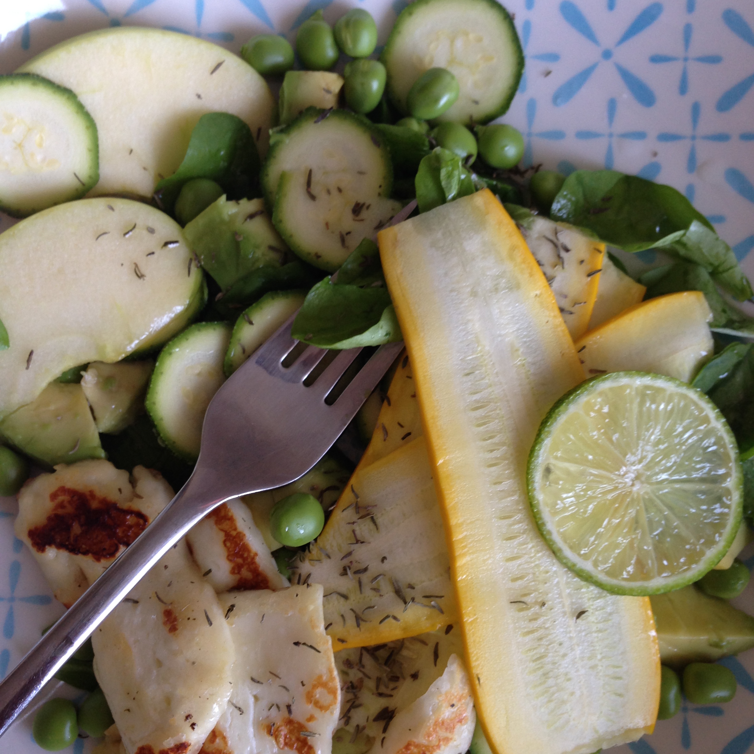 3. Arrange rucola, green and yellow zucchini, fresh peas, apple, avocado and halloumi in the way you like.