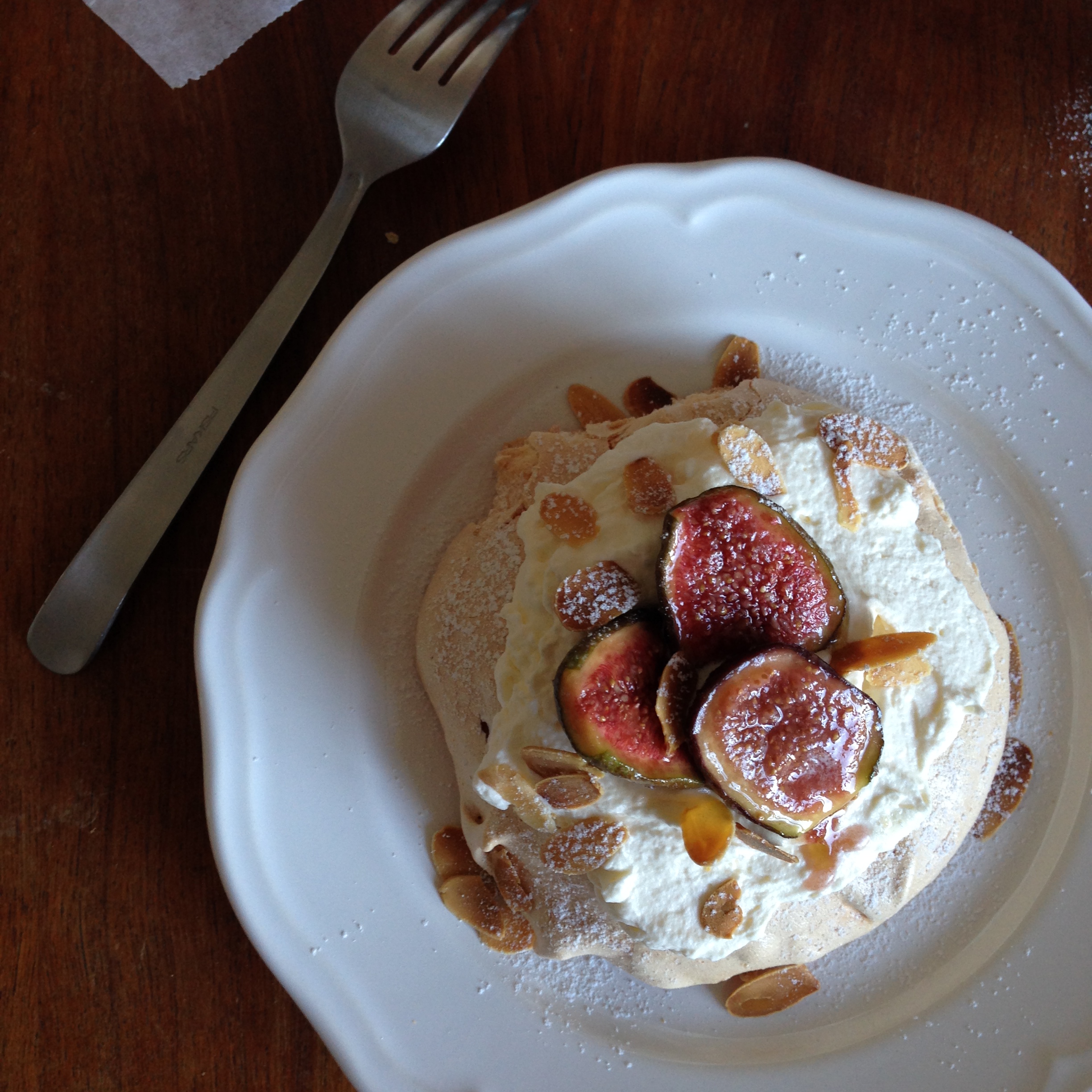 11. When the cake is completely cool and out of the oven, assemble the cake. On each cake, put about a spoonful of cream, the topping of your choice (I put caramelised figs), some powdered sugar and roasted slivered almonds. Alternatively, you can put some fresh fruits, some sauce, or a combination of a few different toppings. Bon ap!