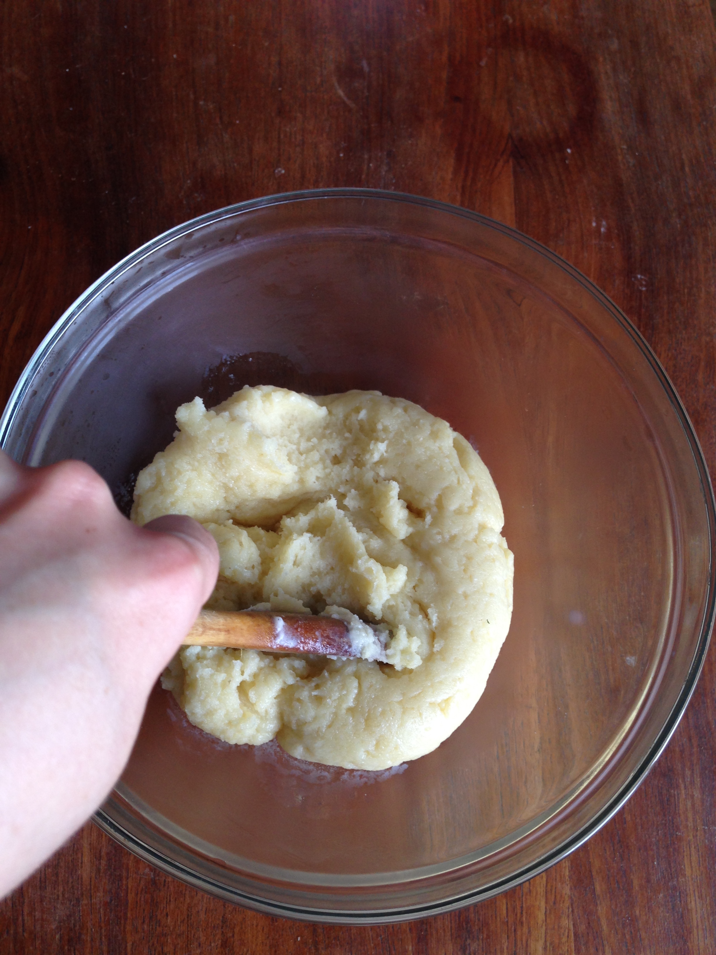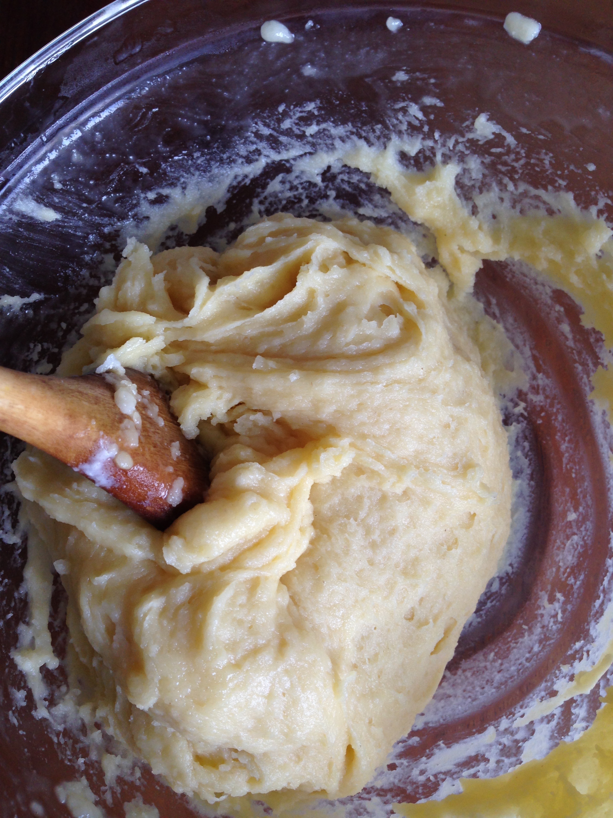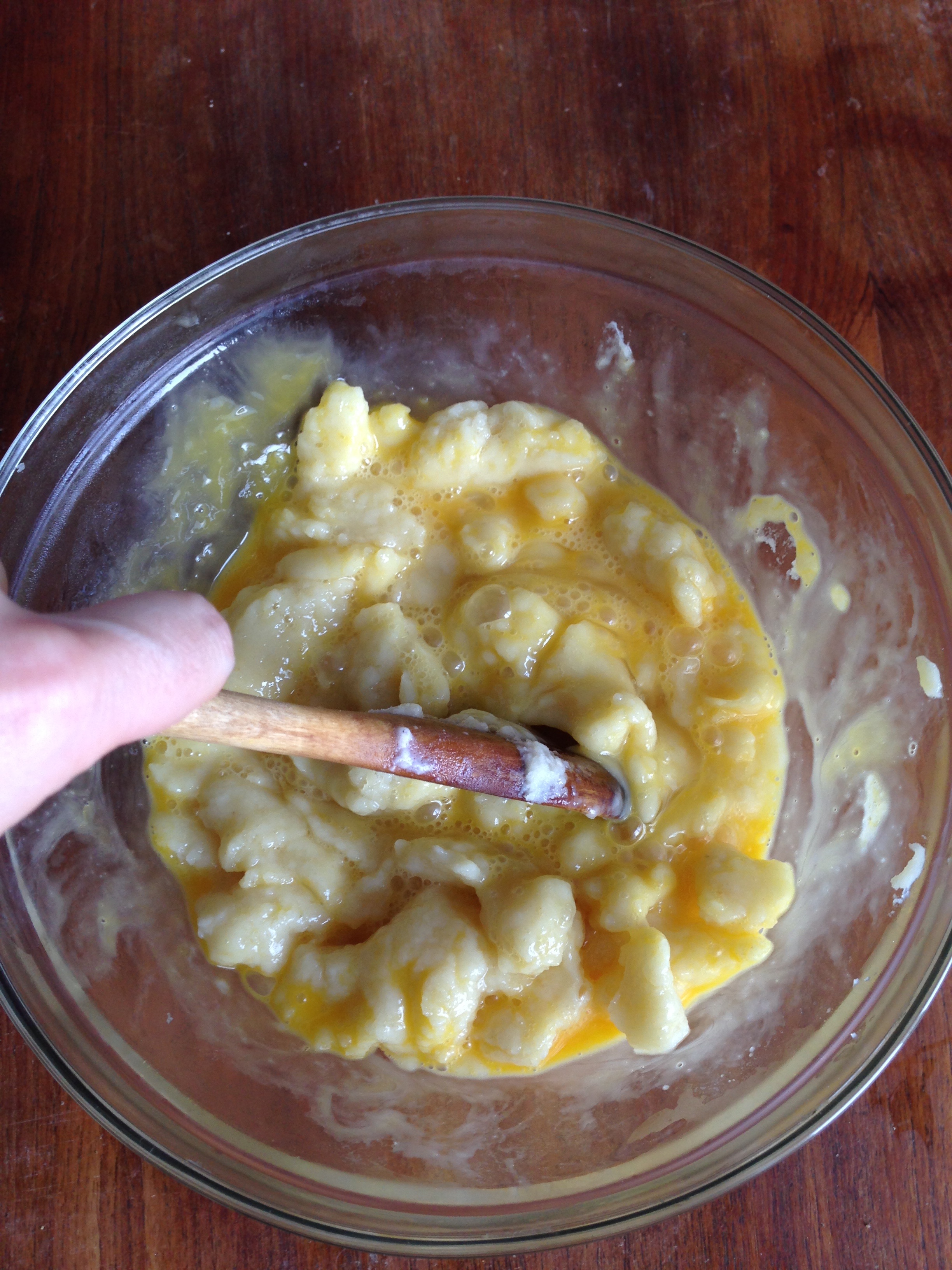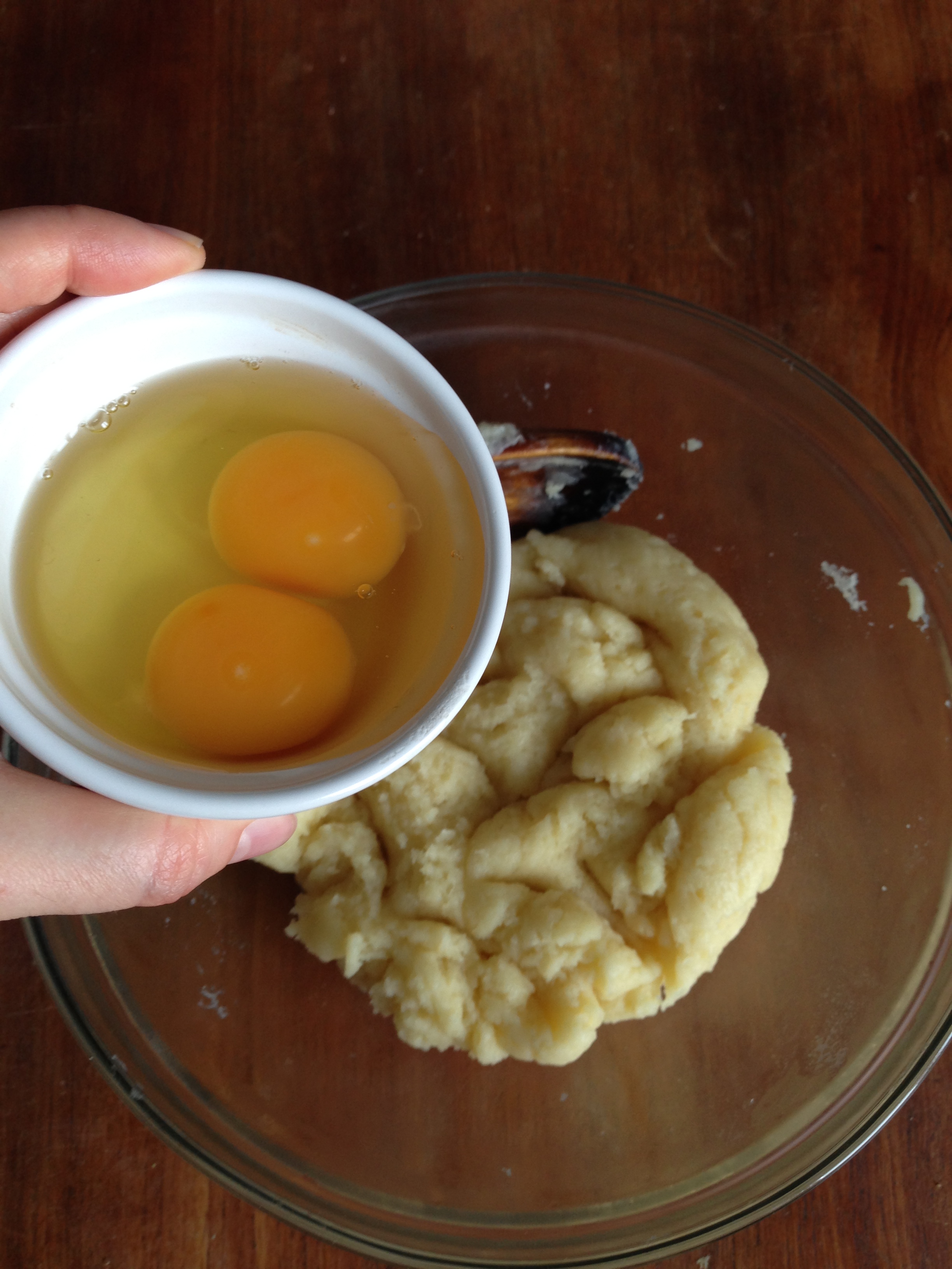 5. Transfer cooked flour into a heat-proof bowl and continue stirring with a wooden spoon to cool it down. Then add the eggs and immediately continue stirring (if not, the heat of the flour will cook the eggs). Continue stirring until you have a smooth batter.