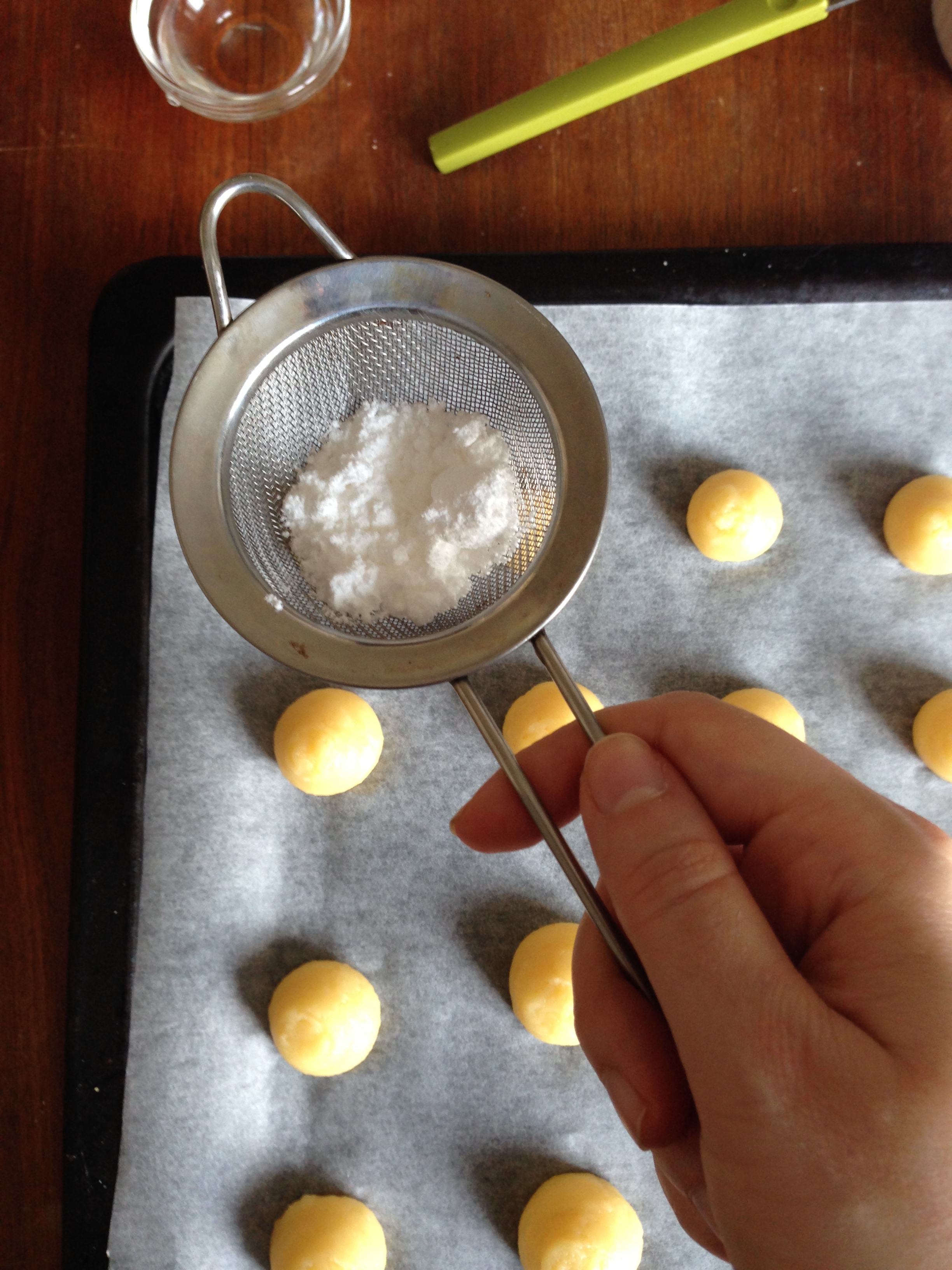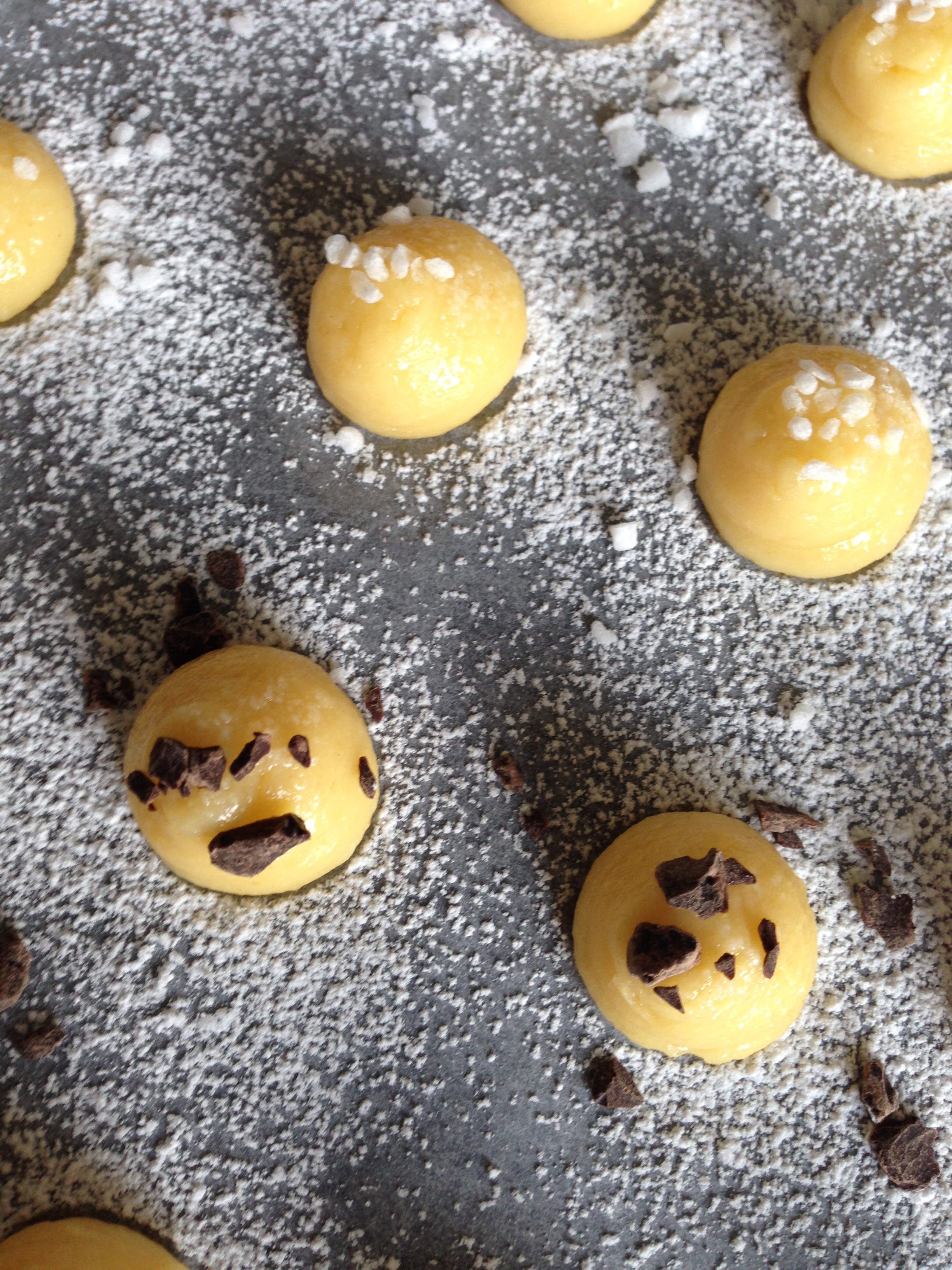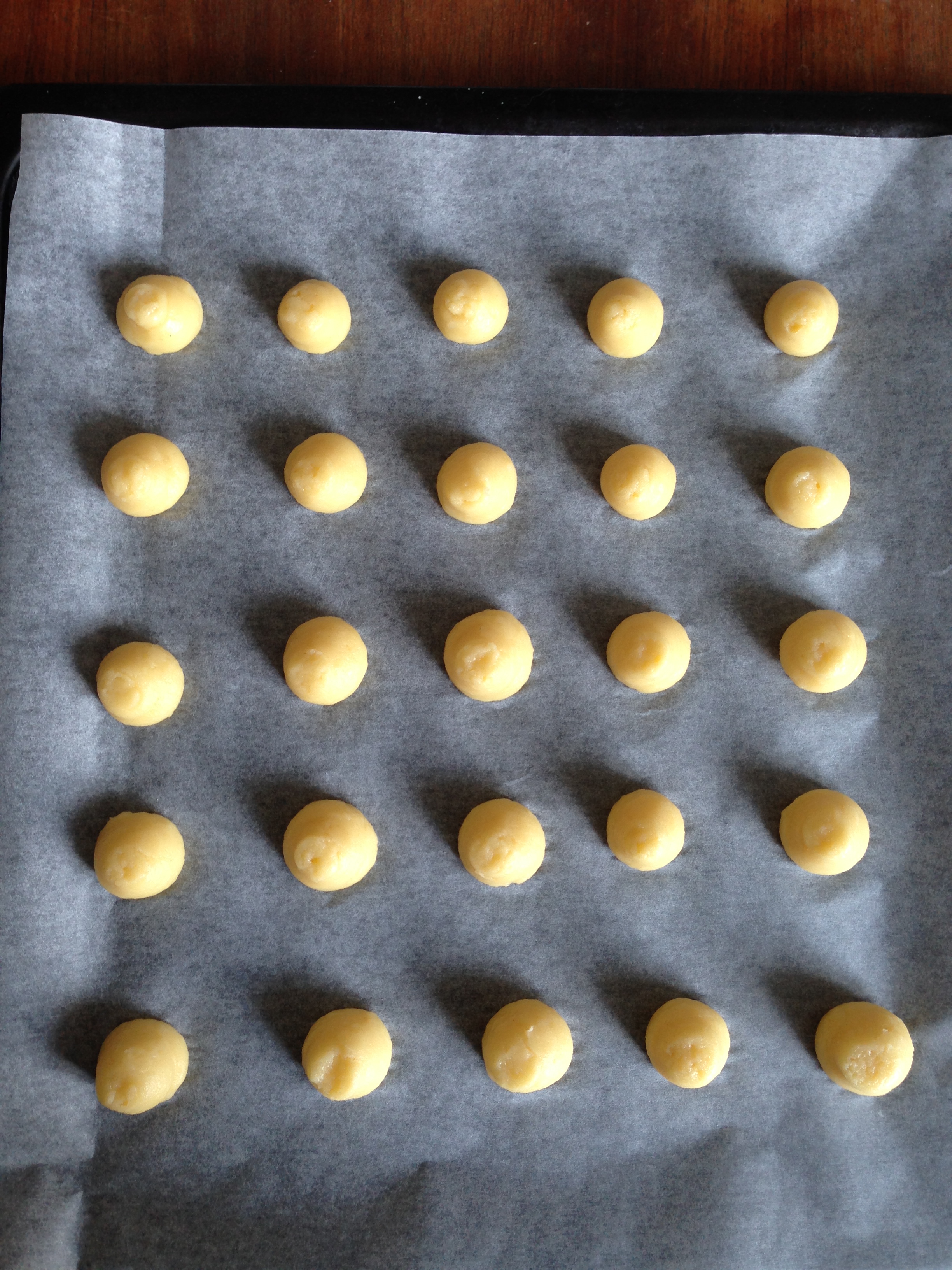 6. Transfer the batter to a piping bag with about 1 cm round nozzle. Pipe equal size balls onto an oven tray with baking sheet. My balls were about 1.5/2 cm in diameter but you can make them bigger.