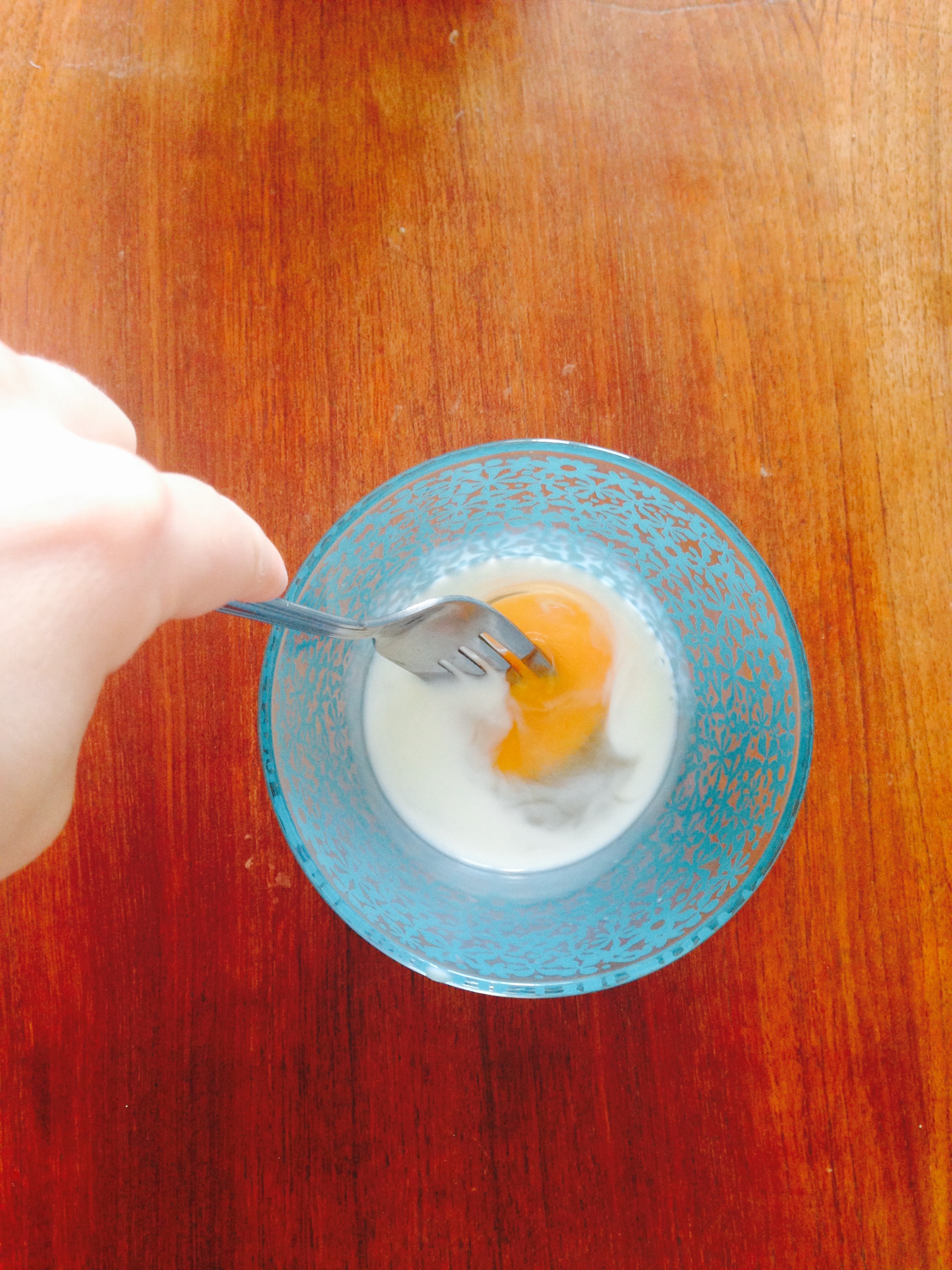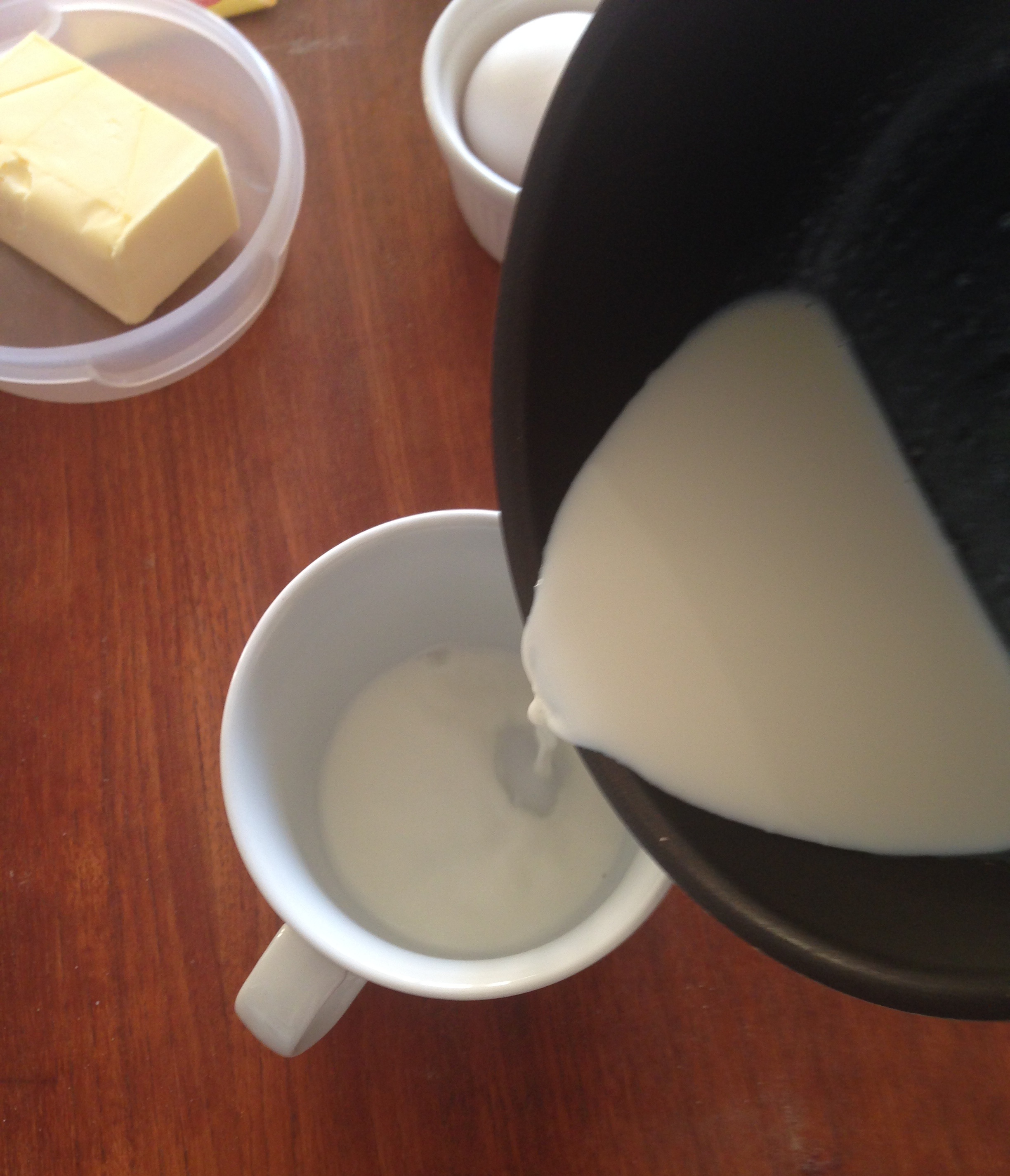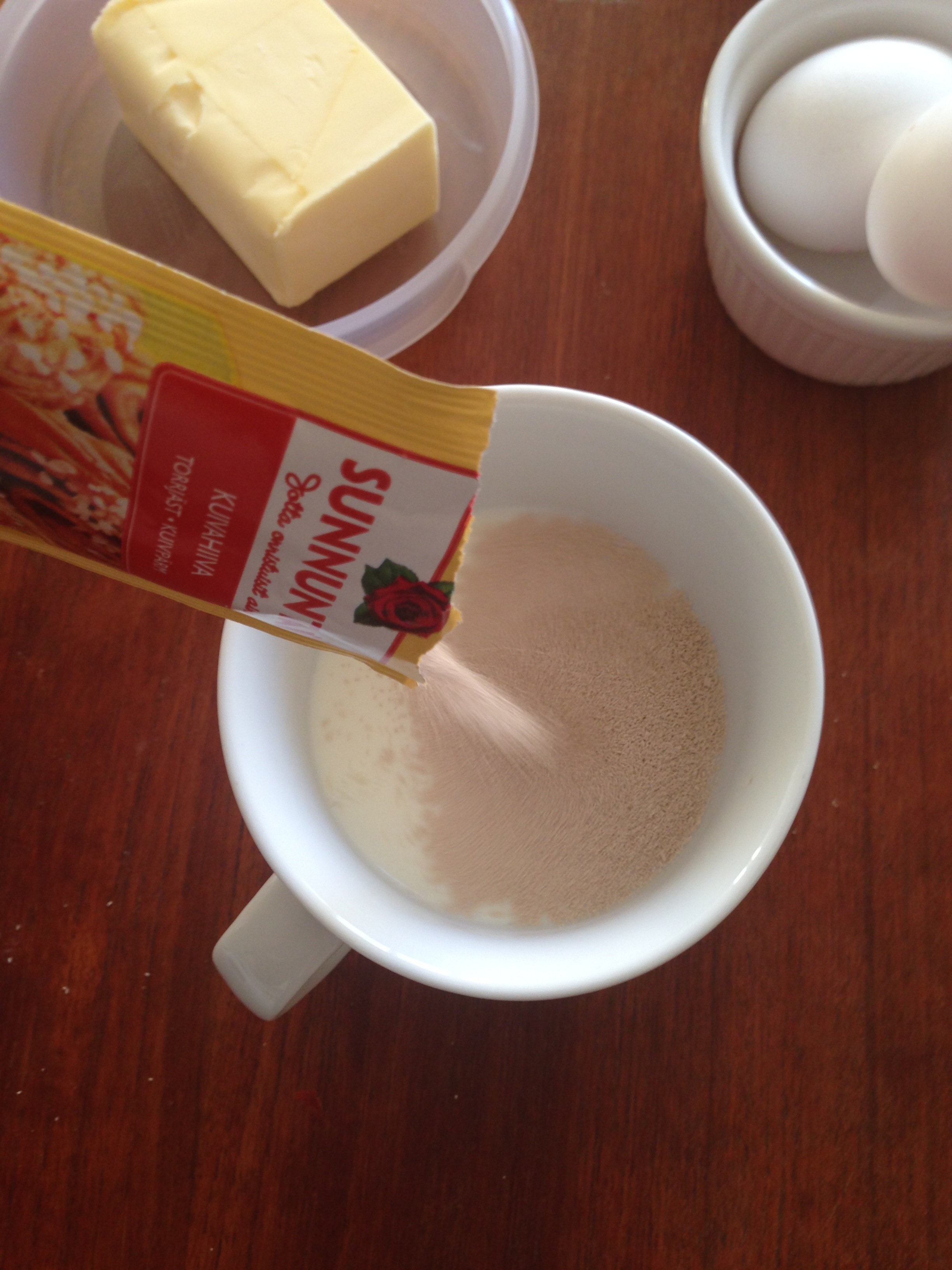 1. Put 3/4 cup / 1.8 dl milk in a pan and heat it until it’s lukewarm, about 45C with a thermometer. When it’s warm enough, pour it in a bowl. The remaining 1 tbsp / 15 ml of milk, leave aside for the moment.