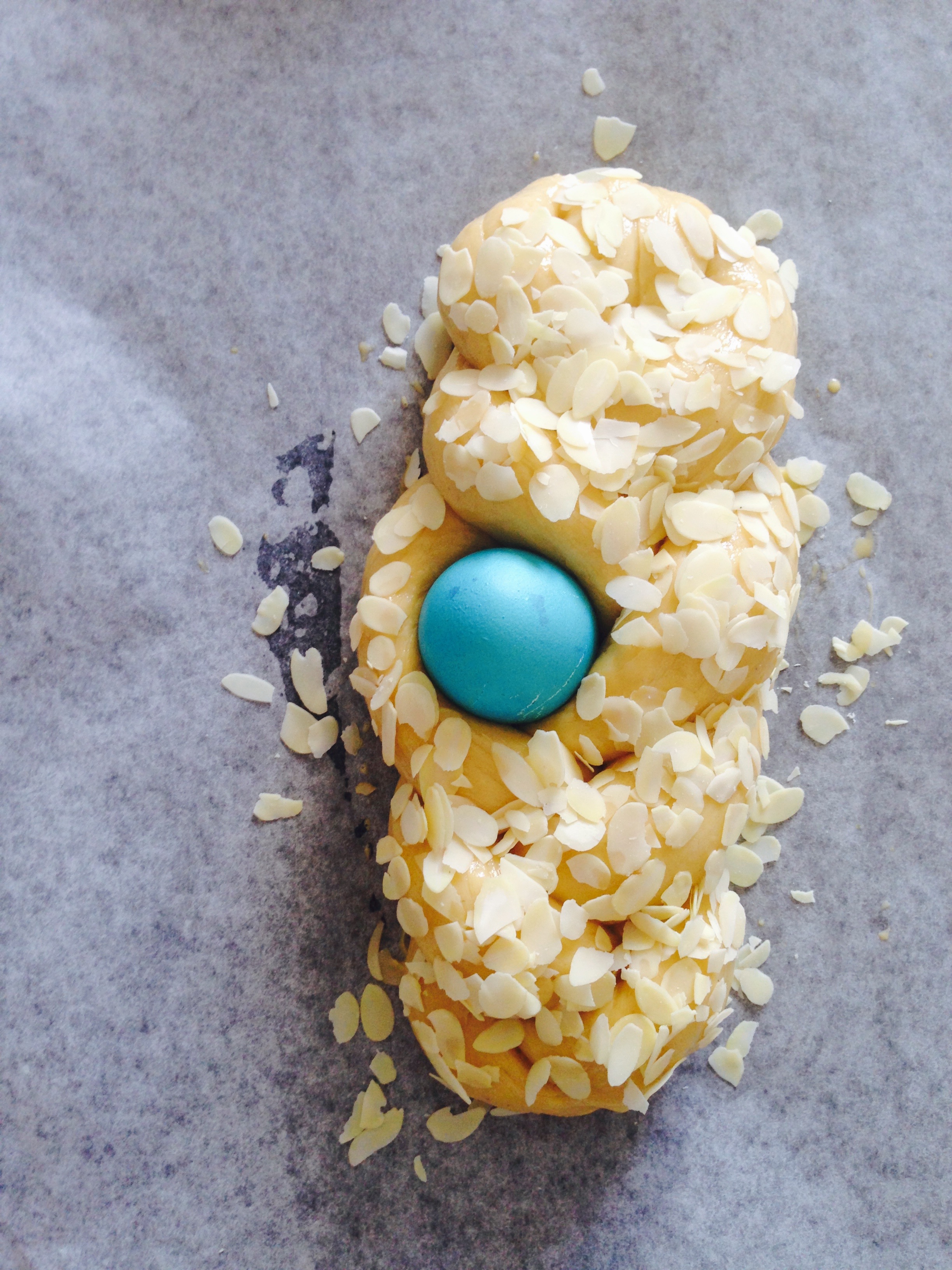 14. Brush egg yolk / milk mixture on the surface of the braid. Add sliced almonds on the surface.