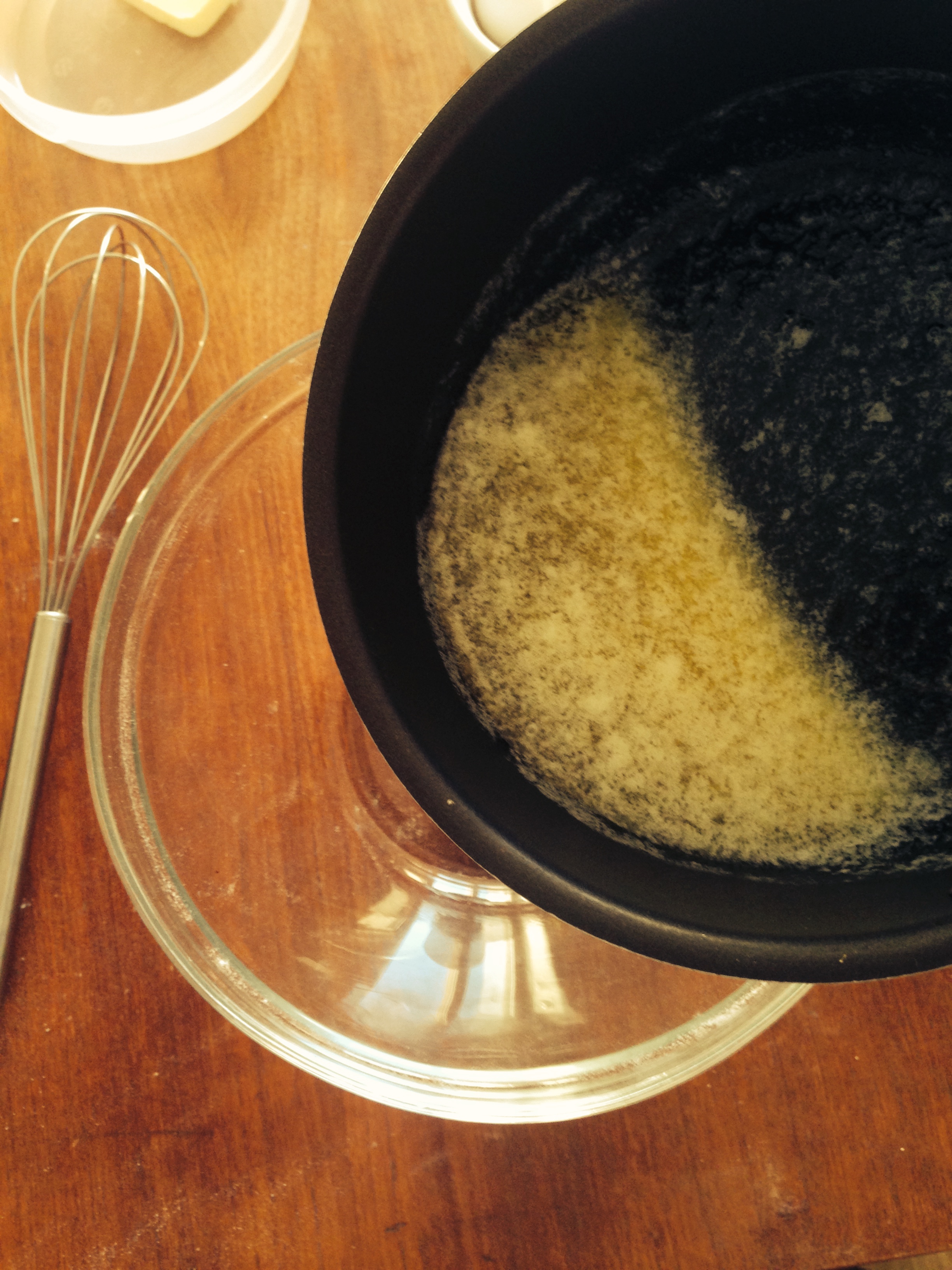 4. In a pan, melt 100 gr of the butter, leave 15 gr aside. When butter melts, pour it into a mixing bowl and let it cool for a little while.